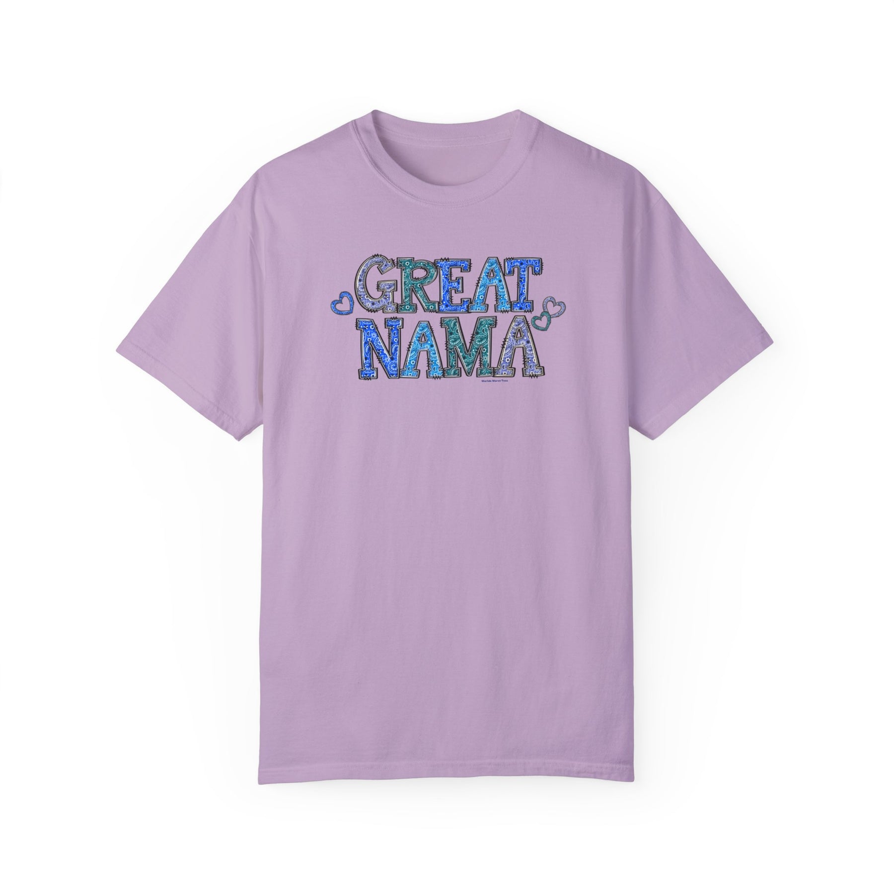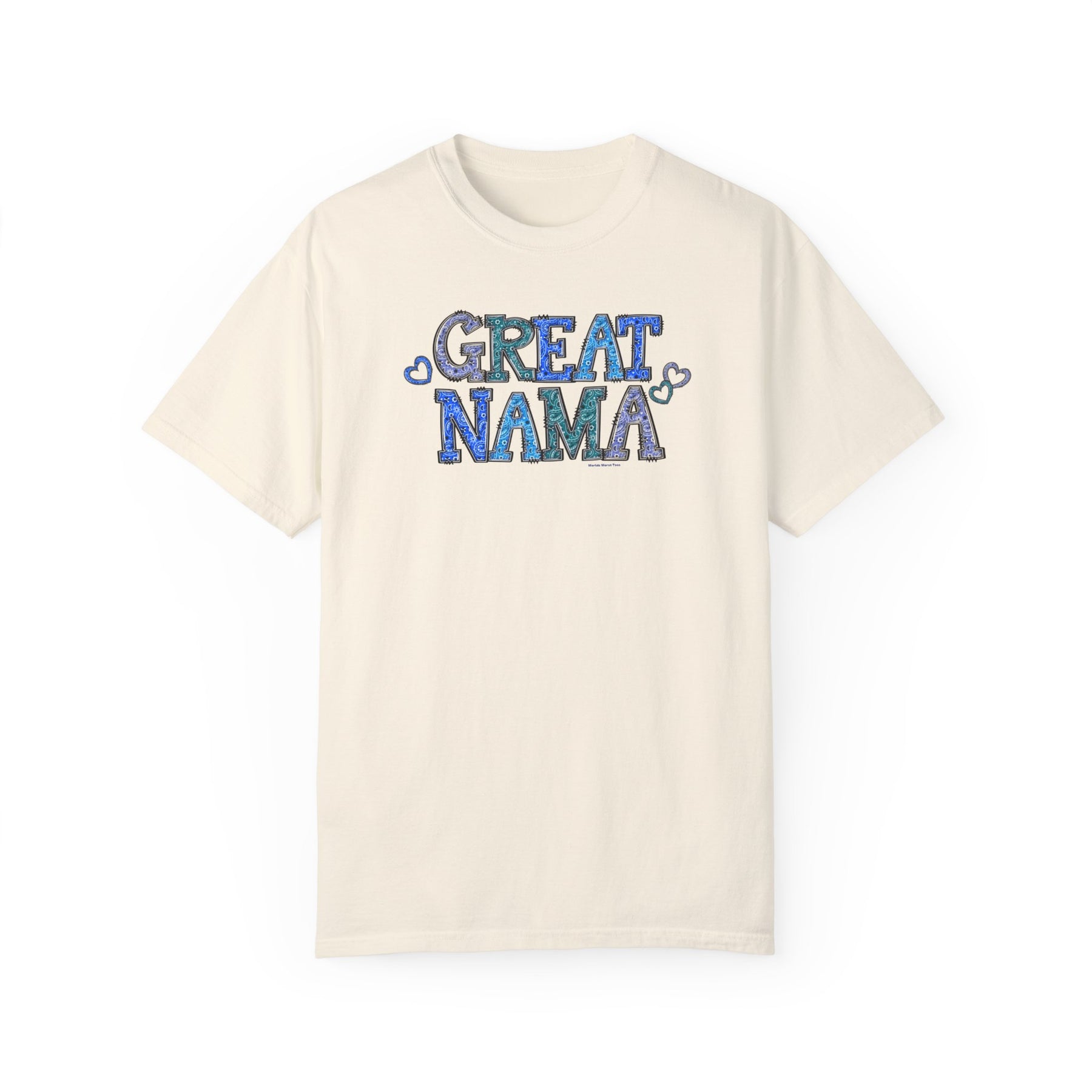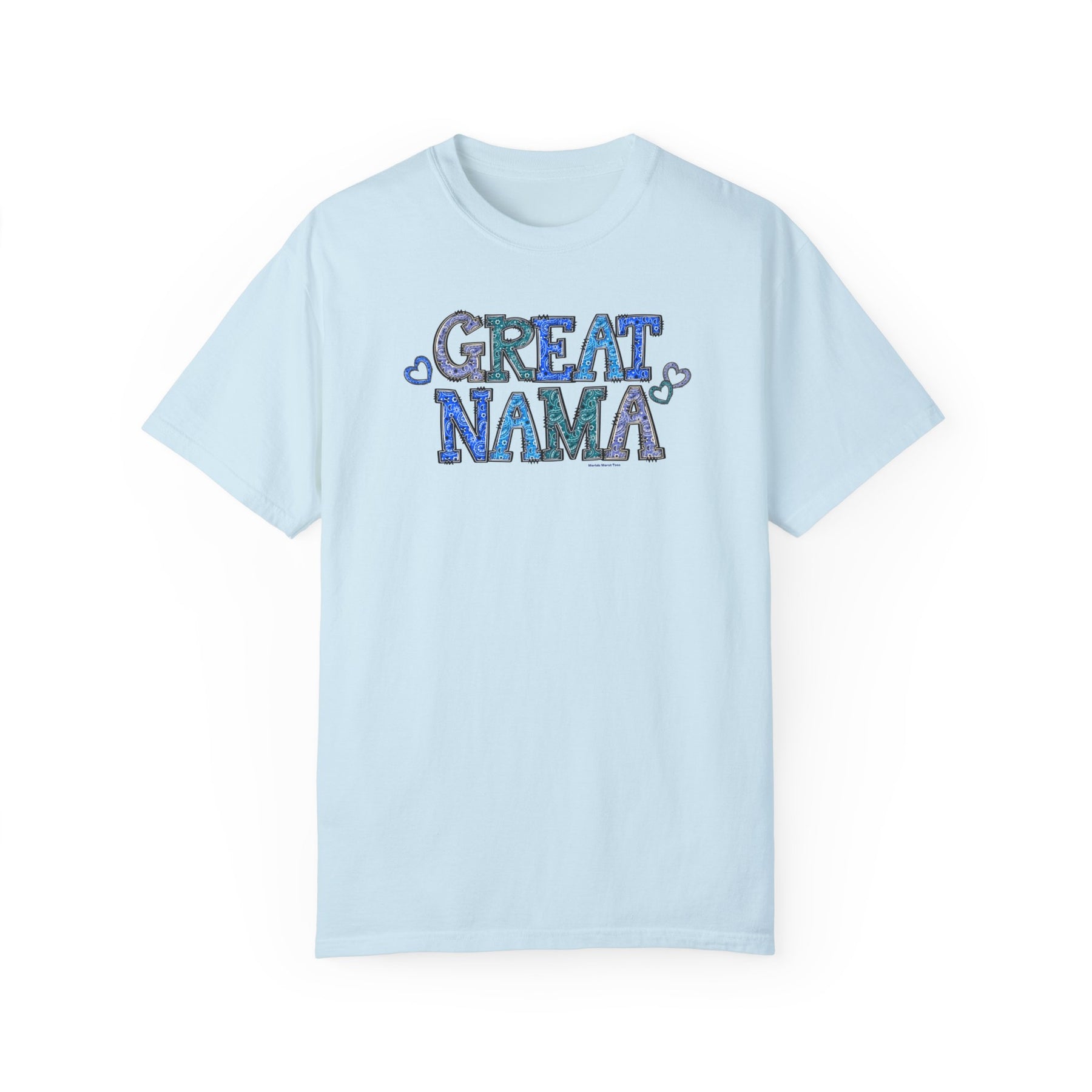 Great Nama Tee: Light blue t-shirt with text. 100% ring-spun cotton, garment-dyed for coziness. Relaxed fit, double-needle stitching for durability, no side-seams for shape retention.