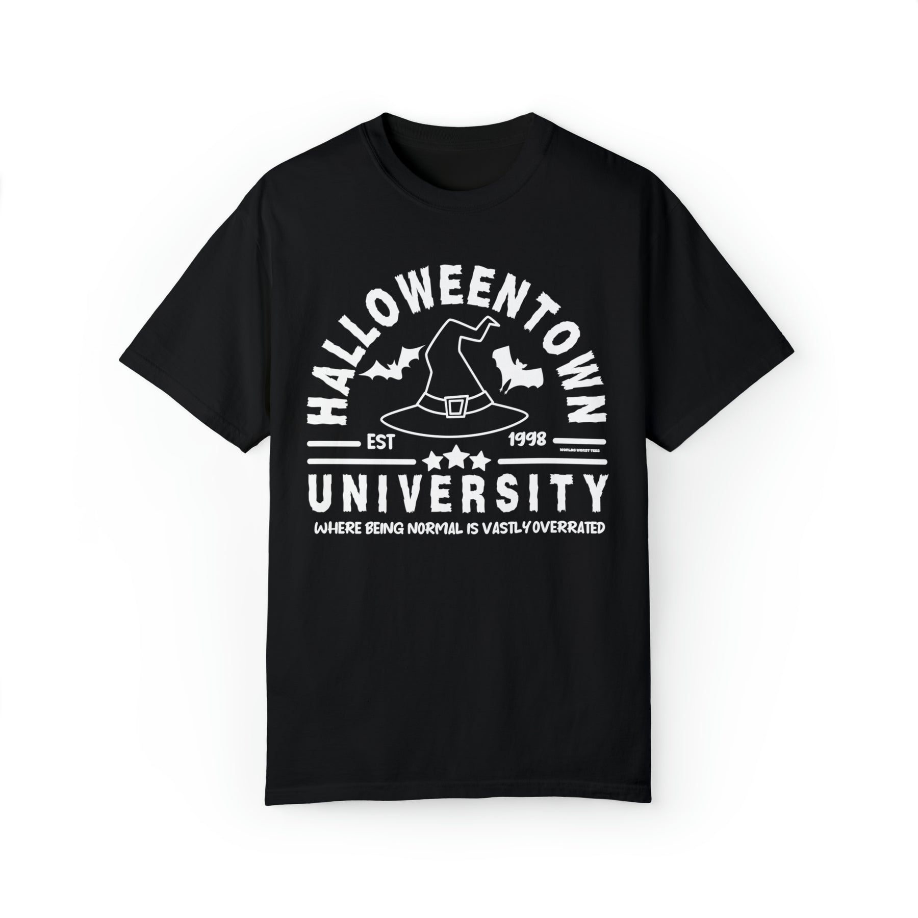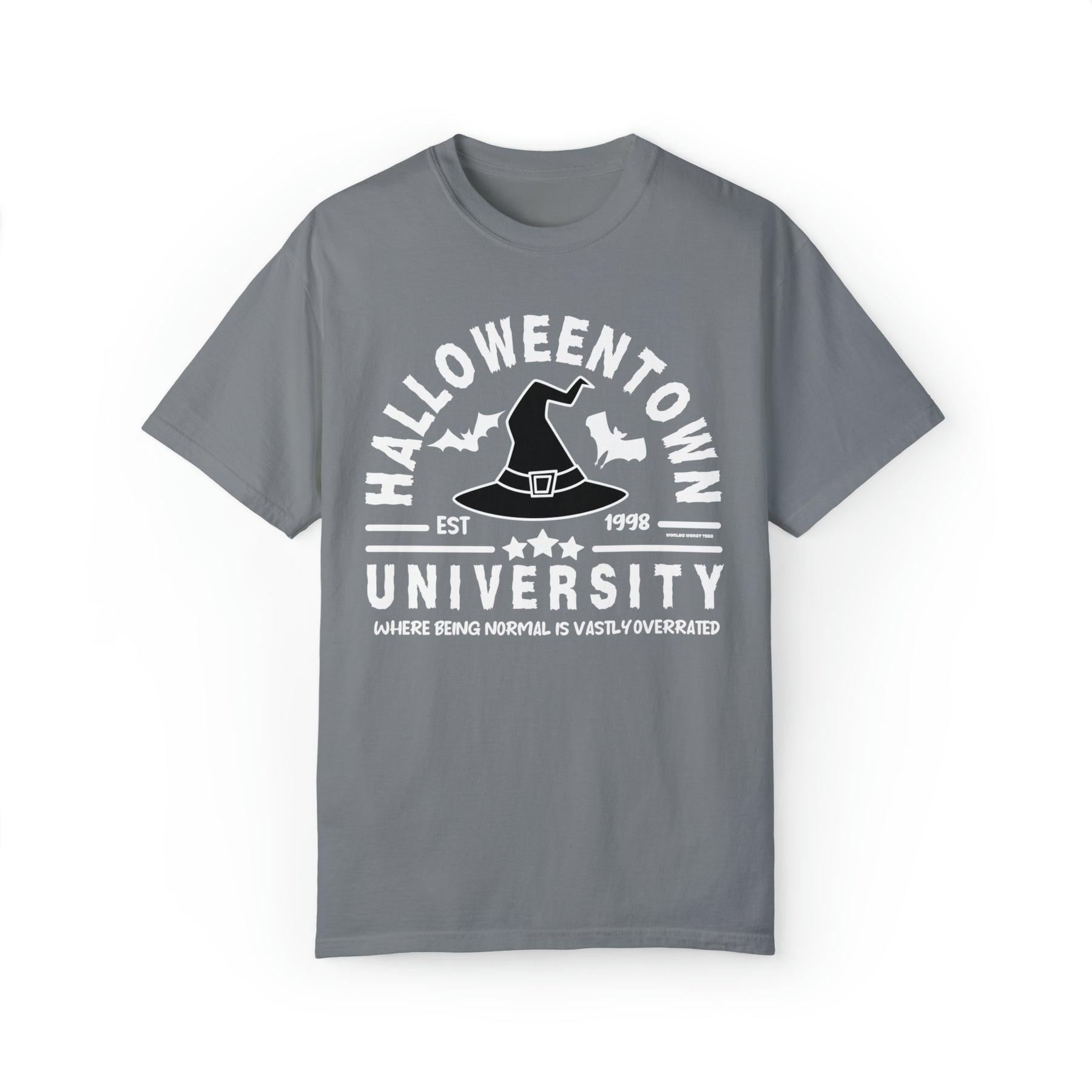 Unisex Halloweentown University Tee, garment-dyed sweatshirt with 80% ring-spun cotton, 20% polyester. Relaxed fit, rolled-forward shoulder, back neck patch. Medium-heavy fabric. Sizes S to 4XL.