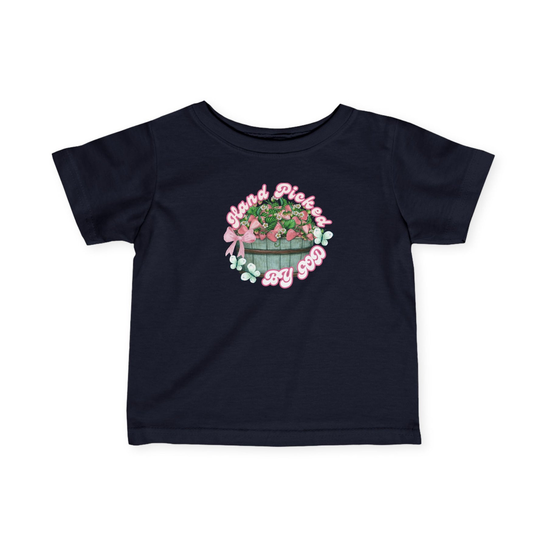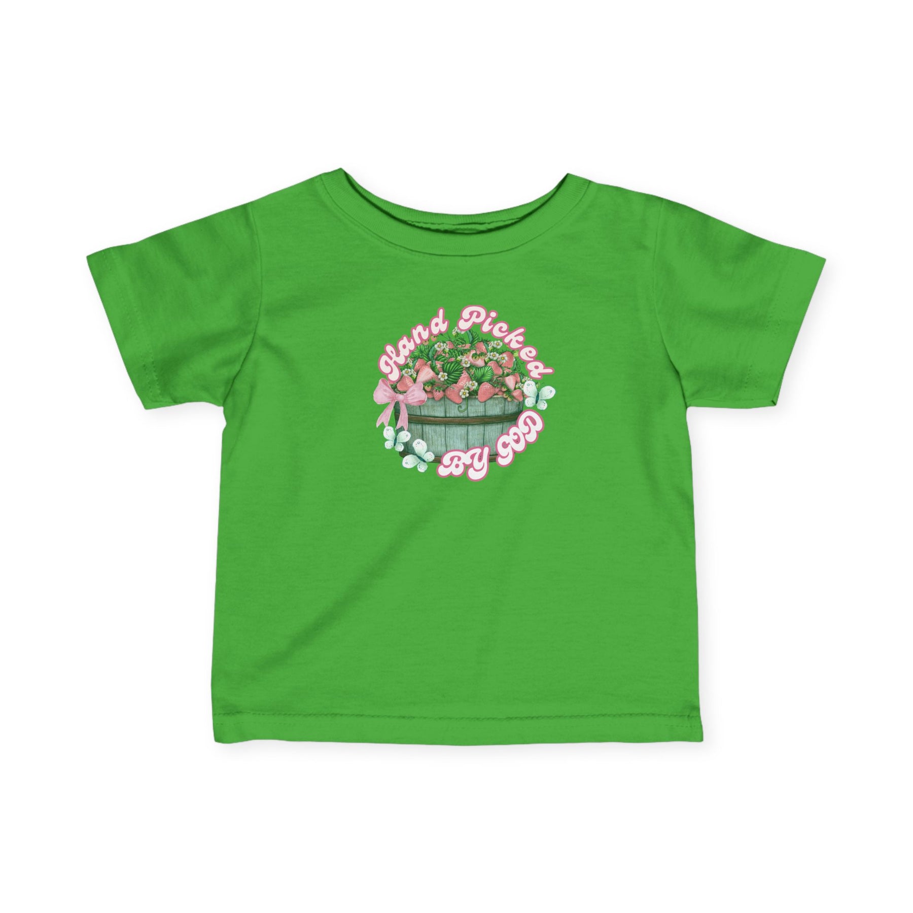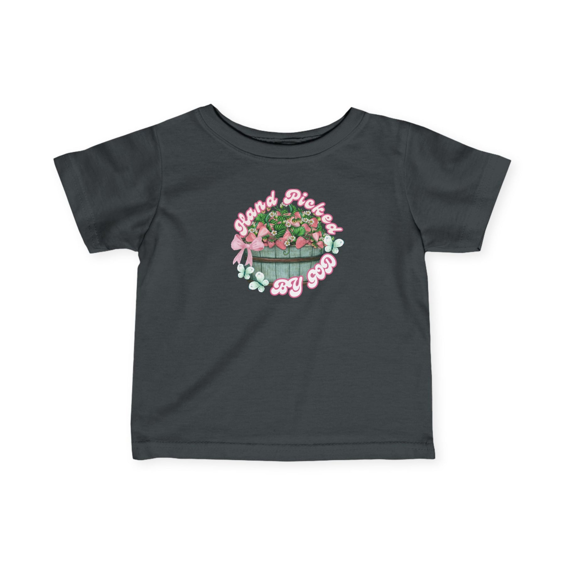 Hand Picked by GOD Baby Tee, a durable, soft infant jersey with ribbed knitting, side seams, and taped shoulders, providing comfort and a classic fit for toddlers.