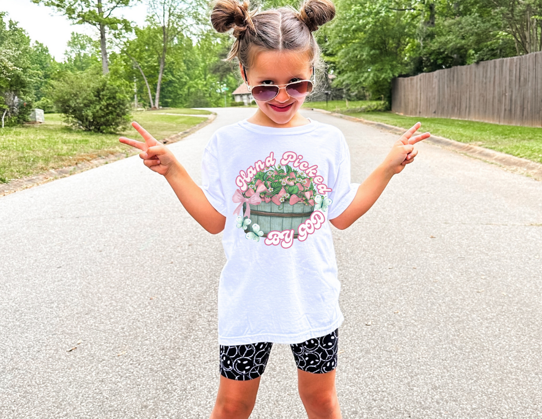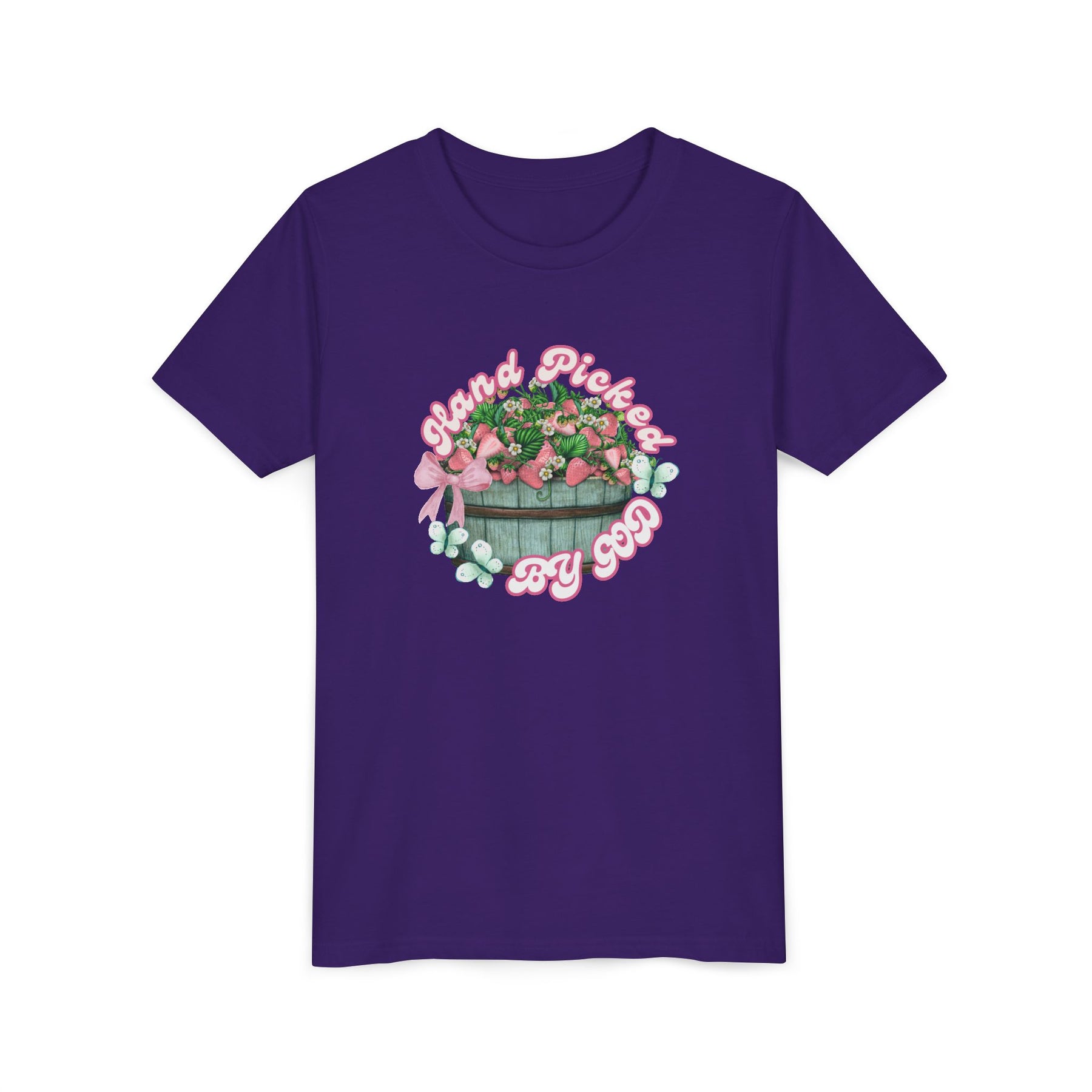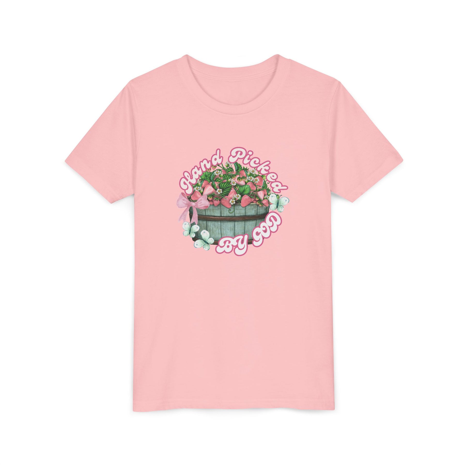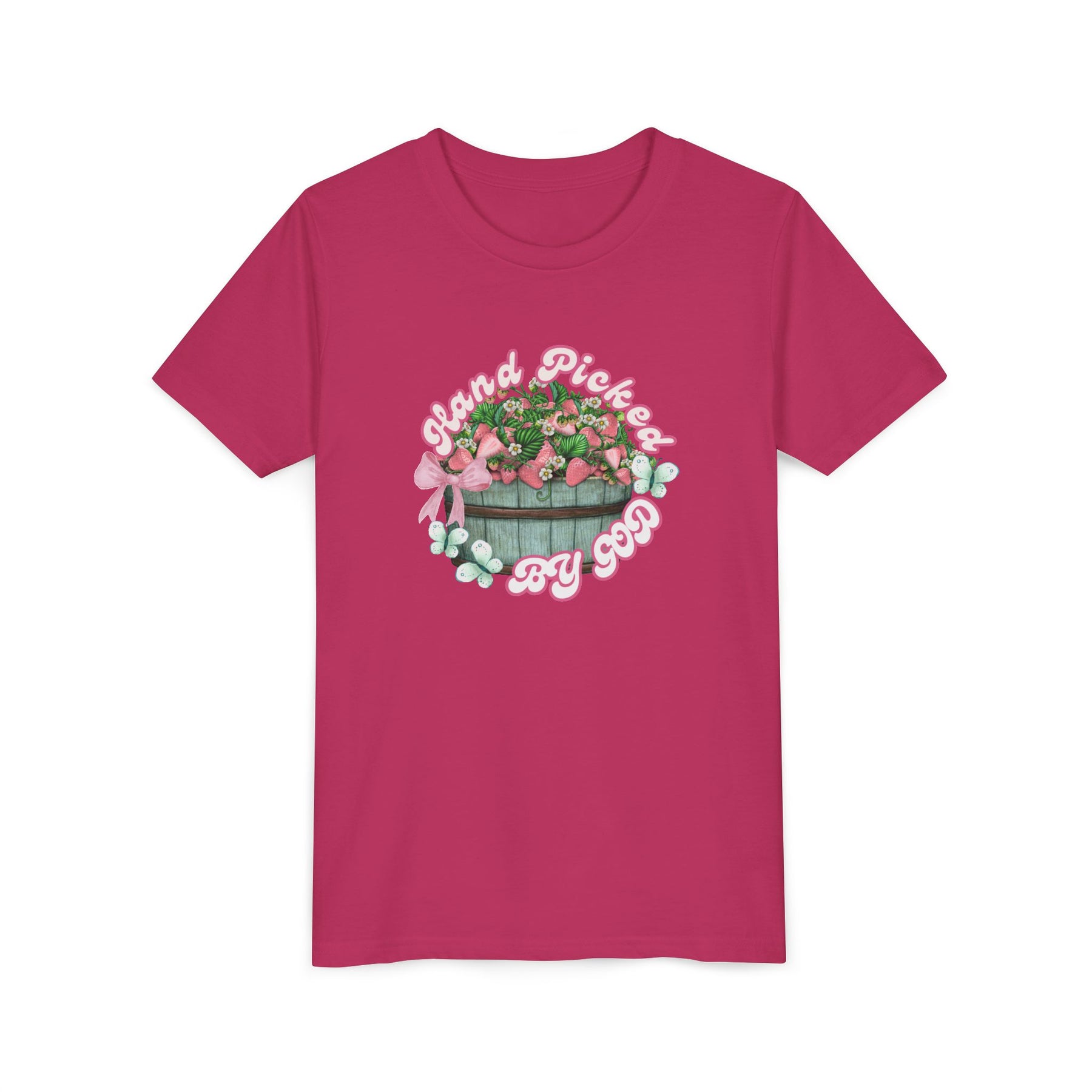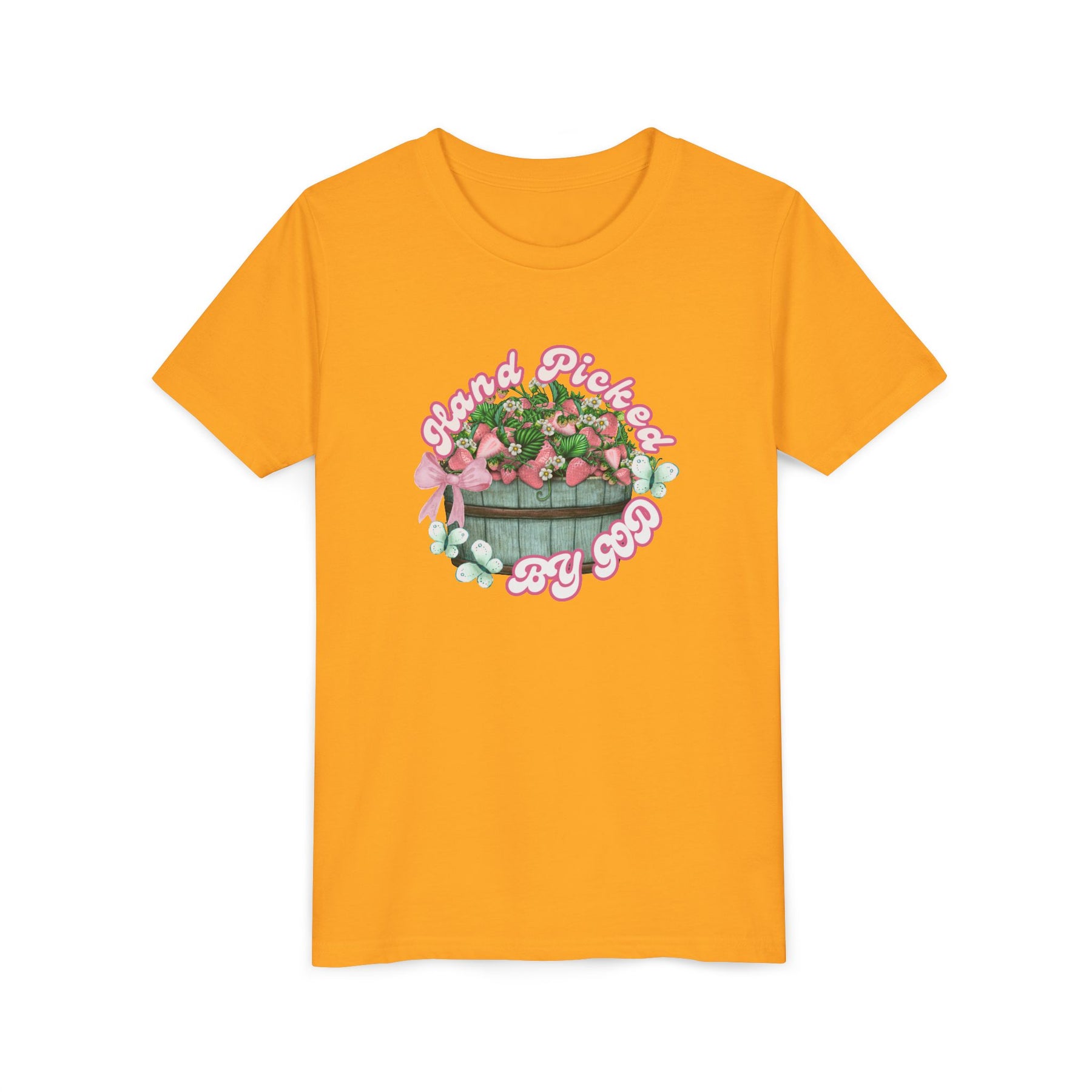 Hand Picked by GOD Youth Tee, a lightweight, soft short-sleeve shirt perfect for kids, featuring custom artwork display and comfortable ribbed collar.