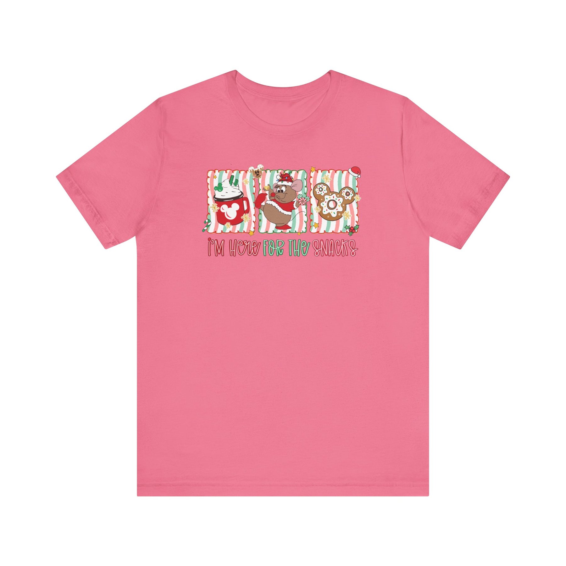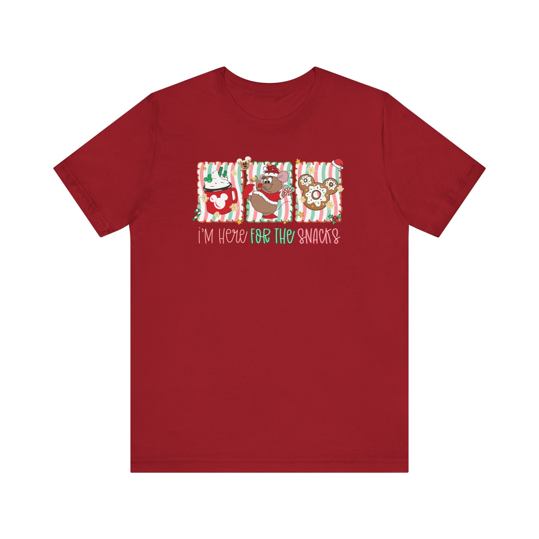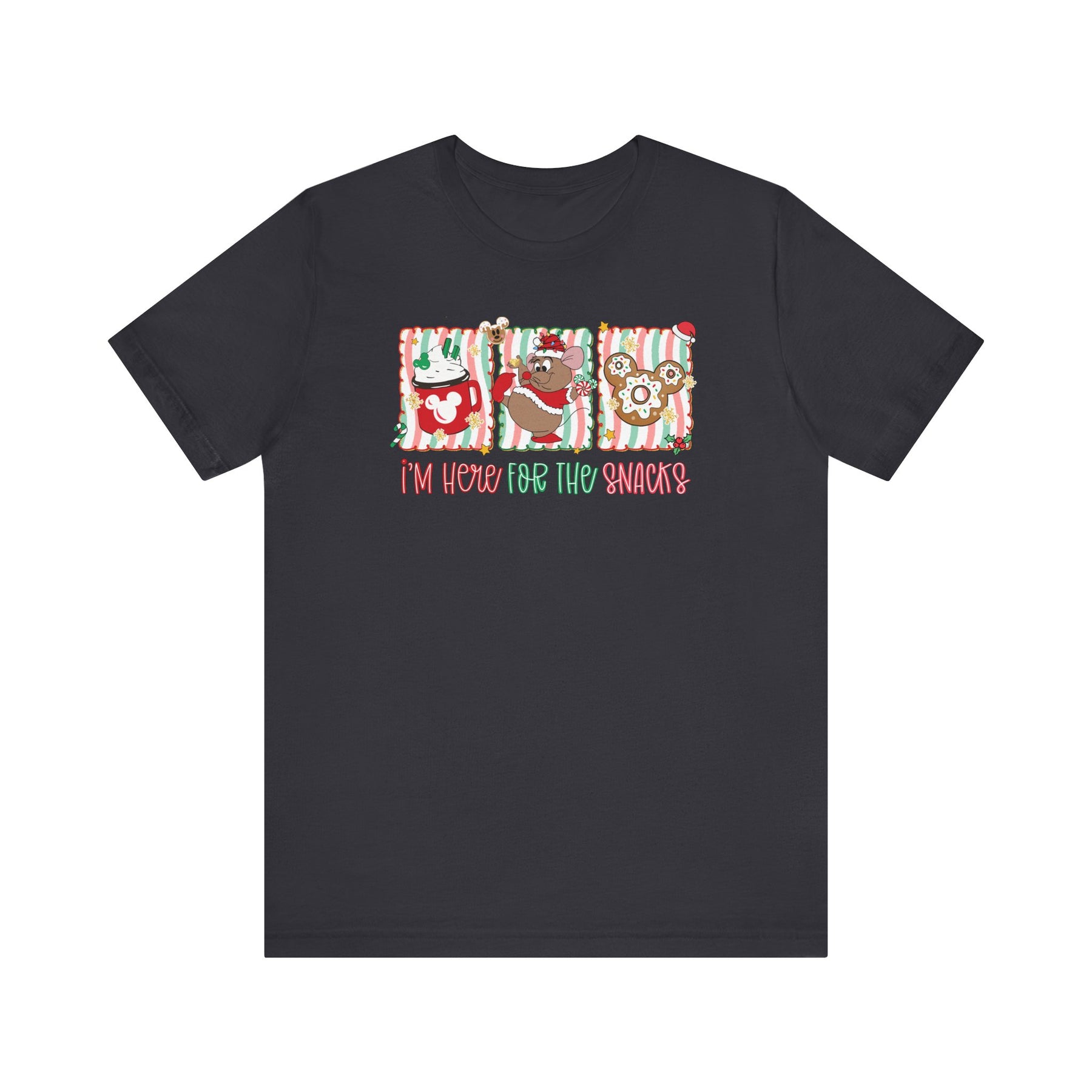 Here for the Snacks Tee features festive candy-cane graphics, Mickey-themed icons, and playful slogan. Unisex fit with soft cotton for comfort.