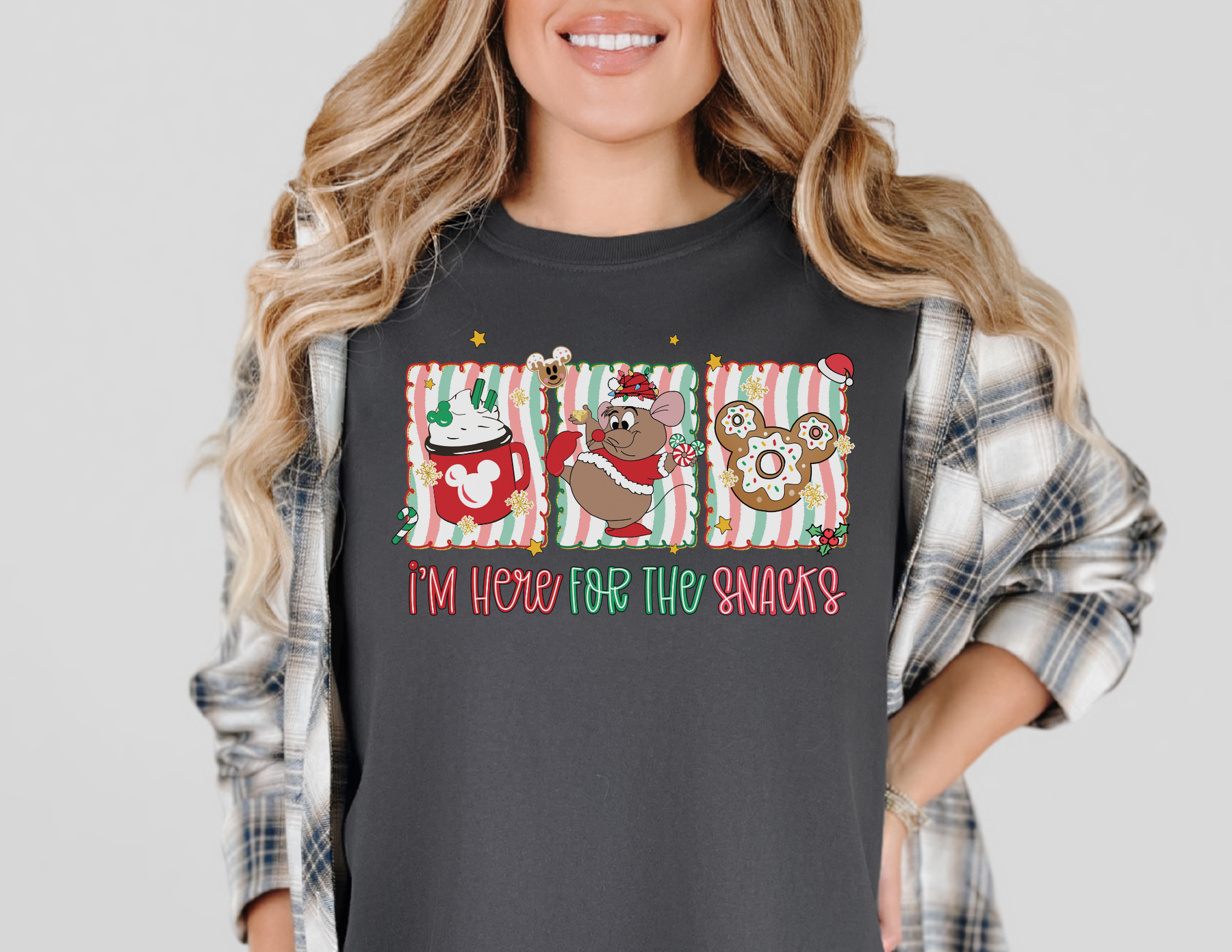 Here for the Snacks Tee featuring festive cartoon icons: a red mug, cheerful mouse, and Mickey-ear doughnut, with playful I’m here for the snacks caption.