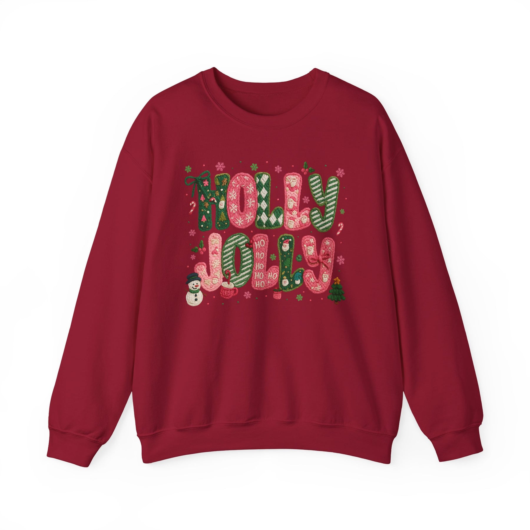 Holly Jolly Crew: Light-cream sweatshirt featuring festive HOLLY JOLLY graphic with red and green patterns, snowman, Christmas tree, and snowflake embellishments.