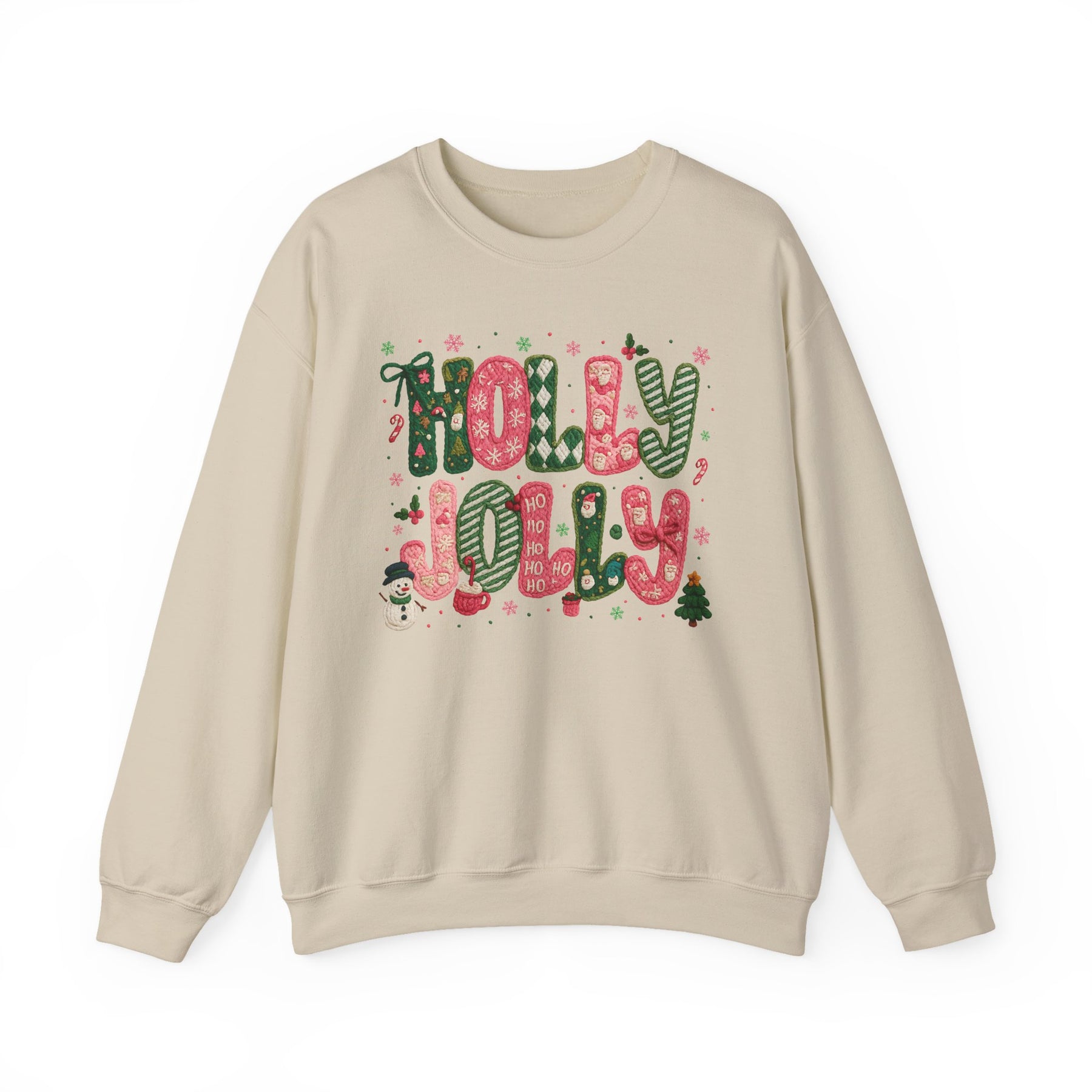 Light-beige HOLLY JOLLY sweatshirt with festive yarn-style lettering and holiday motifs, offering a cozy, durable, unisex fit, perfect for cooler months.