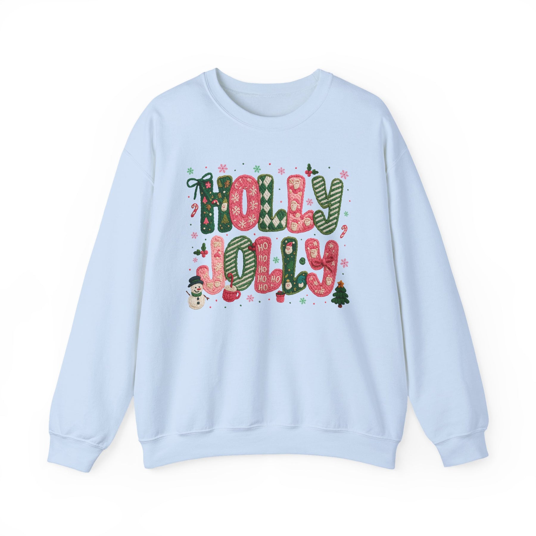 Light-blue crewneck sweatshirt featuring HOLLY JOLLY in festive red-and-green designs with snowflakes, holly, snowman, and Christmas tree accents. Cozy, durable blend.