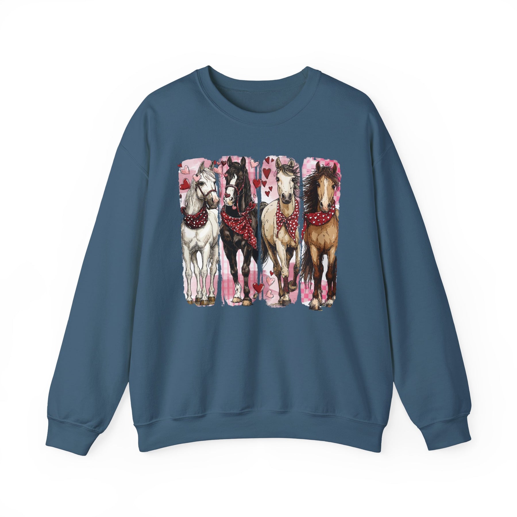 Horse Valentine Crew sweatshirt featuring four bandana-clad horses with heart motifs, offering a cozy fit and durable polyester-cotton blend for lasting comfort.