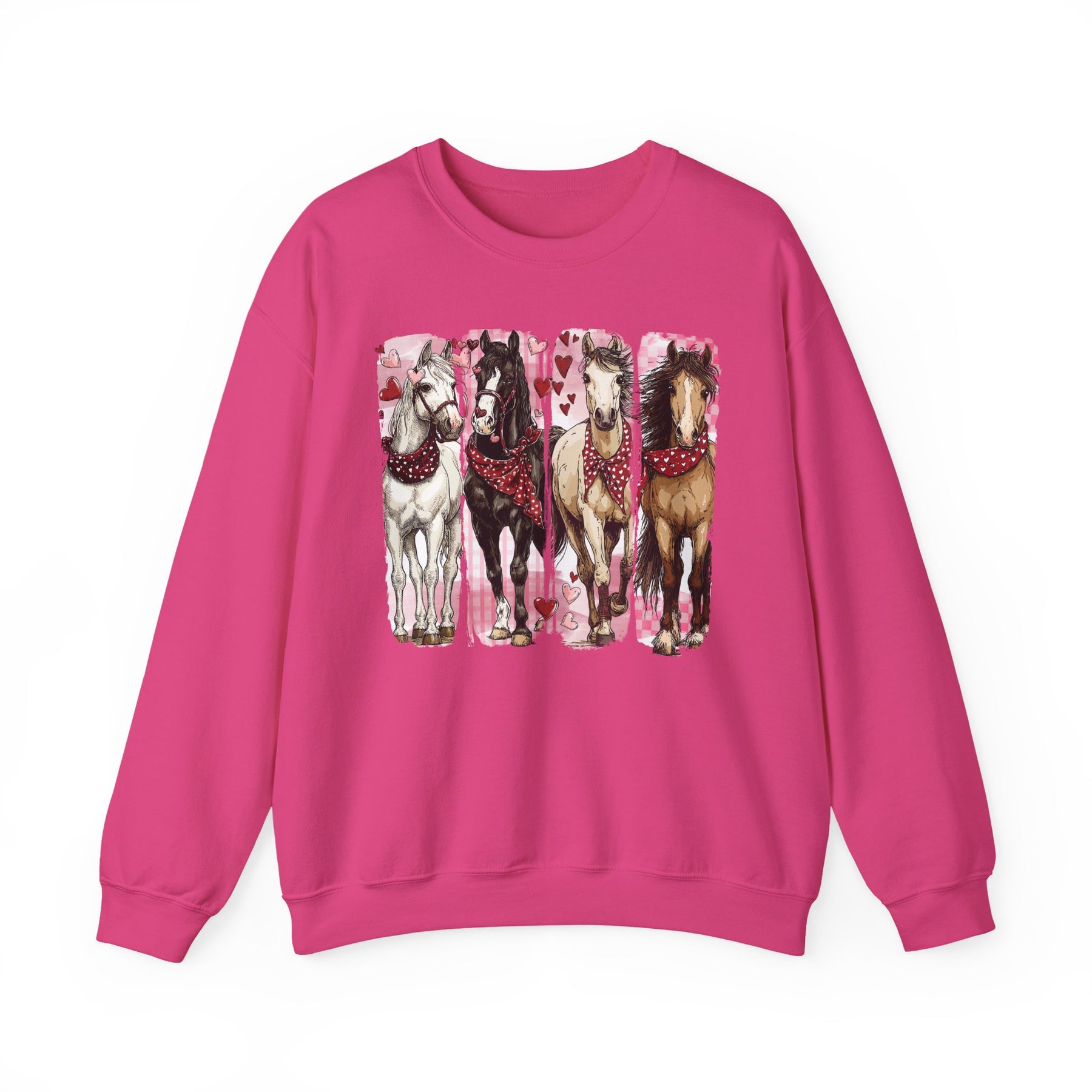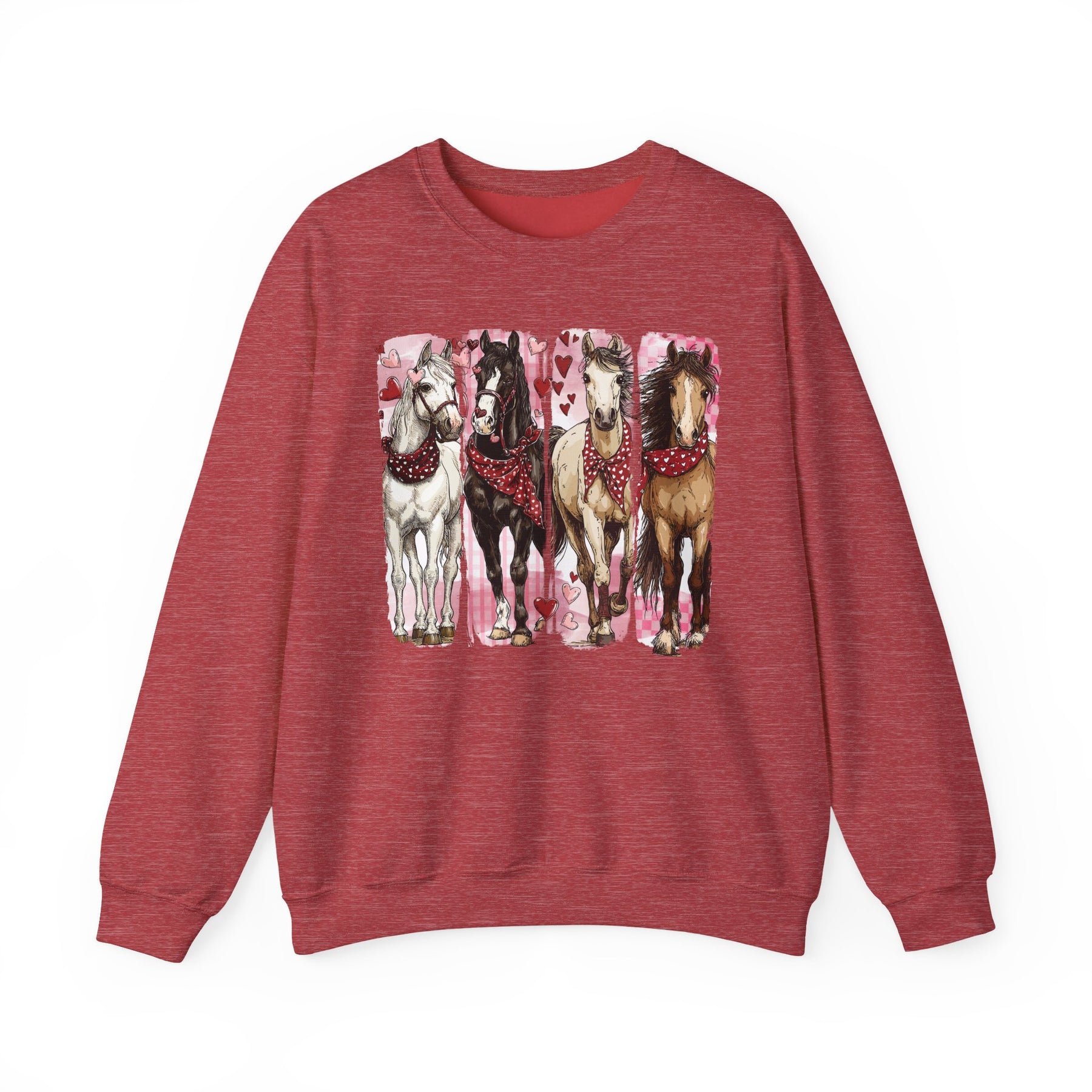 Horse Valentine Crew sweatshirt with four illustrated horses wearing red bandanas, set against a pink heart-decorated background, showcasing comfort and style in a unisex design.