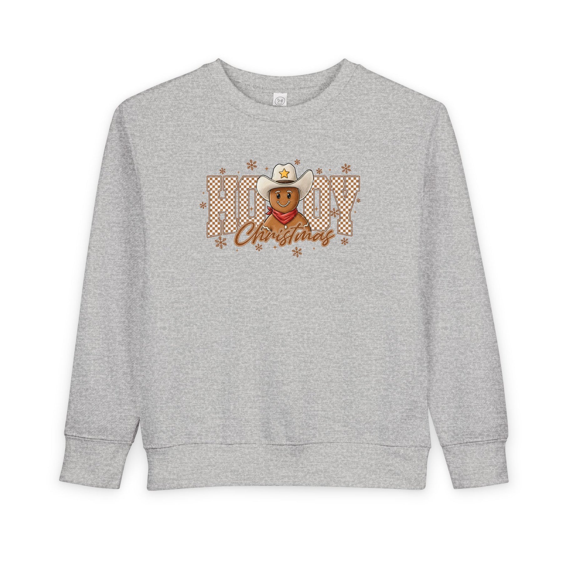 Howdy Christmas Toddler Crew sweatshirt featuring a festive graphic with a cowboy-hat-wearing gingerbread man and snowflakes, ideal for keeping toddlers cozy and stylish.