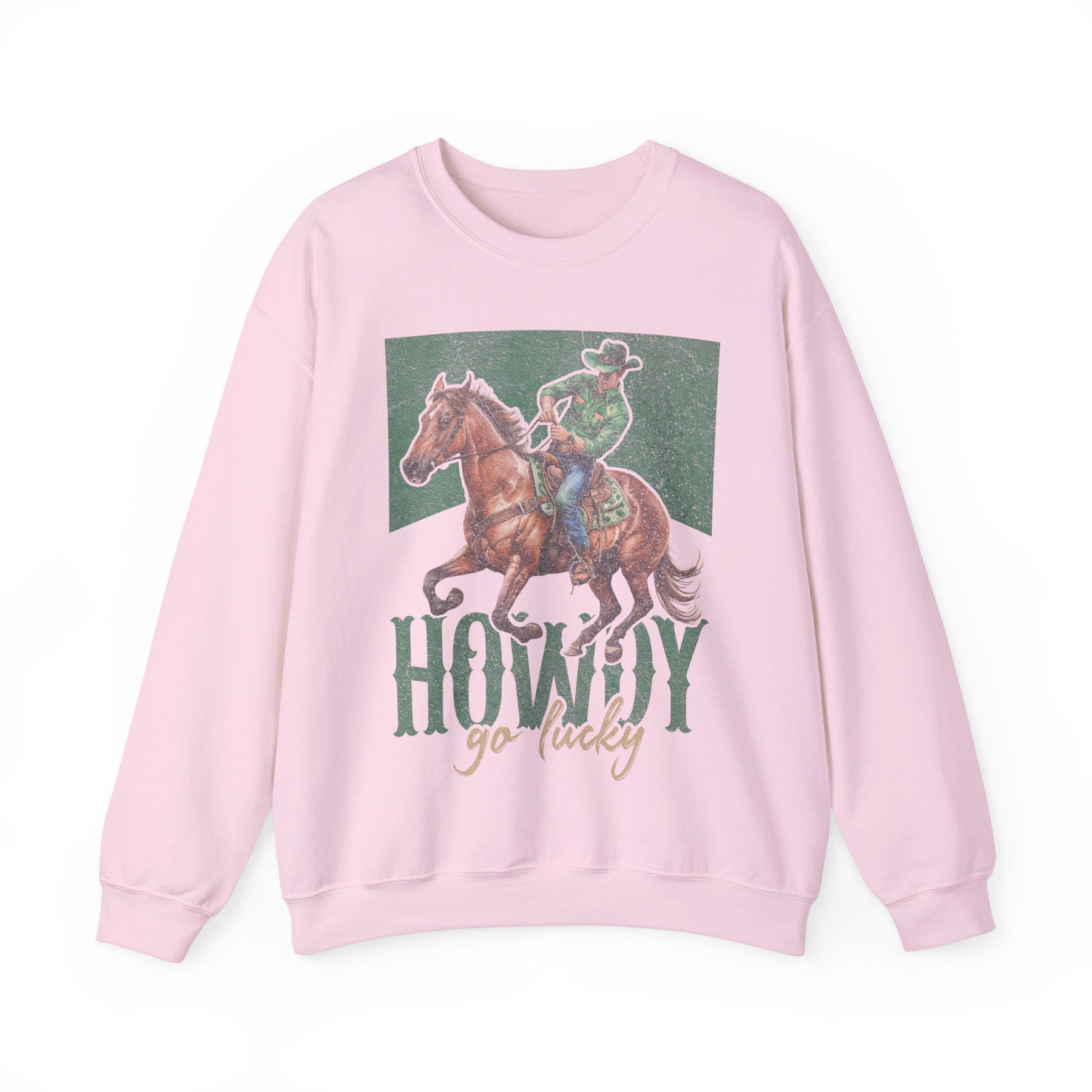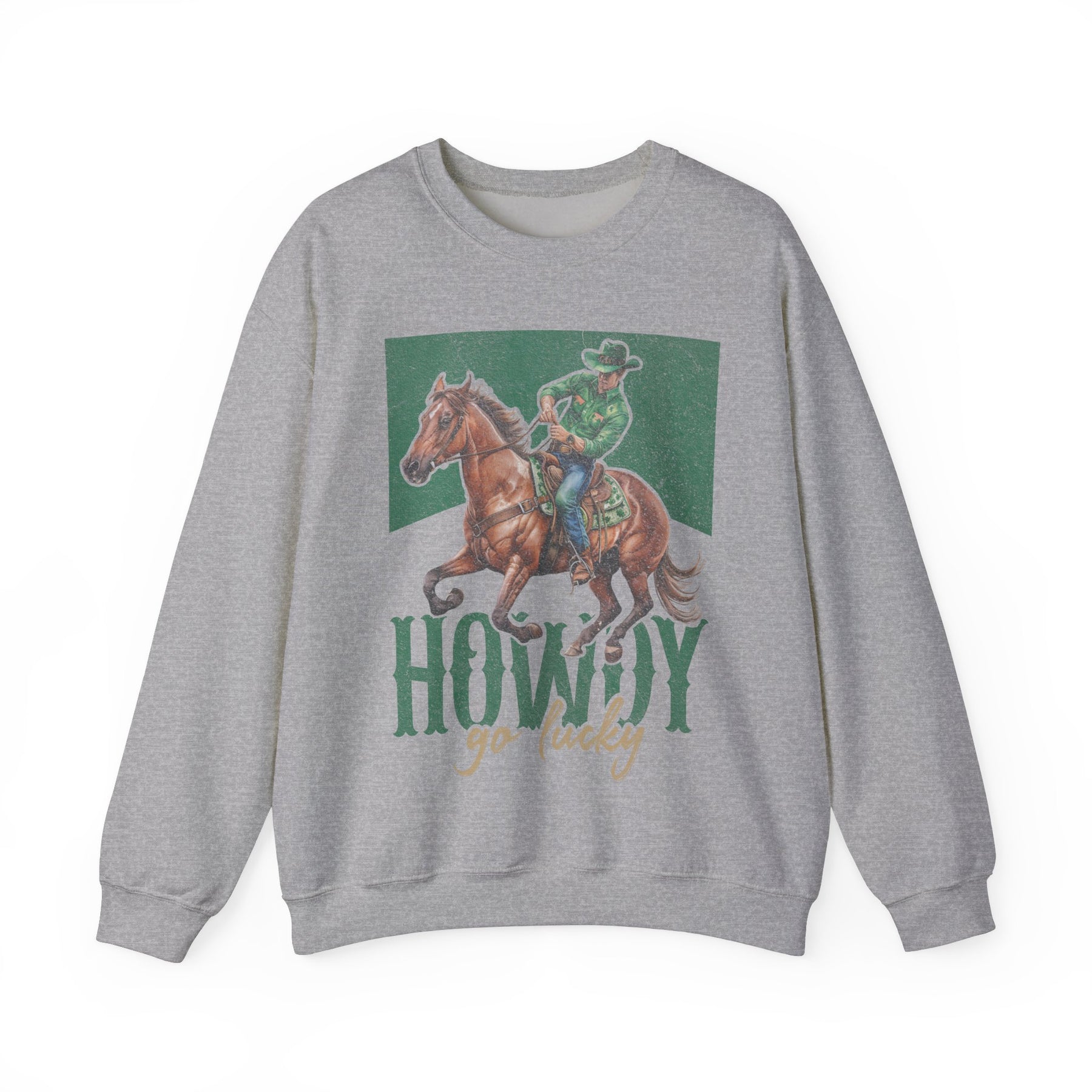 Howdy Go Lucky Crew sweatshirt featuring a cowboy riding a horse design, made from a comfortable polyester-cotton blend for a stylish, relaxed fit.