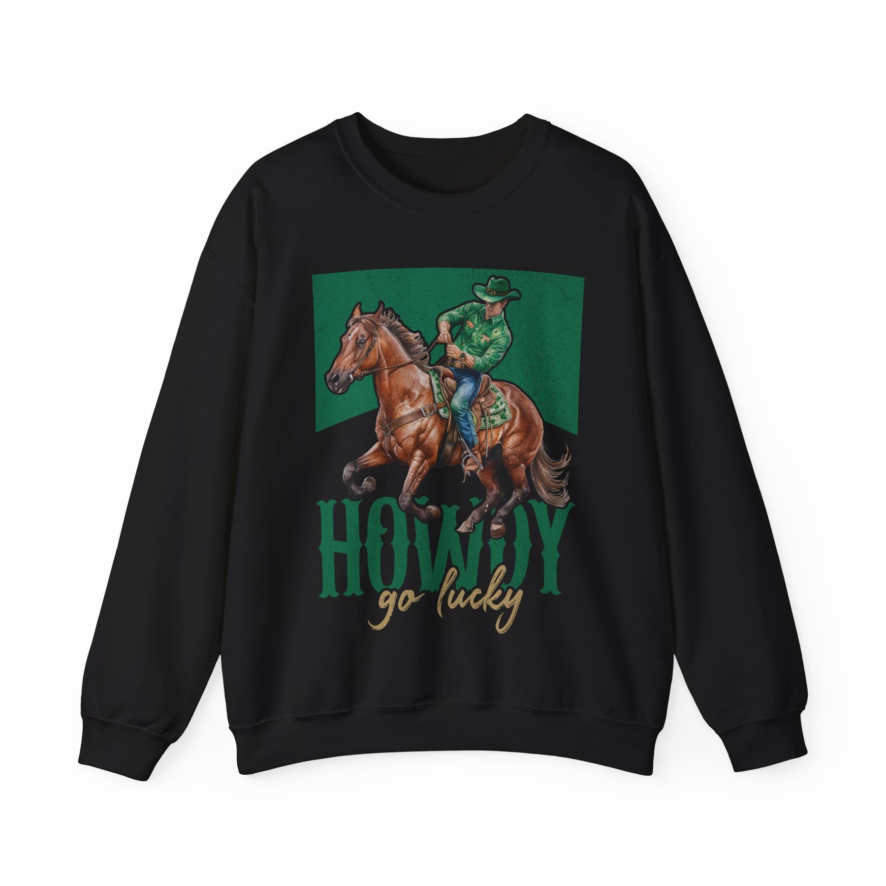 Howdy Go Lucky Crew sweatshirt featuring a cowboy riding a horse, designed for comfort with a ribbed collar and a cotton-polyester blend.