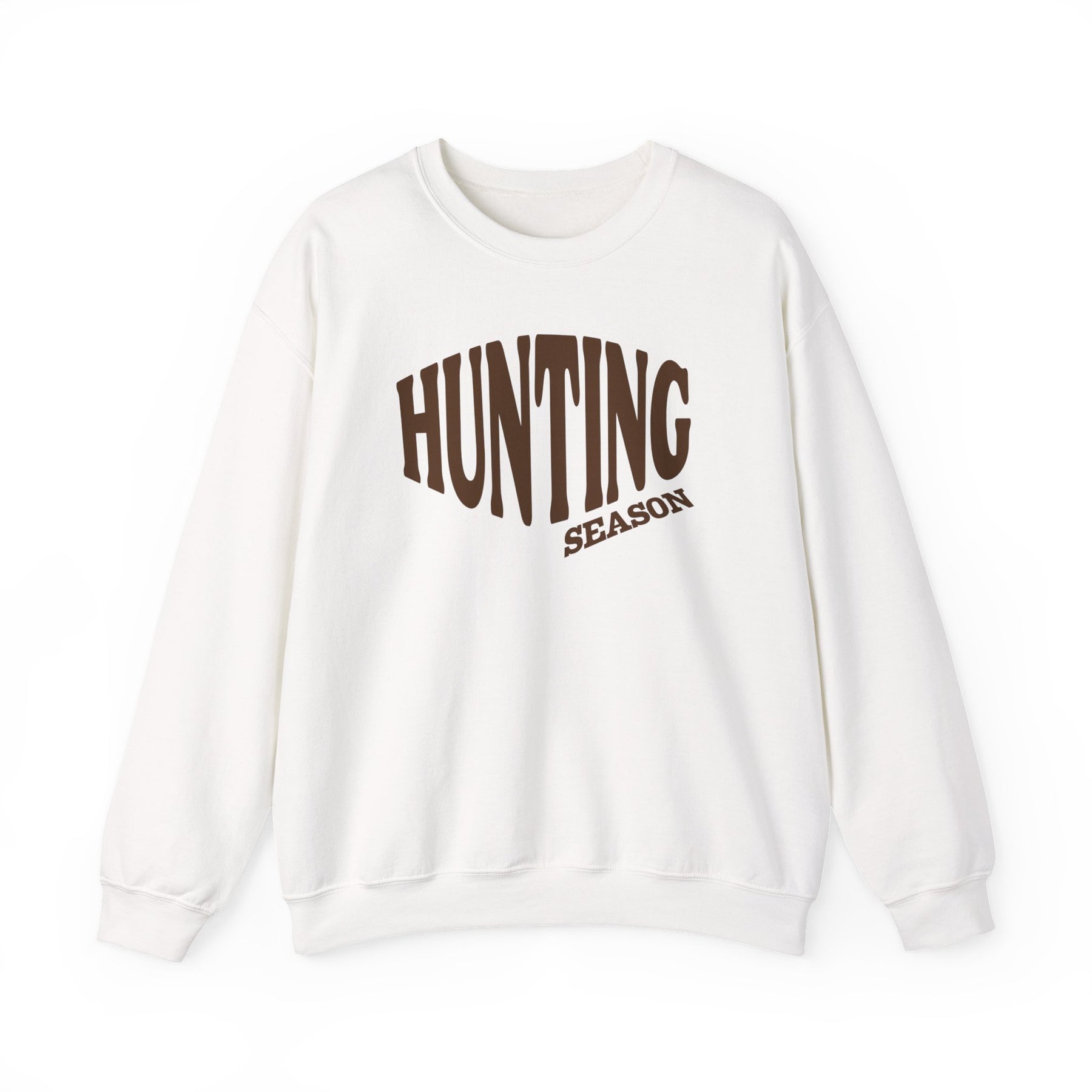 Plain white crewneck sweatshirt with HUNTING SEASON in brown text, featuring ribbed cuffs and hem, offering a cozy, durable fit for cooler months.