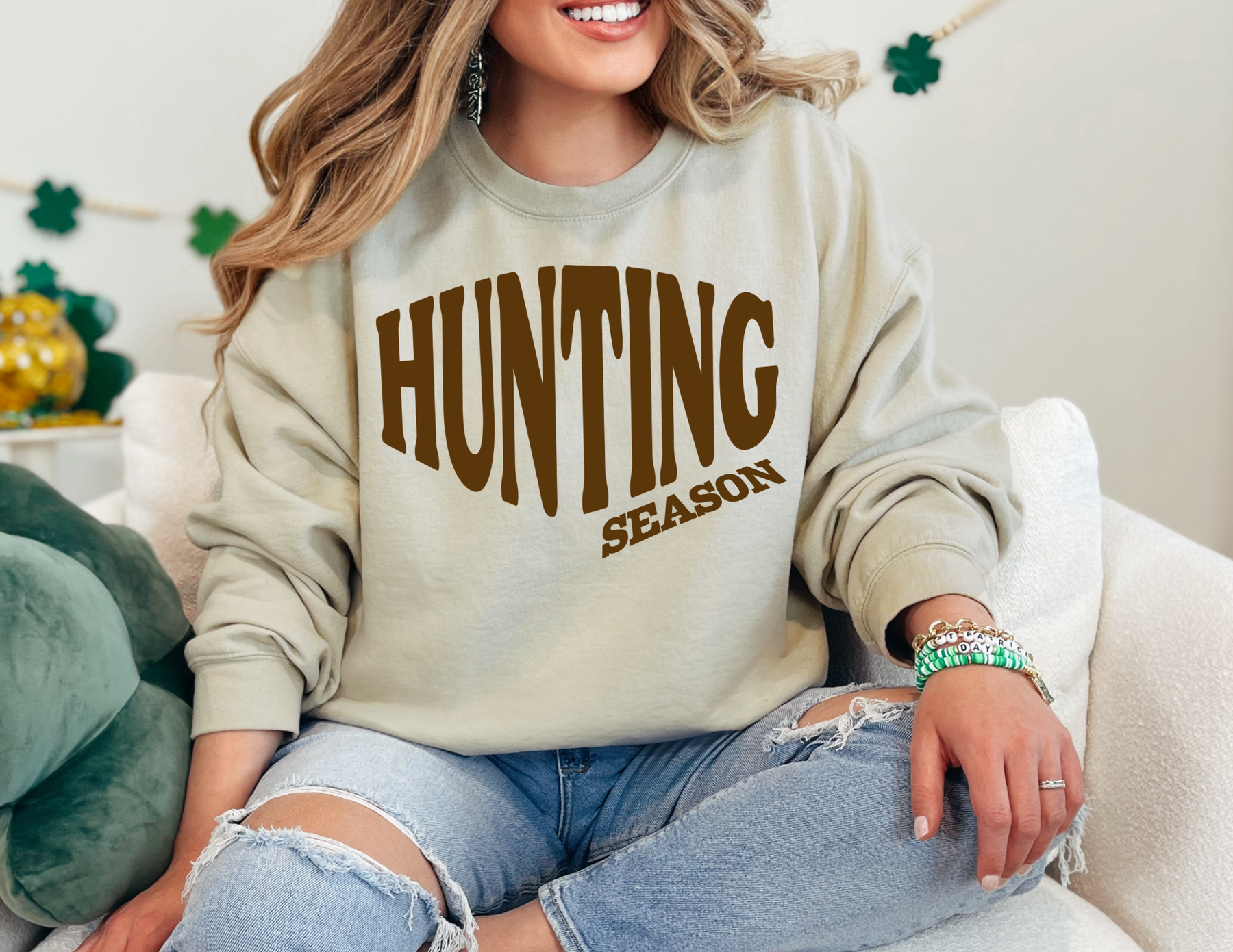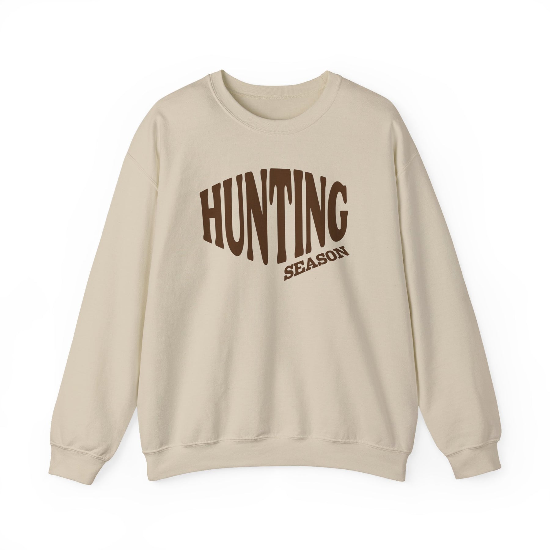 Cream crewneck sweatshirt with “HUNTING SEASON” in brown block font, combining comfort and style with durable, ethically-sourced materials. Perfect for cooler weather.