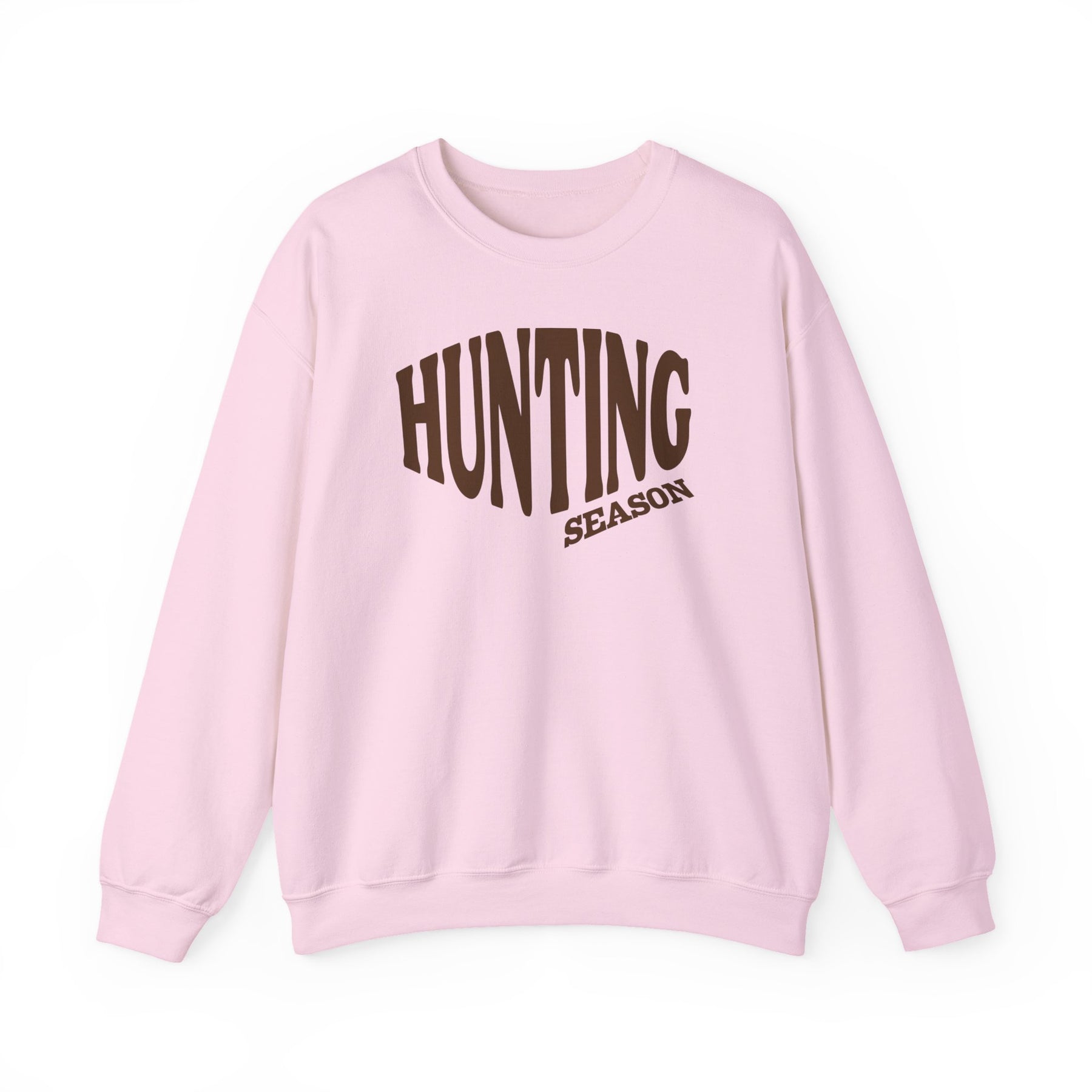 Light pink crewneck sweatshirt with HUNTING SEASON in bold brown letters, designed for comfort and style, perfect for colder months.