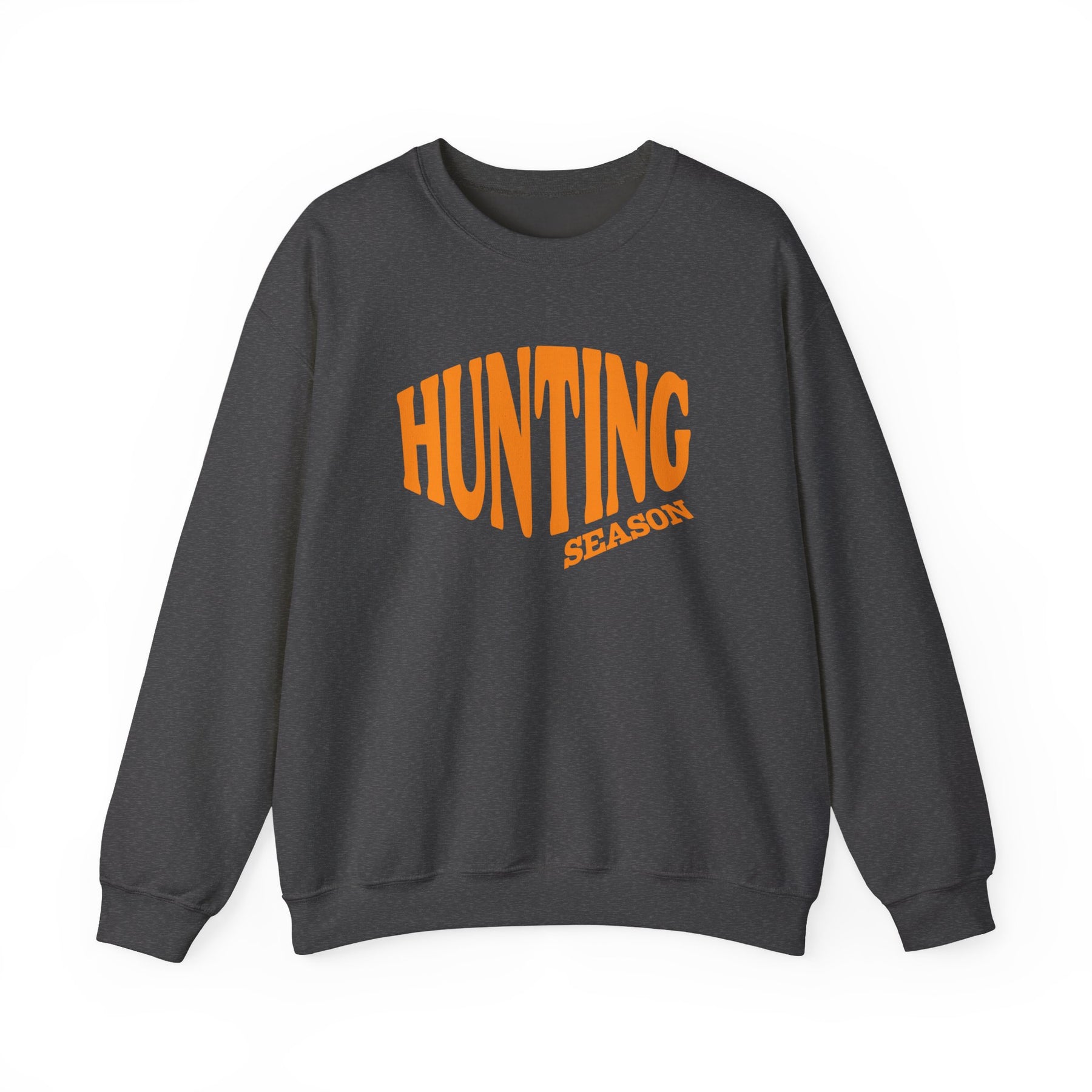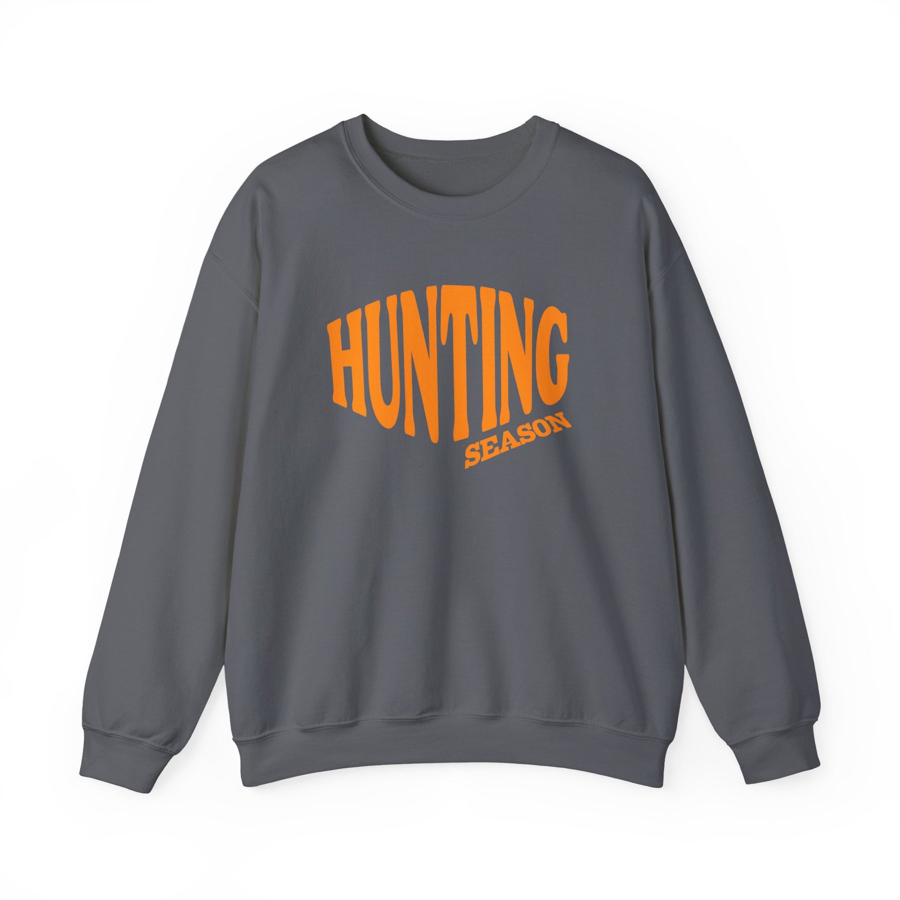 Dark gray crewneck sweatshirt with HUNTING SEASON in orange text, showcasing a comfortable, unisex design ideal for colder months.