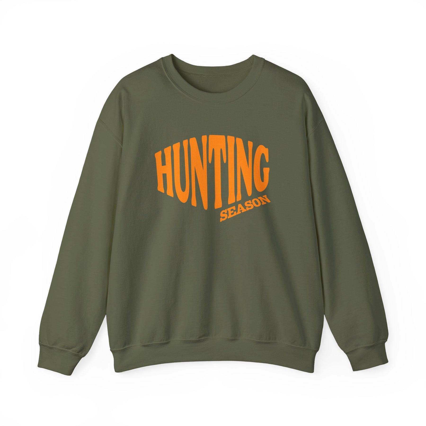Army-green sweatshirt with HUNTING SEASON in orange letters, crewneck, long sleeves, unisex fit. Made of a cozy polyester-cotton blend for comfort and durability.