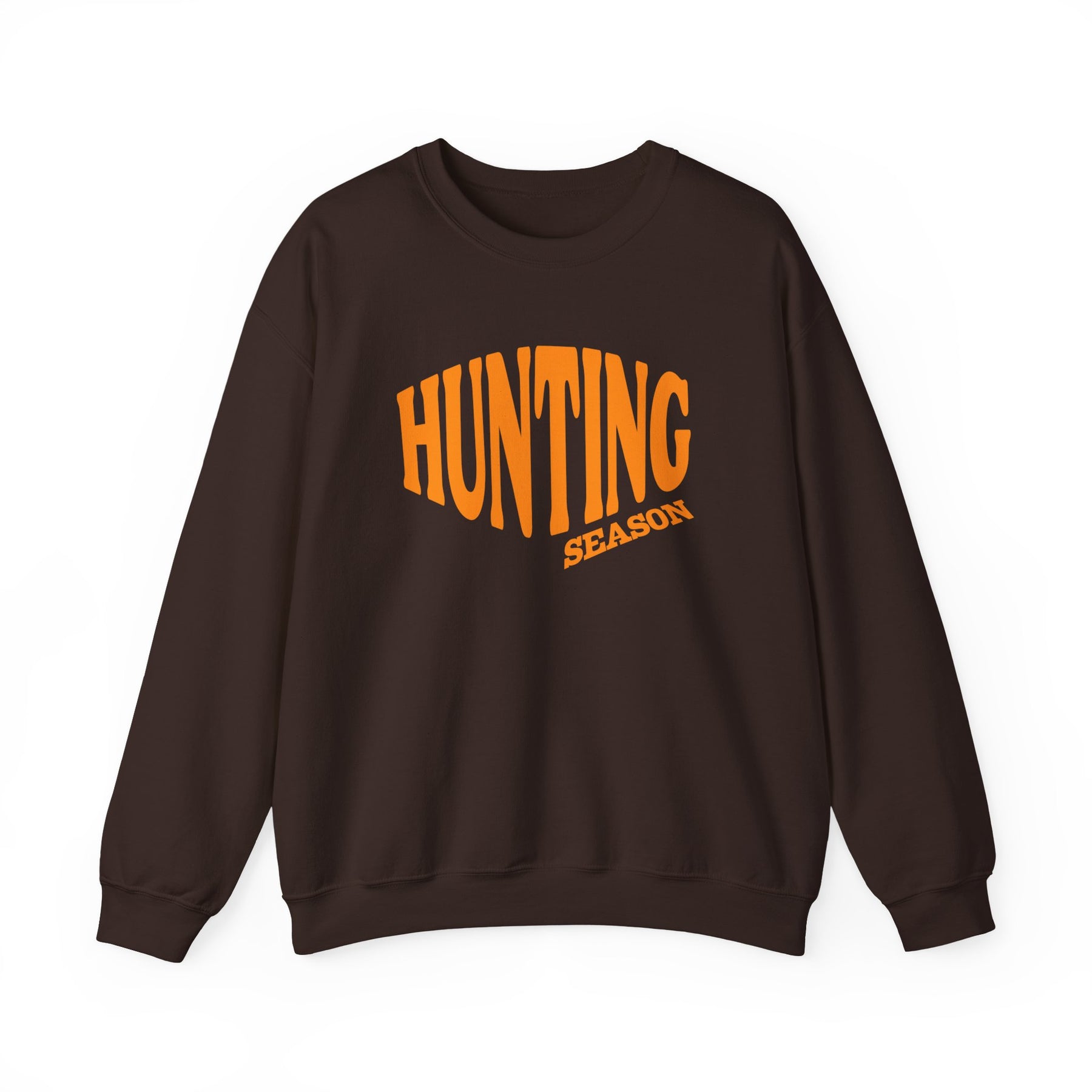 Dark brown crewneck sweatshirt with HUNTING SEASON in bold orange font, combining style and comfort with a classic fit and durable stitching.