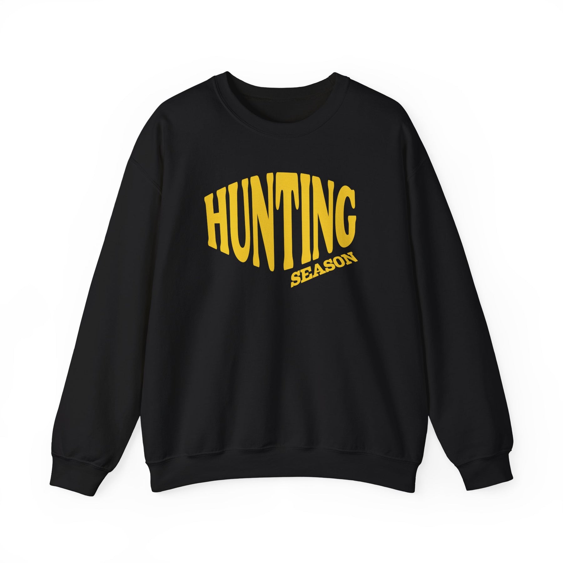 Black crewneck sweatshirt featuring bold yellow HUNTING SEASON graphic, combining comfort and style with durable stitching and a classic fit.
