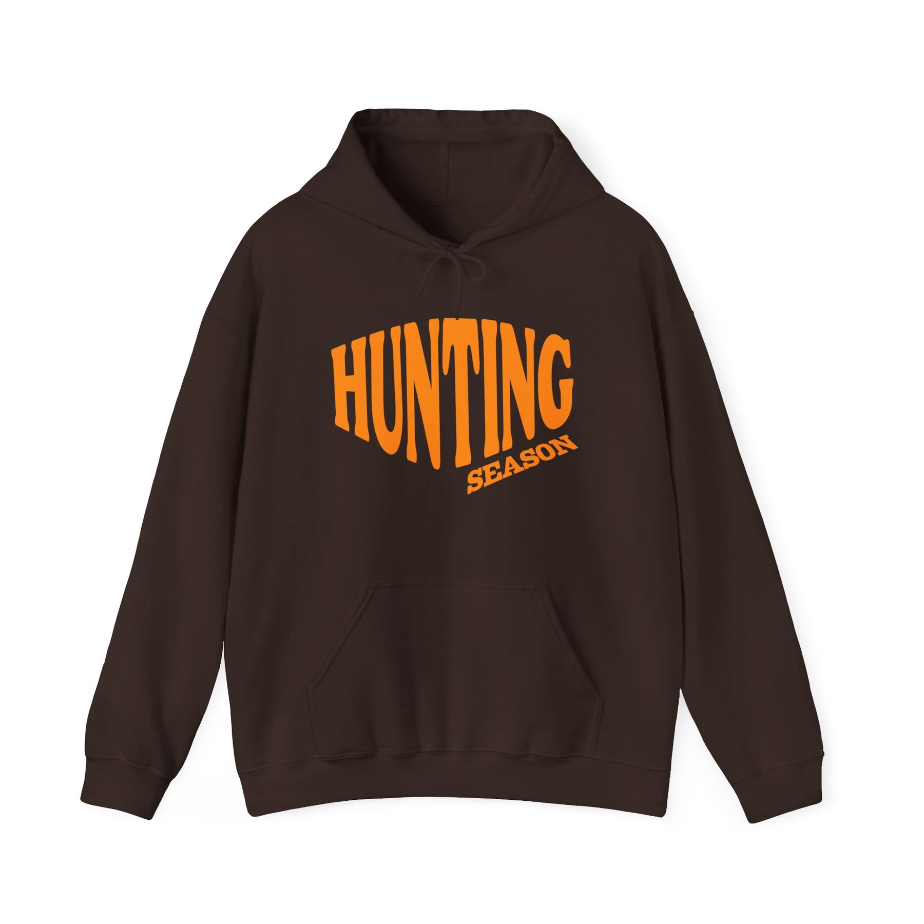 Hunting Season Hoodie with bold orange lettering, featuring a kangaroo pocket and drawstring hood, offering warmth and style for chilly days.