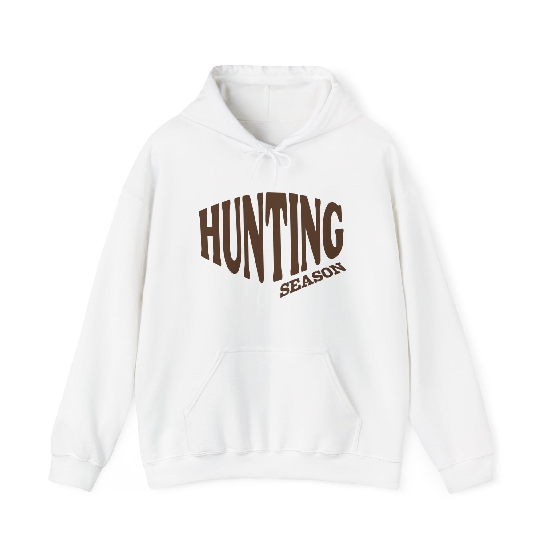 White Hunting Season hoodie with kangaroo pocket and drawstring hood, featuring bold brown lettering. Cozy cotton-polyester blend for warmth and comfort.