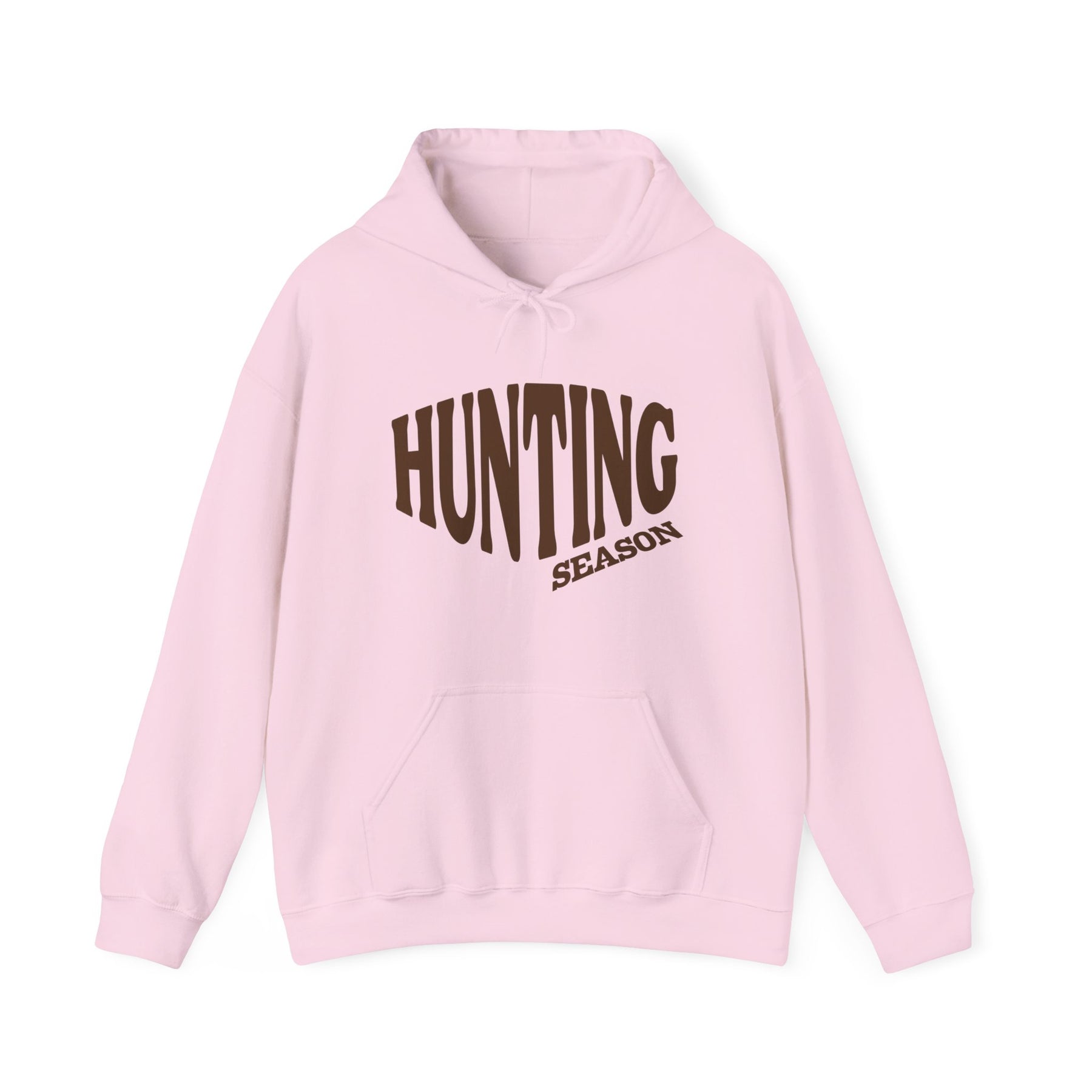Light pink Hunting Season hoodie with kangaroo pocket and drawstring hood, offering a cozy blend of cotton and polyester for warmth and comfort.