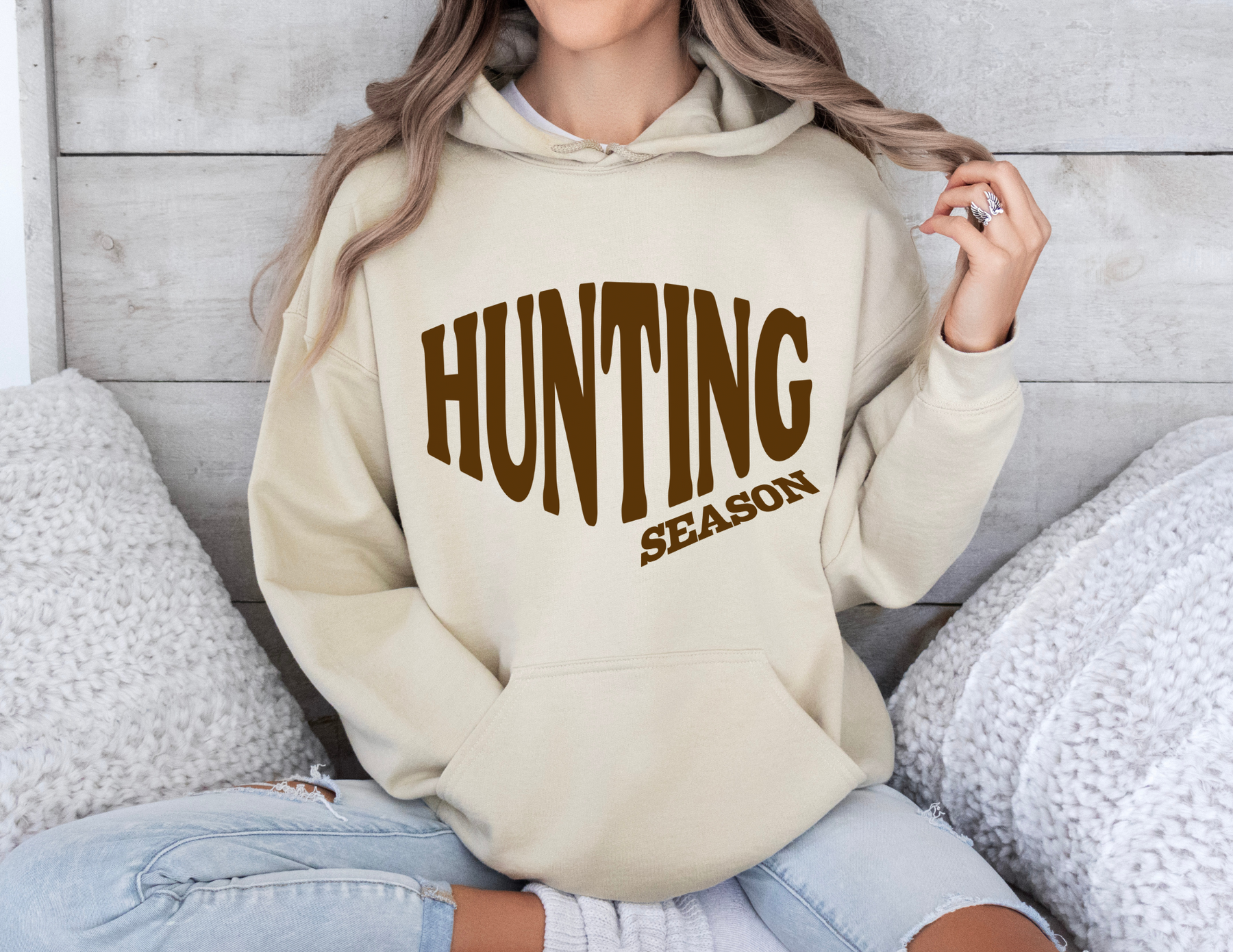 Hunting Season Hoodie: Light-beige pullover with HUNTING SEASON in brown, front kangaroo pocket, and drawstring hood. Cozy blend for warmth and style.