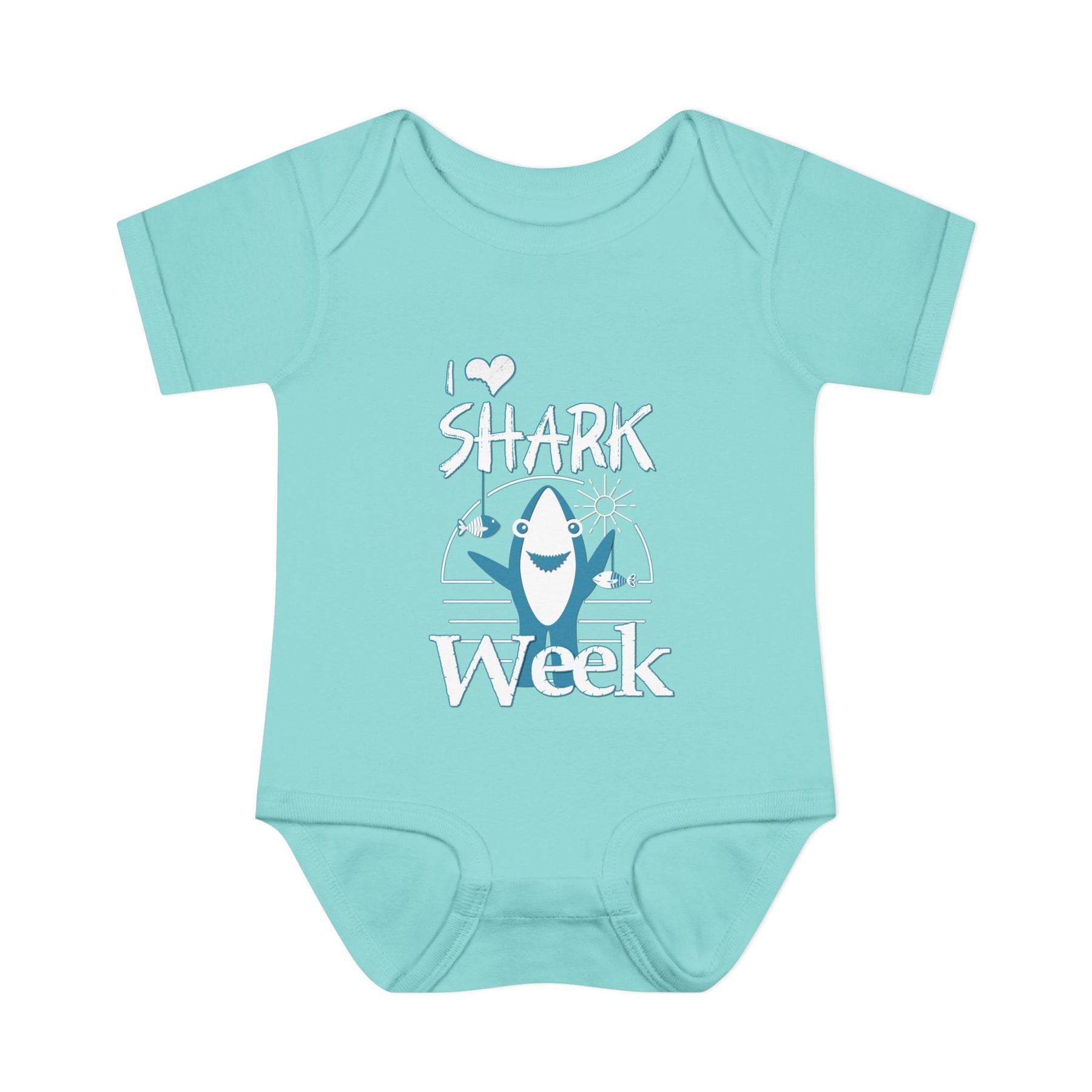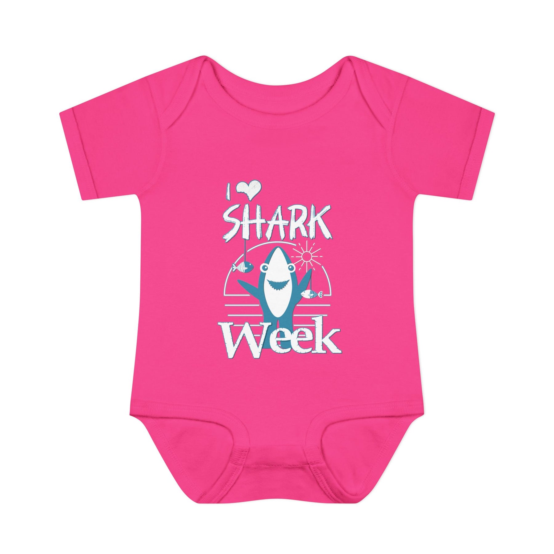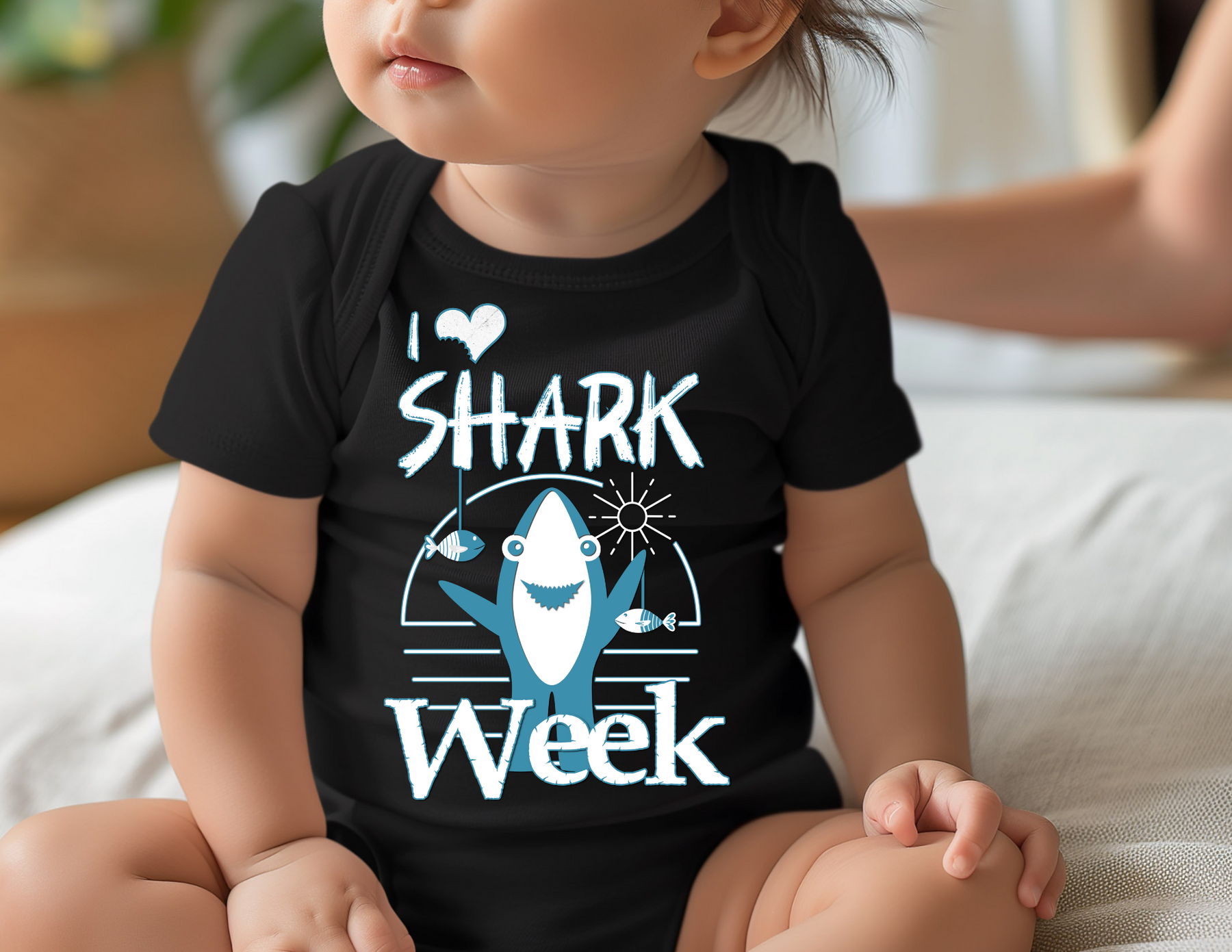 I Love Shark Week Onesie: Soft infant bodysuit with lap shoulders, designed for comfort and easy dressing, made from 100% ring-spun cotton.