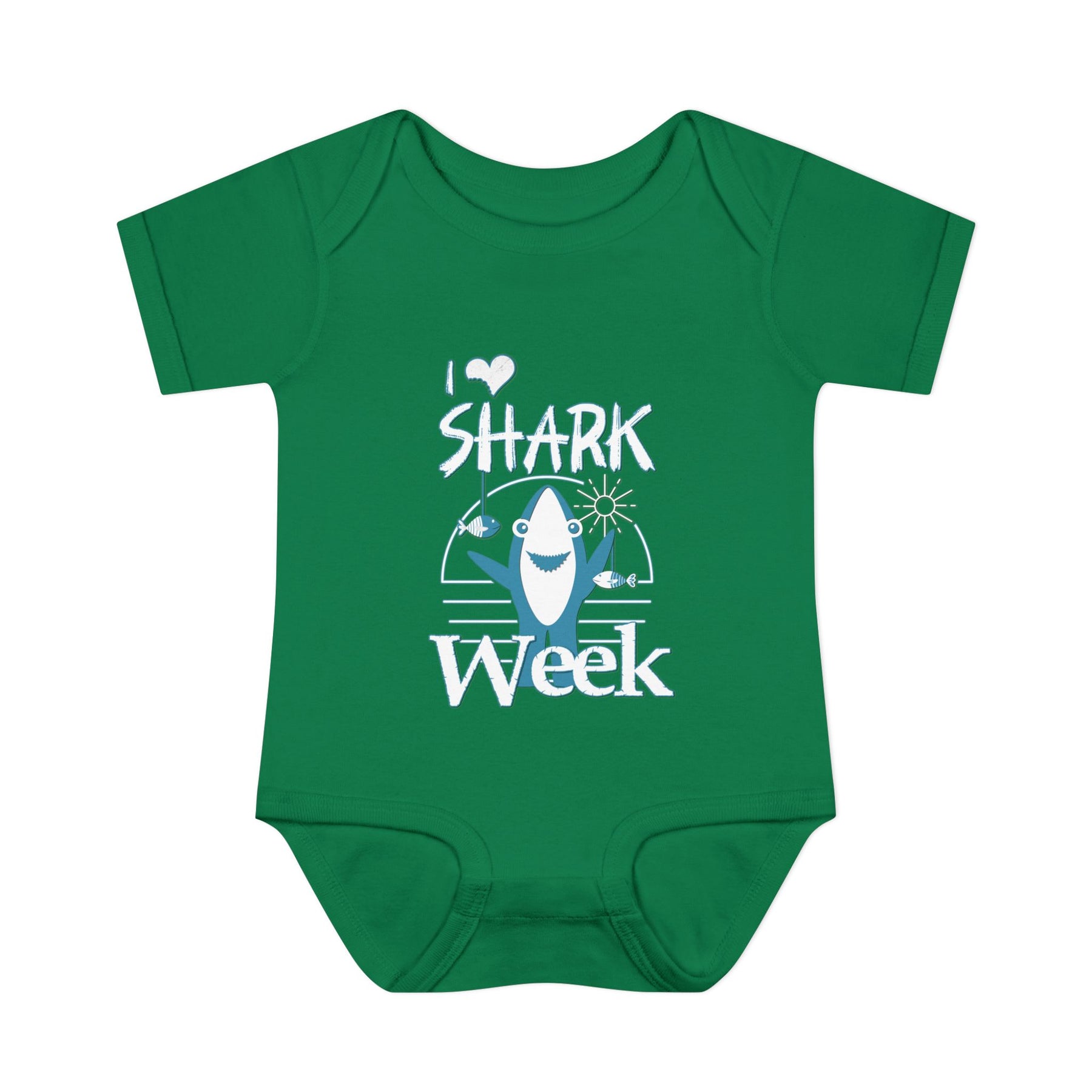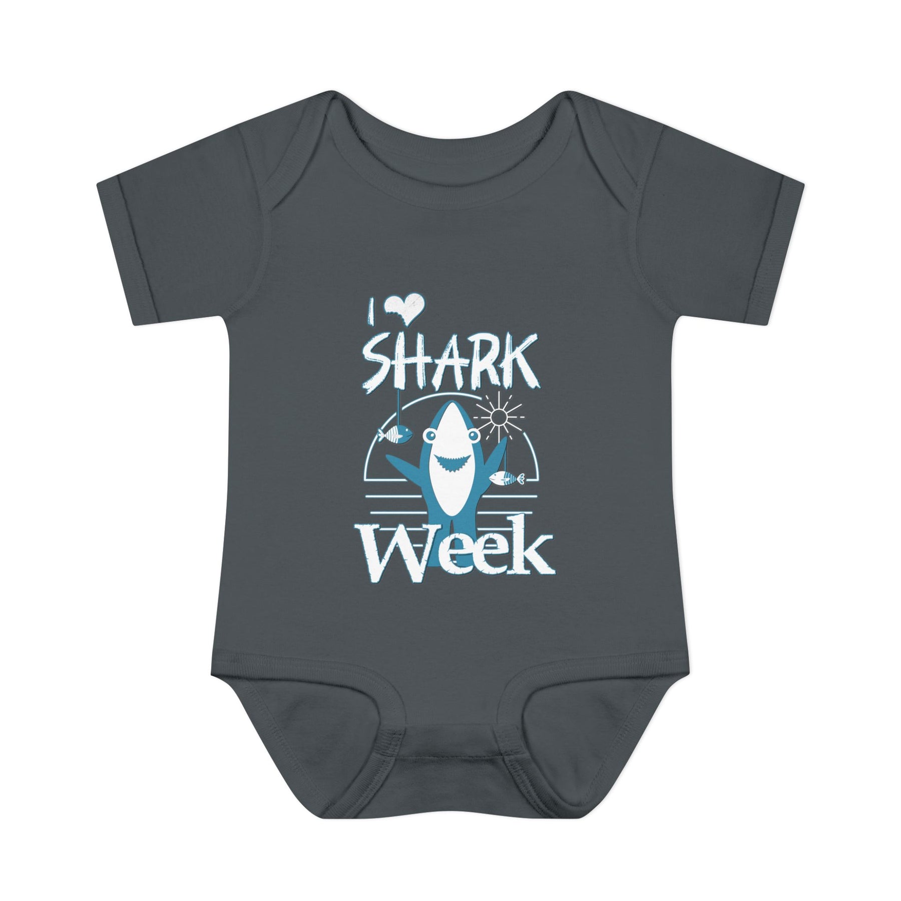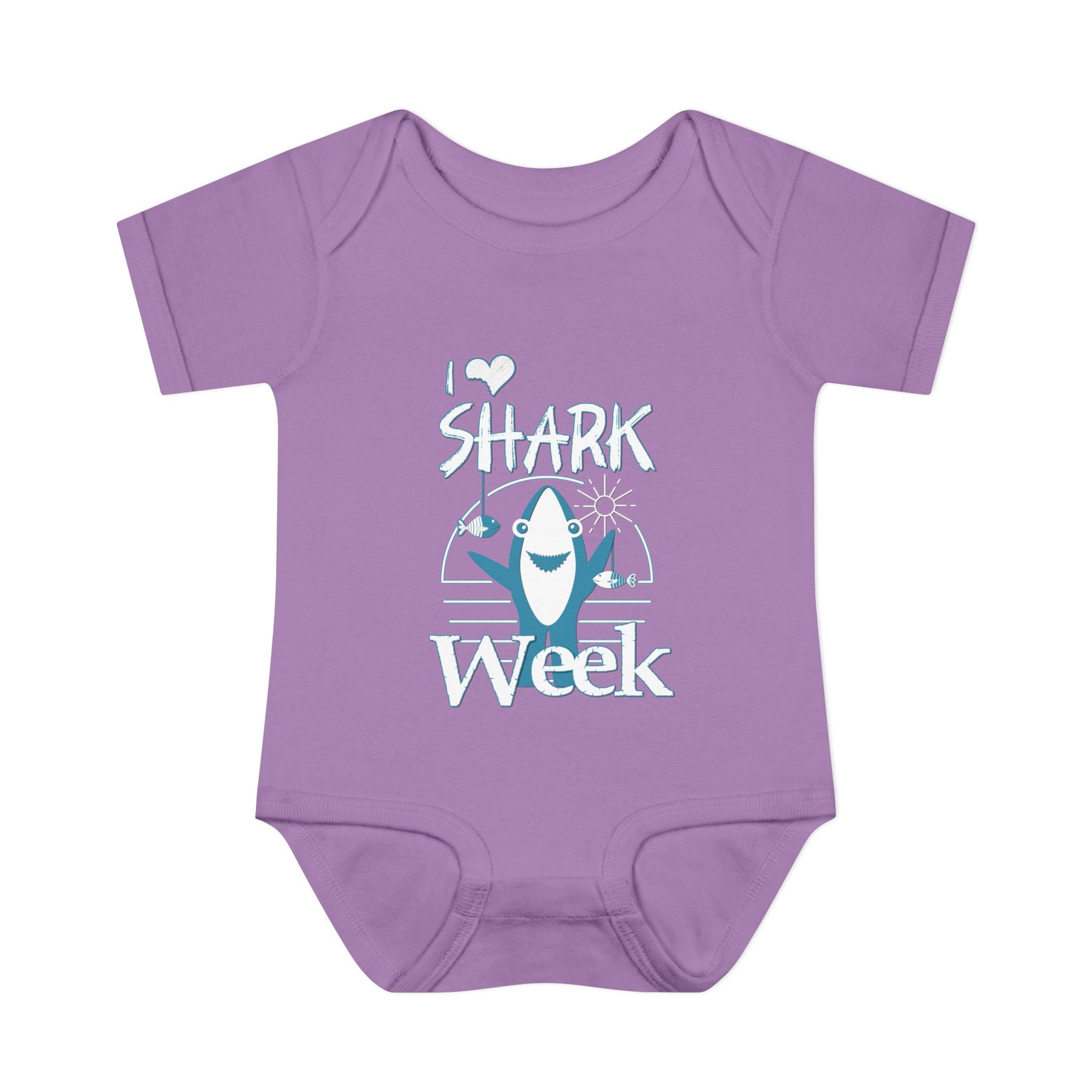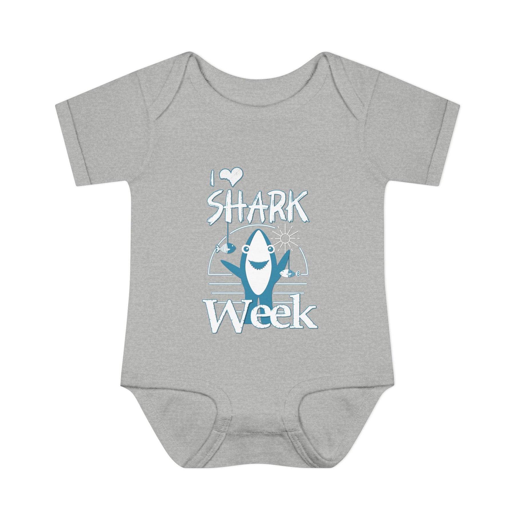 I Love Shark Week Onesie: Soft infant bodysuit with lap shoulders, designed for comfort and easy dressing, made from 100% ring-spun cotton.