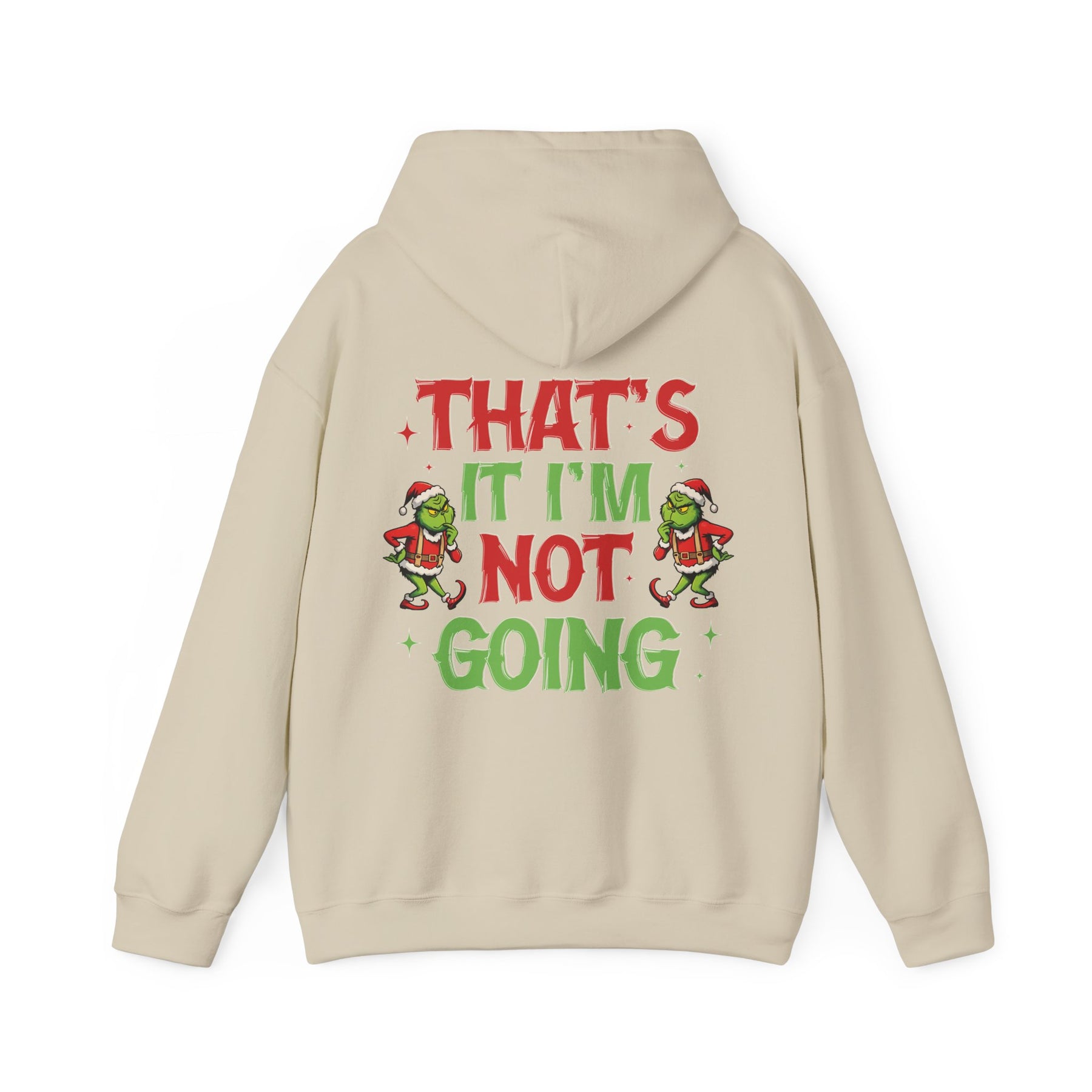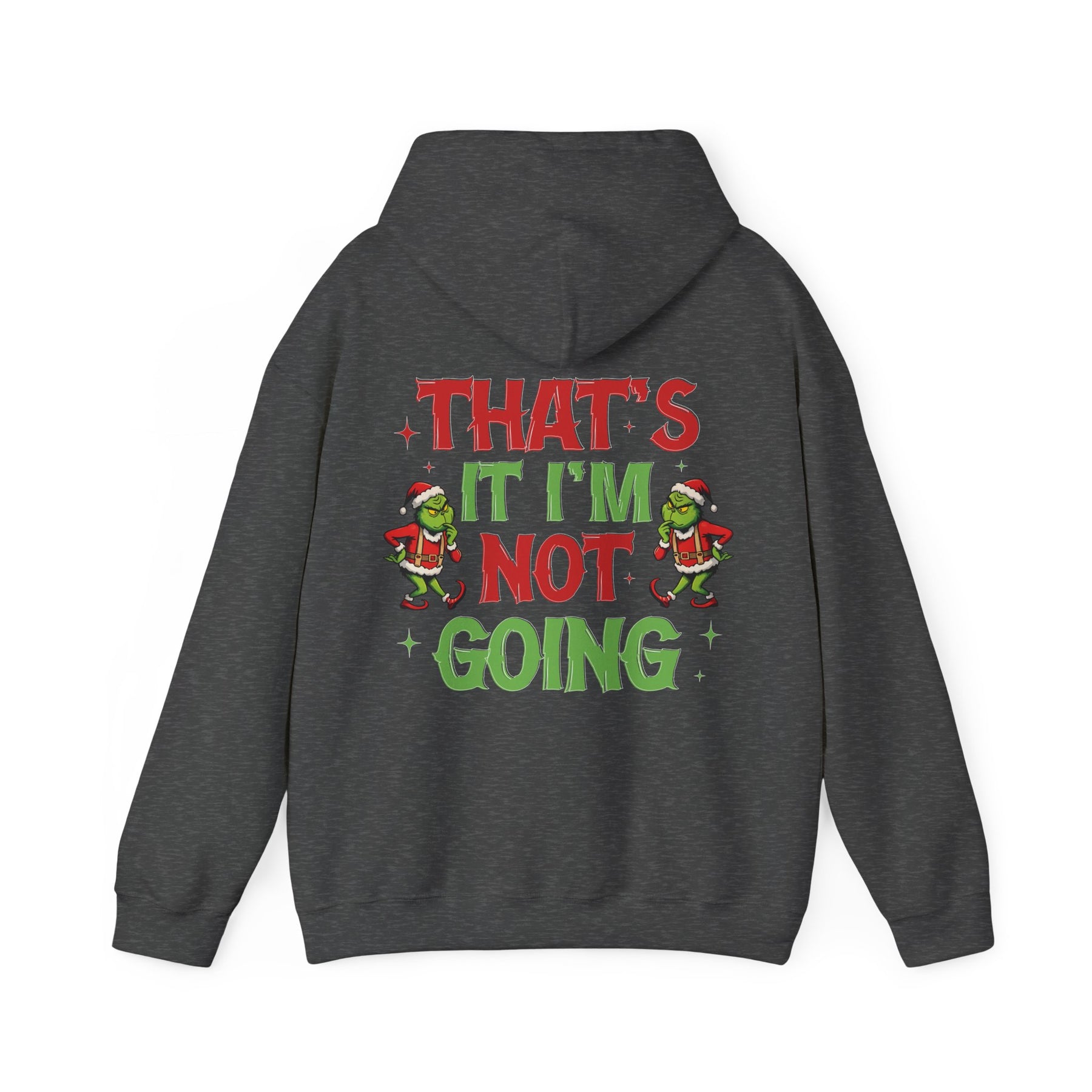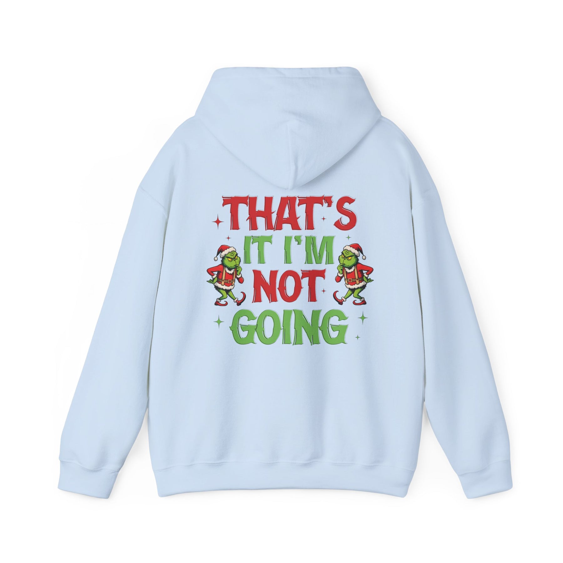 A unisex I'm Not Going Hoodie heavy blend hooded sweatshirt is relaxation itself. The material is a thick blend of cotton and polyester. This makes for a plush, soft feel alongside warmth. It's also a great surface for printing. There are no side seams. A spacious kangaroo pocket hangs in front. The hood's drawstring is the same color as the base sweater.