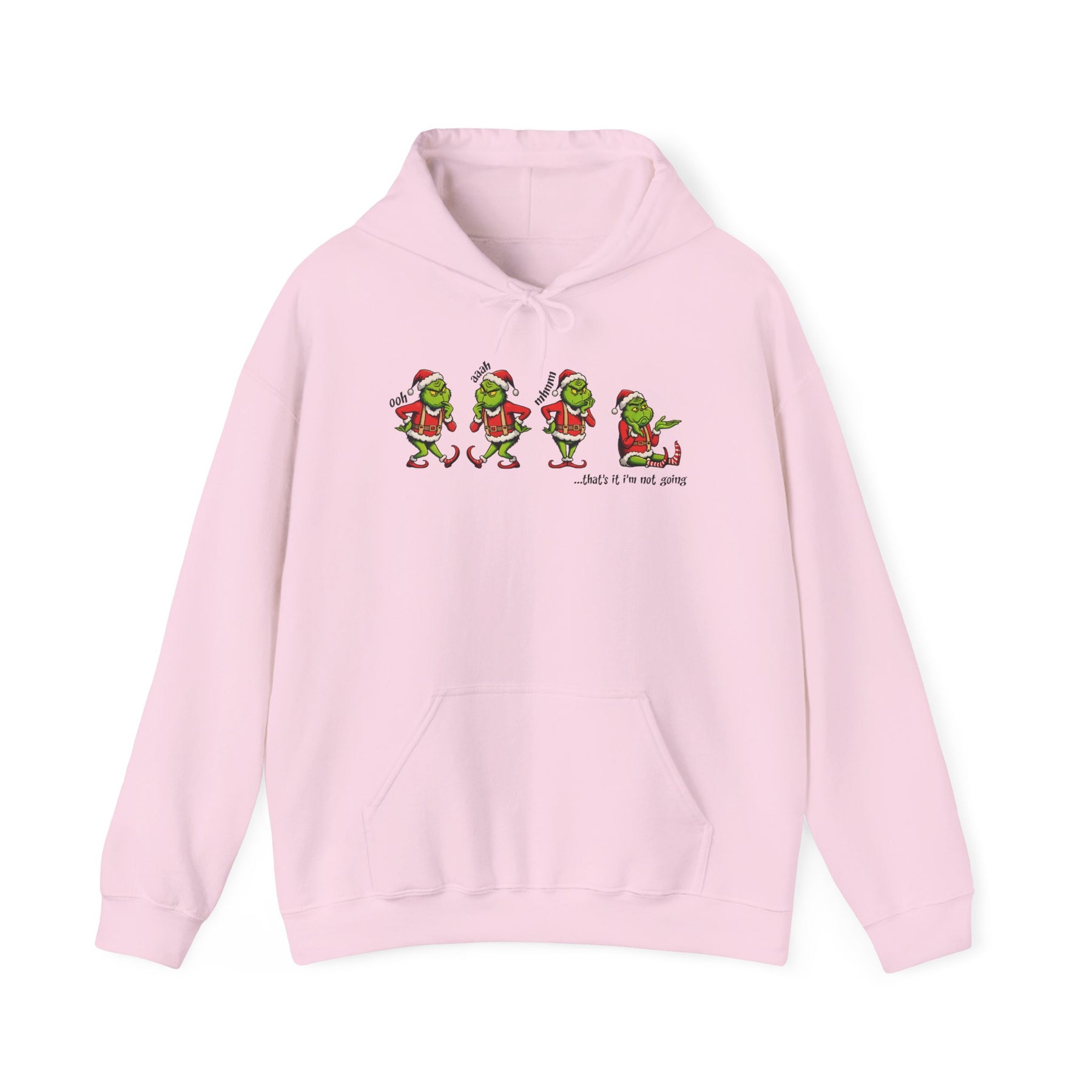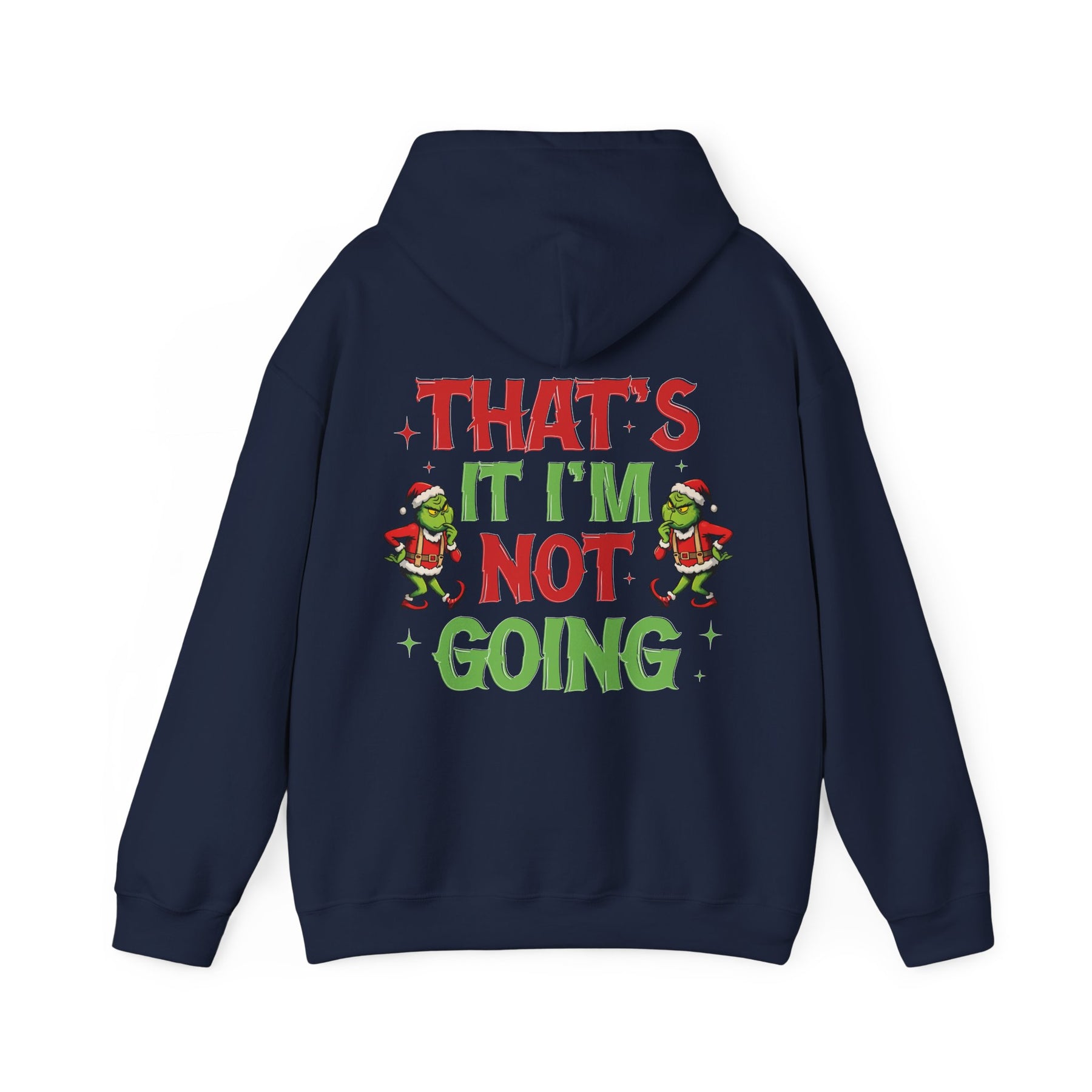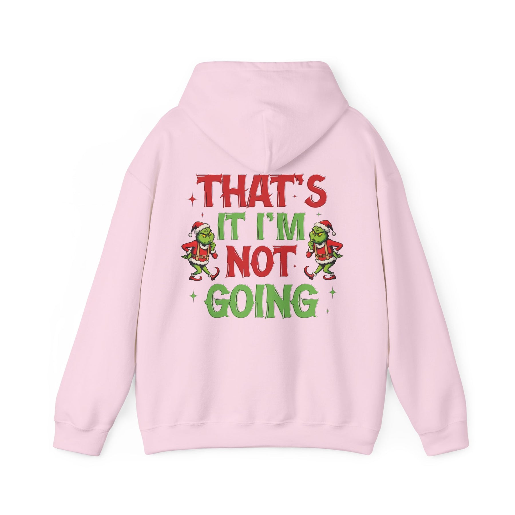 A unisex I'm Not Going Hoodie heavy blend hooded sweatshirt is relaxation itself. The material is a thick blend of cotton and polyester. This makes for a plush, soft feel alongside warmth. It's also a great surface for printing. There are no side seams. A spacious kangaroo pocket hangs in front. The hood's drawstring is the same color as the base sweater.