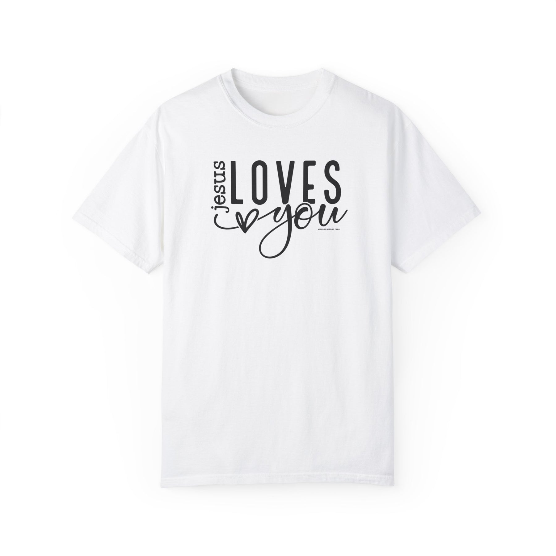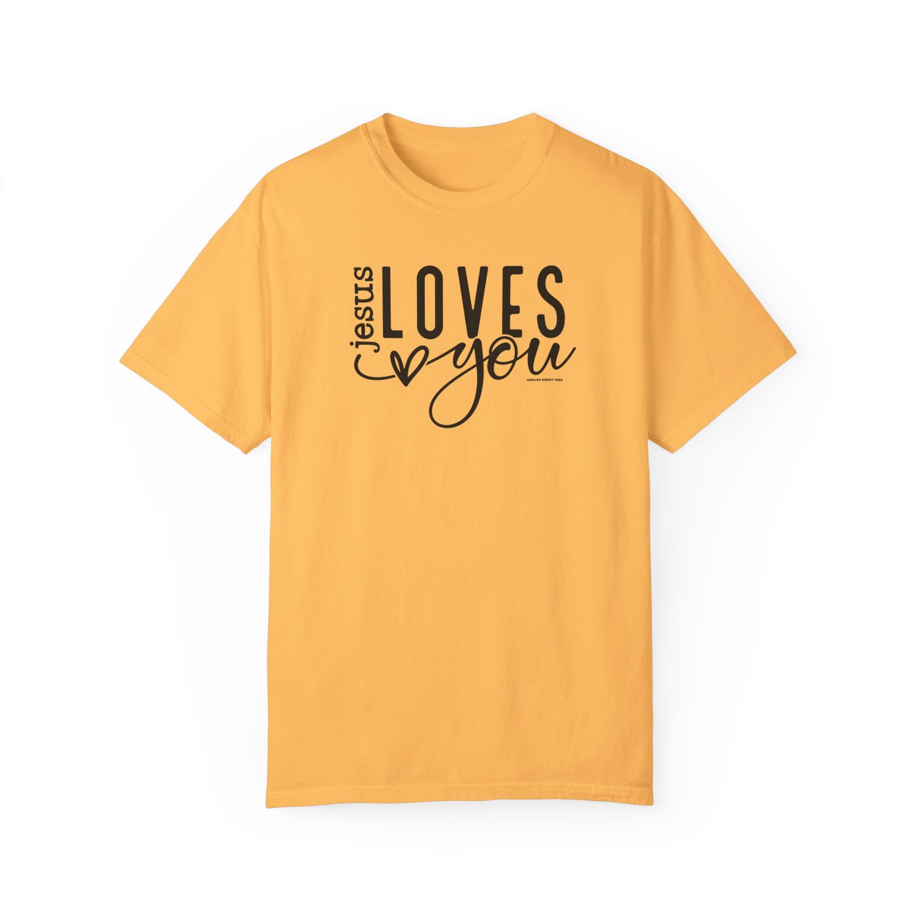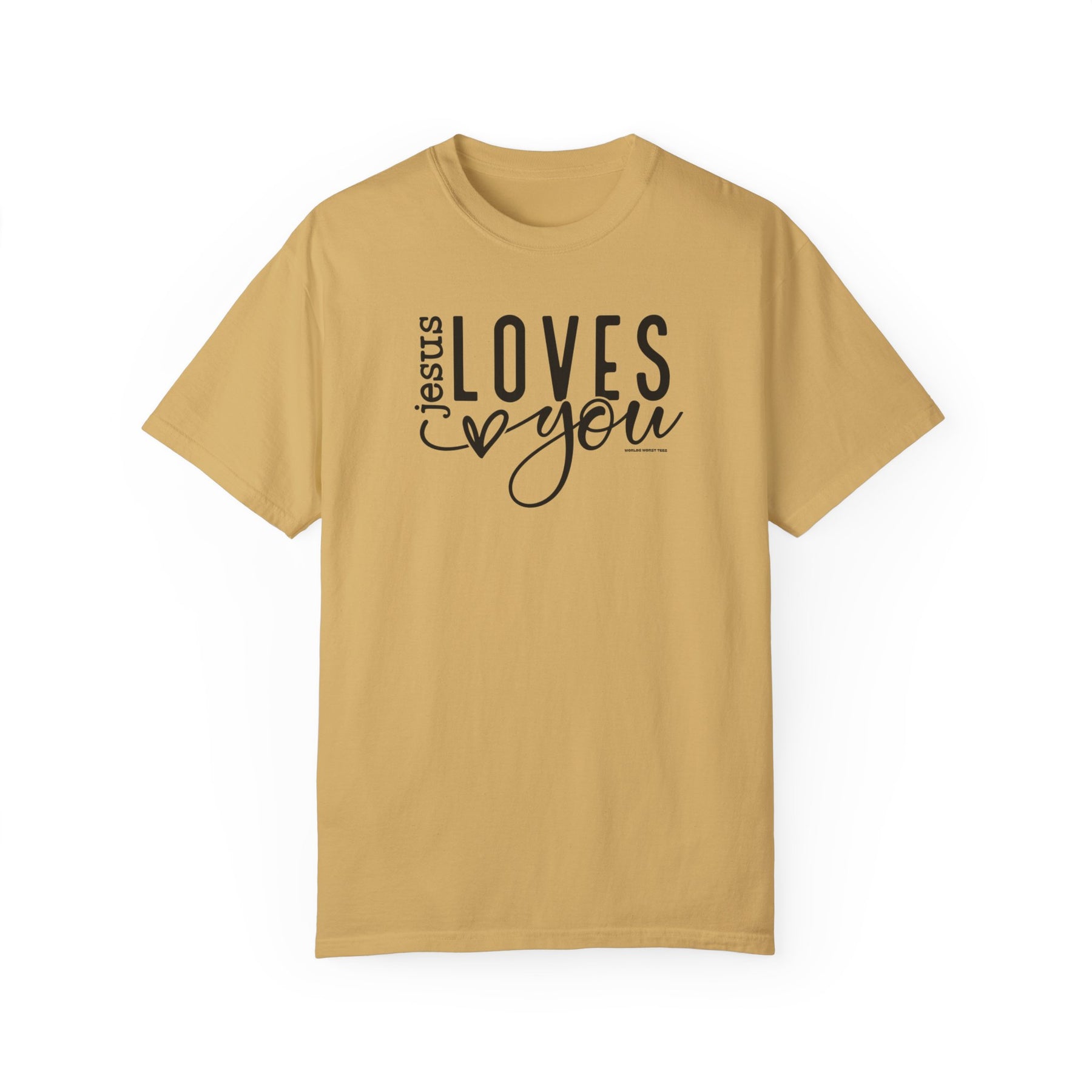 Relaxed fit Jesus Loves You Tee, 100% ring-spun cotton, garment-dyed for coziness. Durable double-needle stitching, seamless design for tubular shape retention. Medium weight, versatile wardrobe essential.