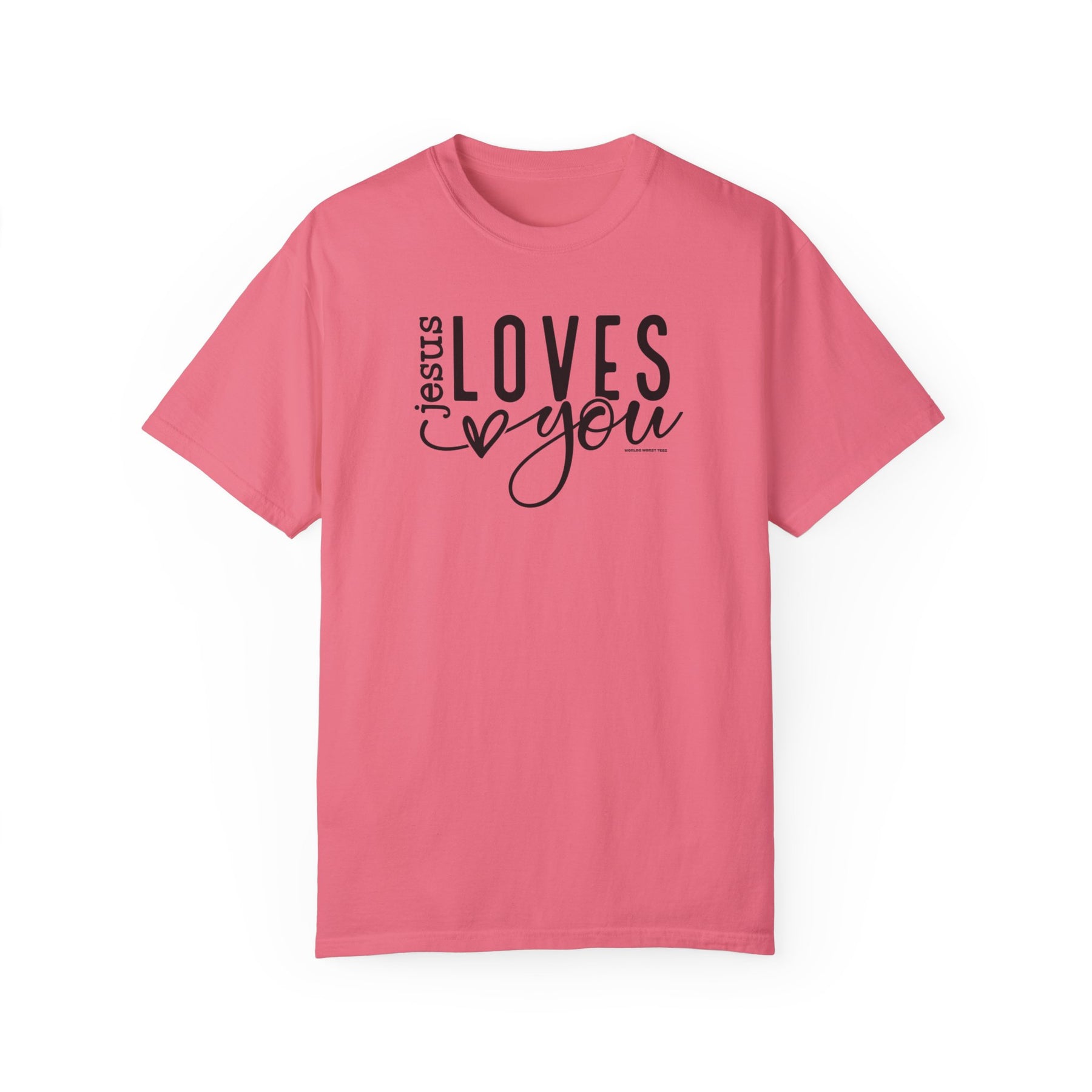Relaxed fit Jesus Loves You Tee in pink with black text. 100% ring-spun cotton, garment-dyed for coziness. Durable double-needle stitching, no side-seams for shape retention. Ideal for daily wear.