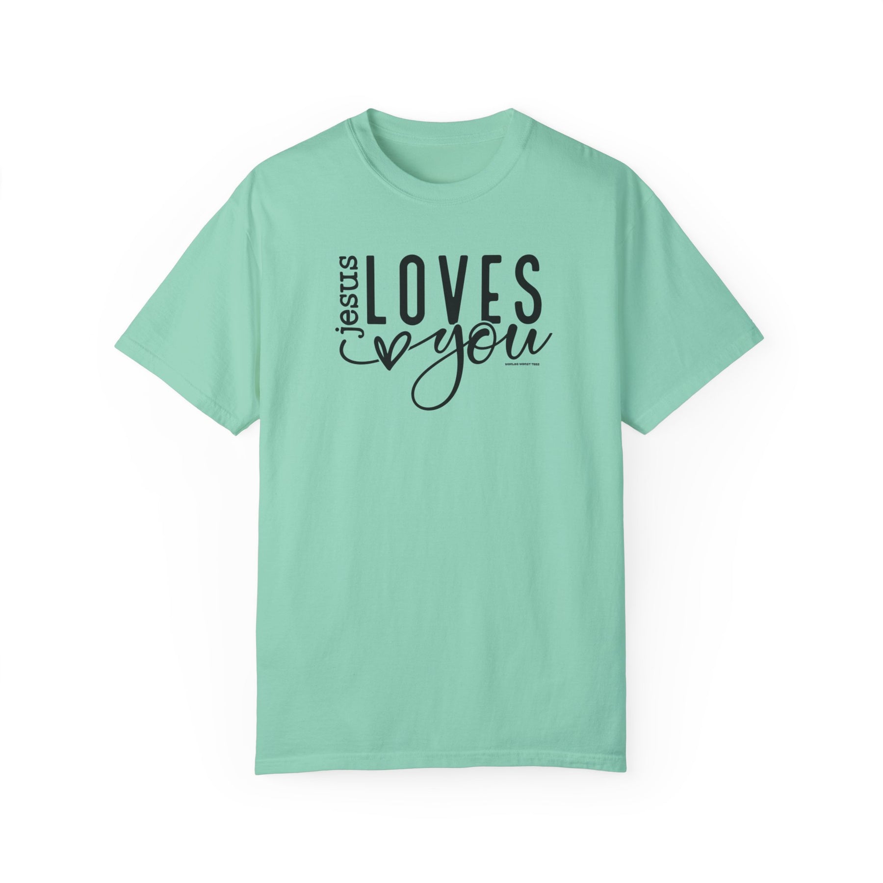Relaxed fit Jesus Loves You Tee, crafted from 100% ring-spun cotton. Garment-dyed for extra coziness, featuring durable double-needle stitching and a seamless design for a tubular shape.