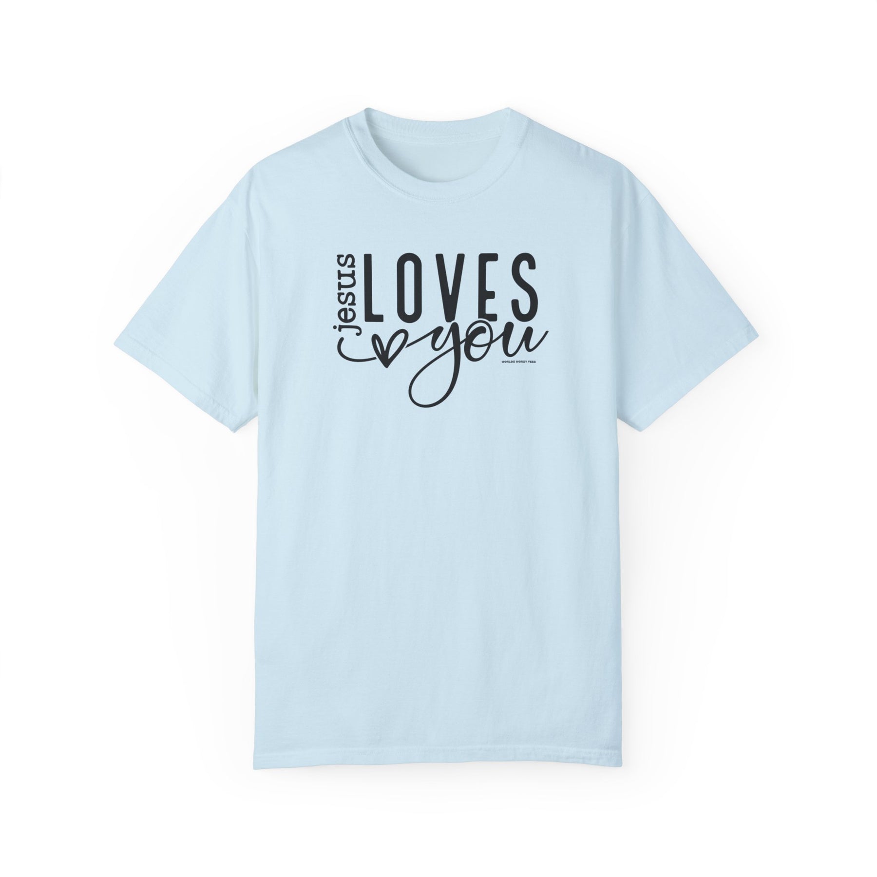 A relaxed-fit Jesus Loves You Tee in light blue, made of 100% ring-spun cotton. Garment-dyed for coziness, with double-needle stitching for durability. Perfect for daily wear.