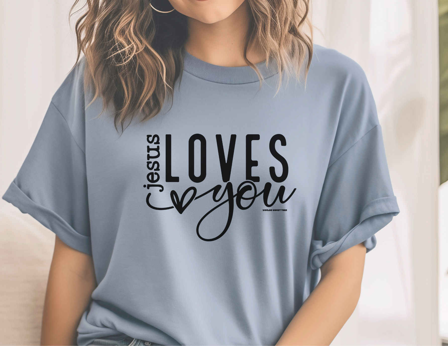 A relaxed fit Jesus Loves You Tee made of 100% ring-spun cotton. Garment-dyed for extra coziness, double-needle stitching for durability, and no side-seams for a tubular shape. From Worlds Worst Tees.