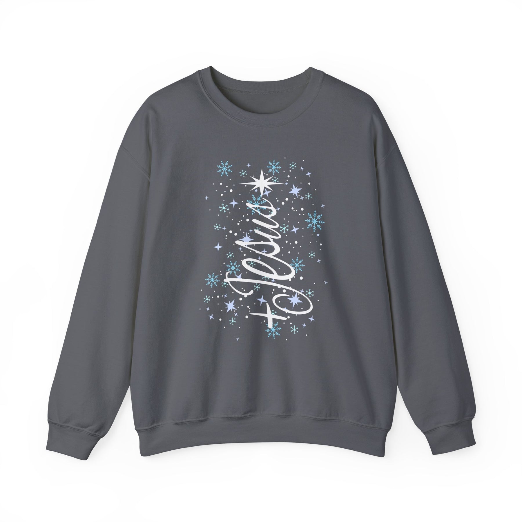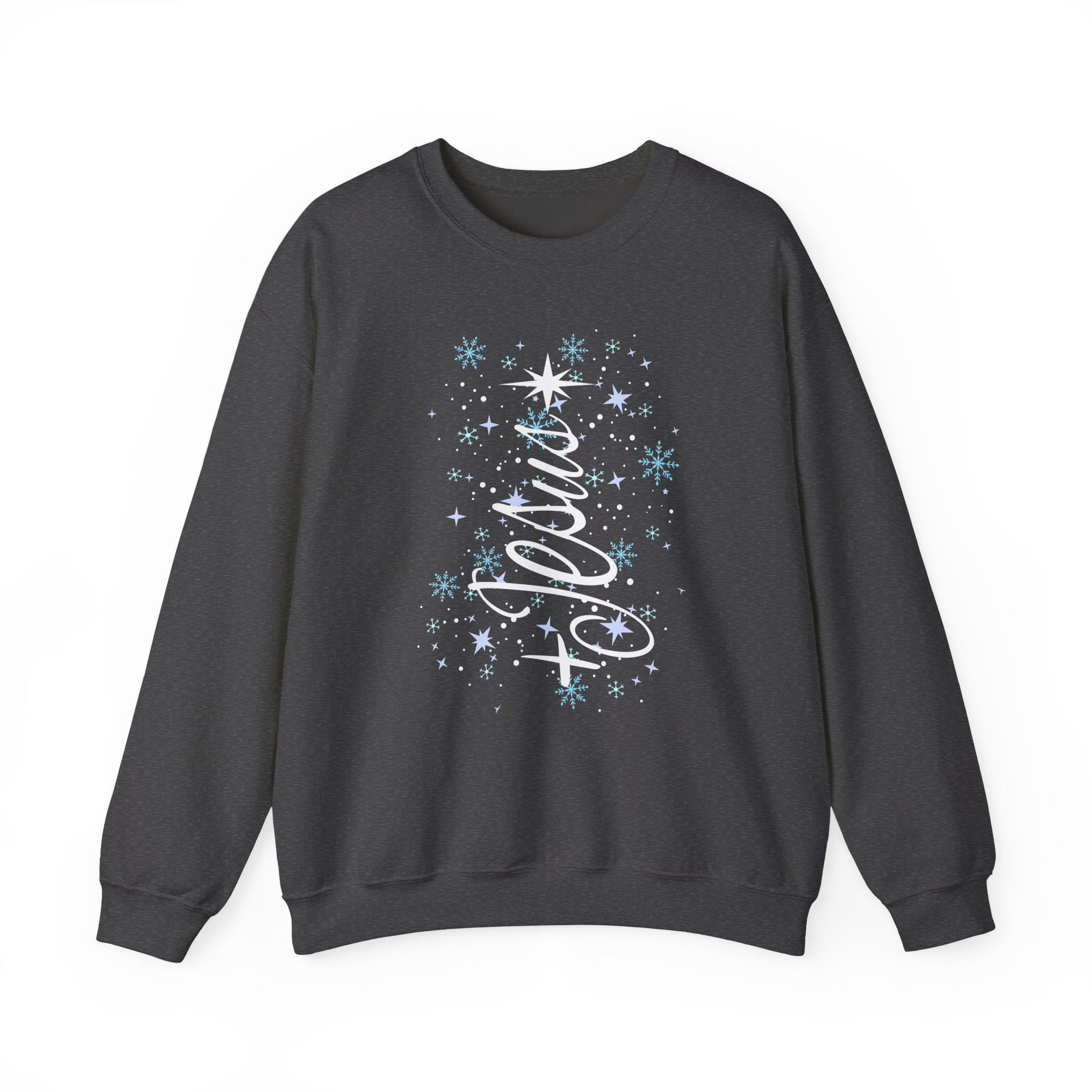 Charcoal-gray crewneck sweatshirt with Jesus Tree Crew design featuring snowflakes and stars, ideal for winter. Comfortable, durable, and ethically produced by Faith Family Designs.