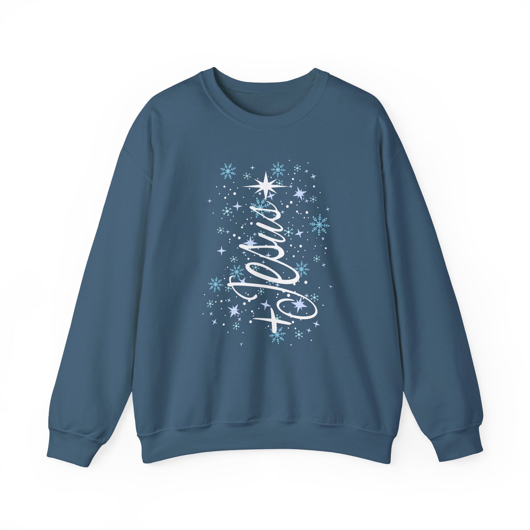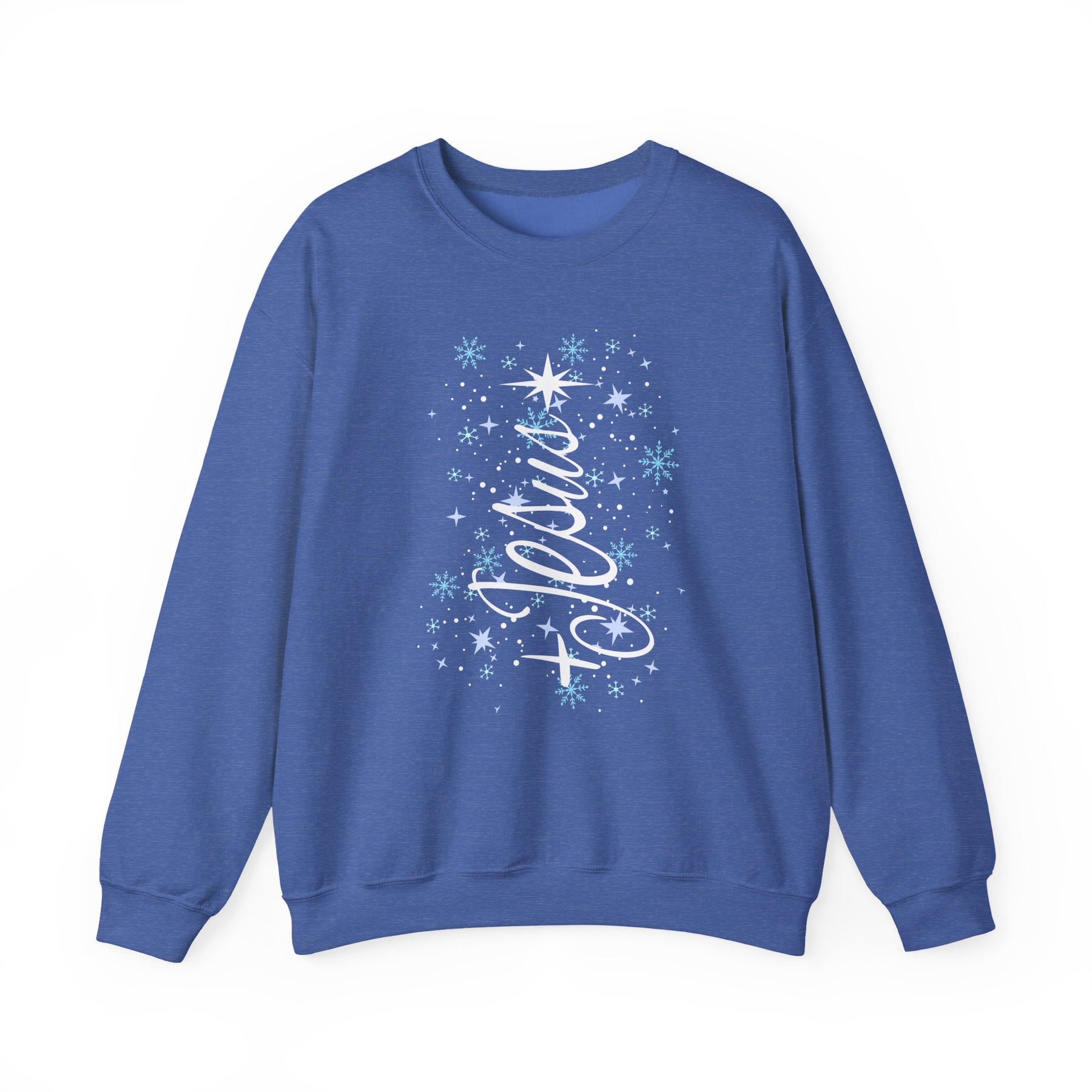 Blue crew-neck sweatshirt with Believe in cursive, adorned with stars and snowflakes, embodying festive spirit. Durable, cozy blend for cold weather. Jesus Tree Crew design.