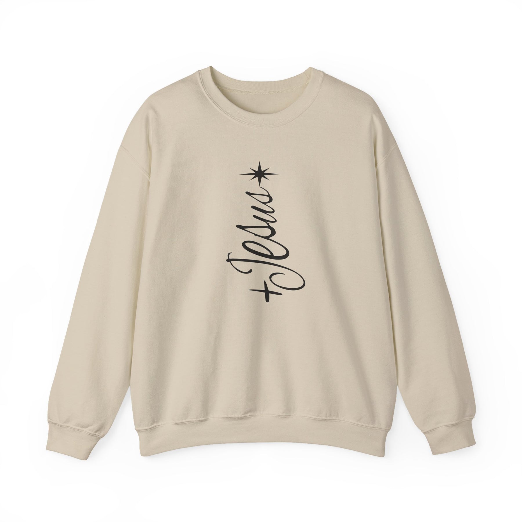 Light-tan crewneck sweatshirt with a vertical black script + Jesus and an eight-pointed star, designed for comfort and style.