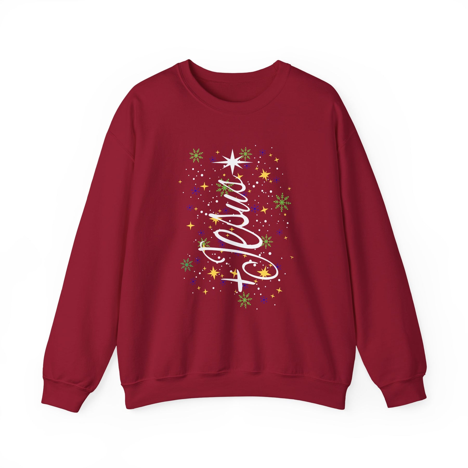 Maroon crewneck sweatshirt featuring Jesus script forming a Christmas tree with festive stars and snowflakes. Cozy, durable, ideal for cold weather.