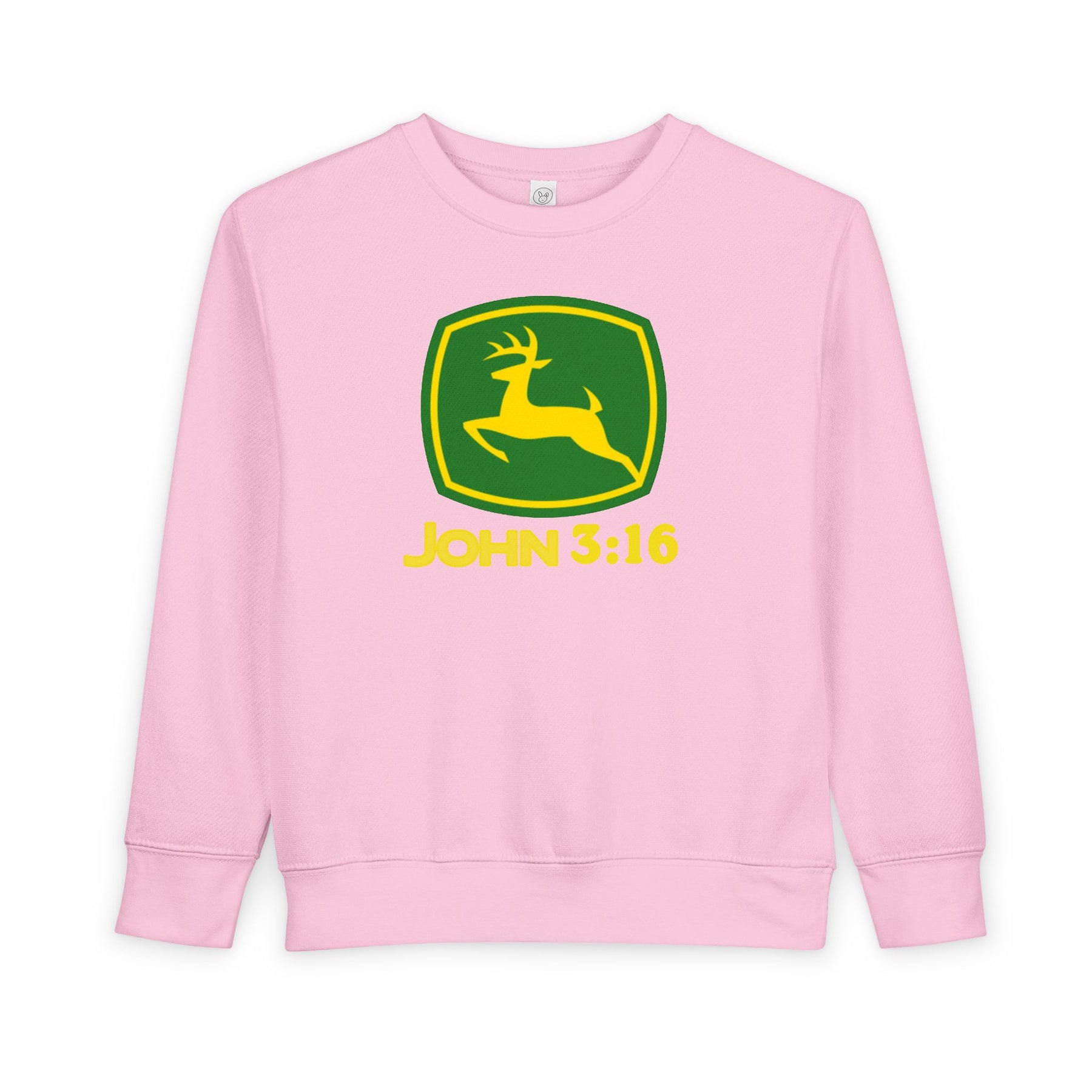 Light-pink toddler crewneck sweatshirt with a spoof John Deere logo, featuring a yellow deer and John 3:16 text, offering warmth and comfort.