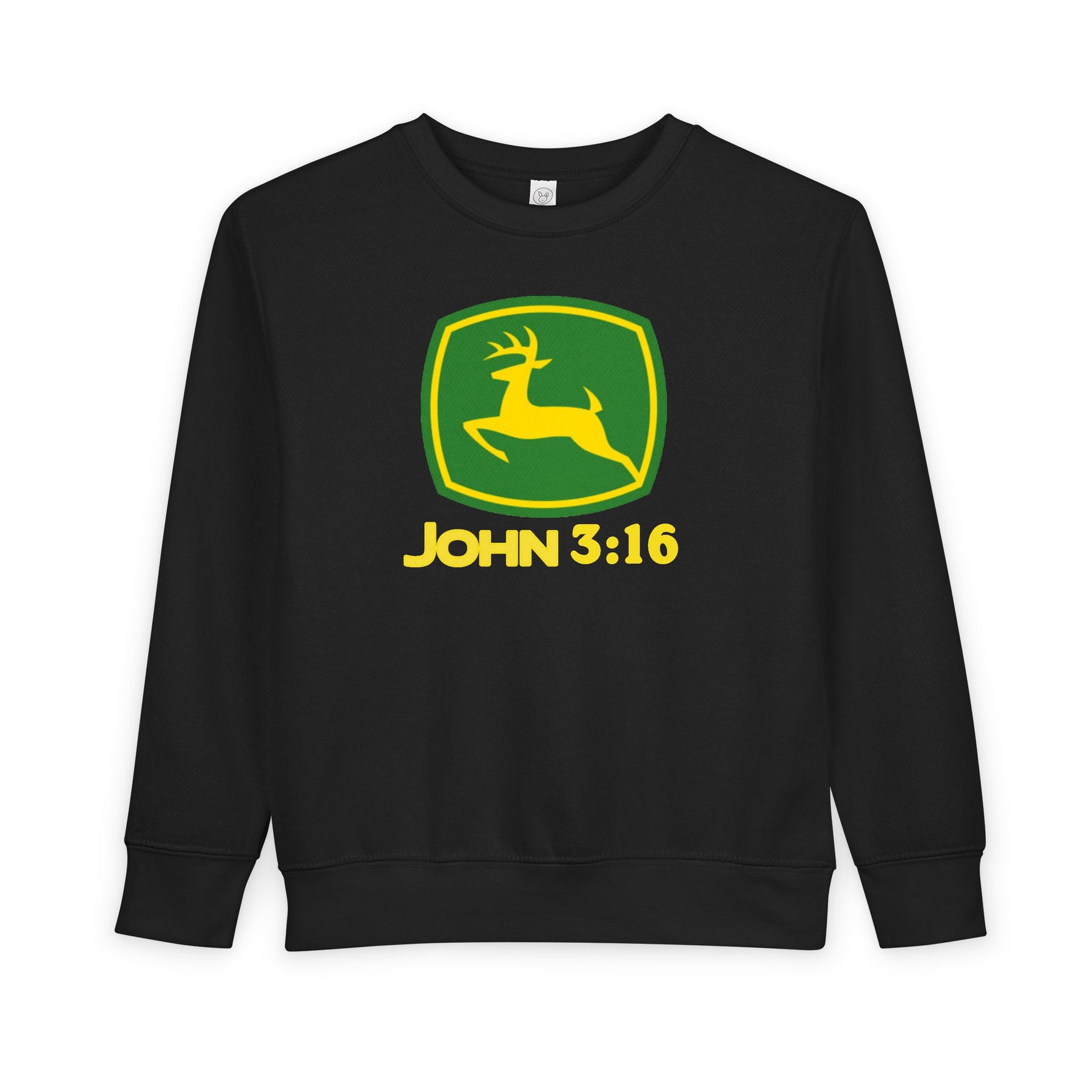 Black crewneck sweatshirt for toddlers with a humorous John Deere logo parody, featuring John 3:16 text, offering warmth and comfort with durable stitching.