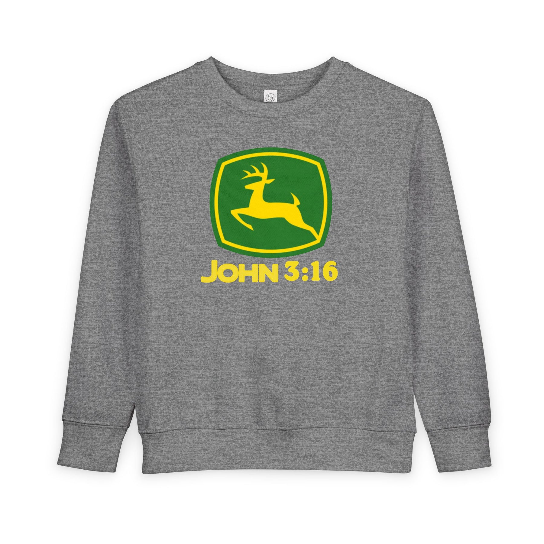 Heather-gray toddler sweatshirt with a parody John Deere logo, featuring John 3:16 text, designed for warmth and durability from a cotton-polyester blend.