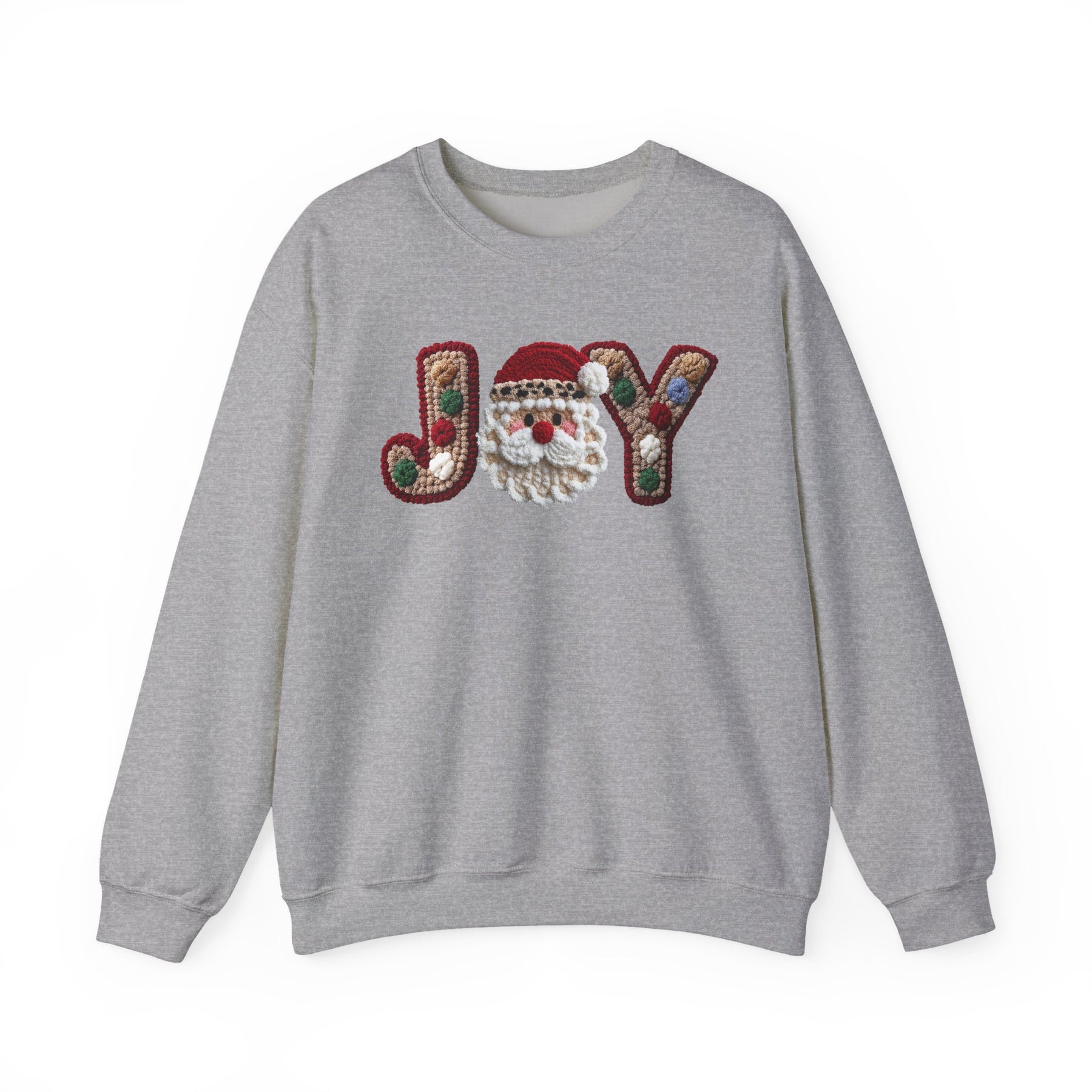 Light-heather gray crewneck sweatshirt with JOY appliqué, featuring multicolored knit letters and a Santa-face motif, offering a relaxed, unisex fit.