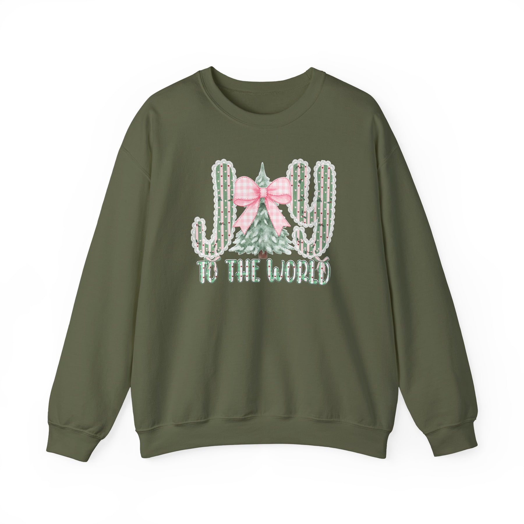 Joy to the World Crew sweatshirt features an olive green color with a holiday motif spelling “JOY” using cacti and a Christmas tree graphic.