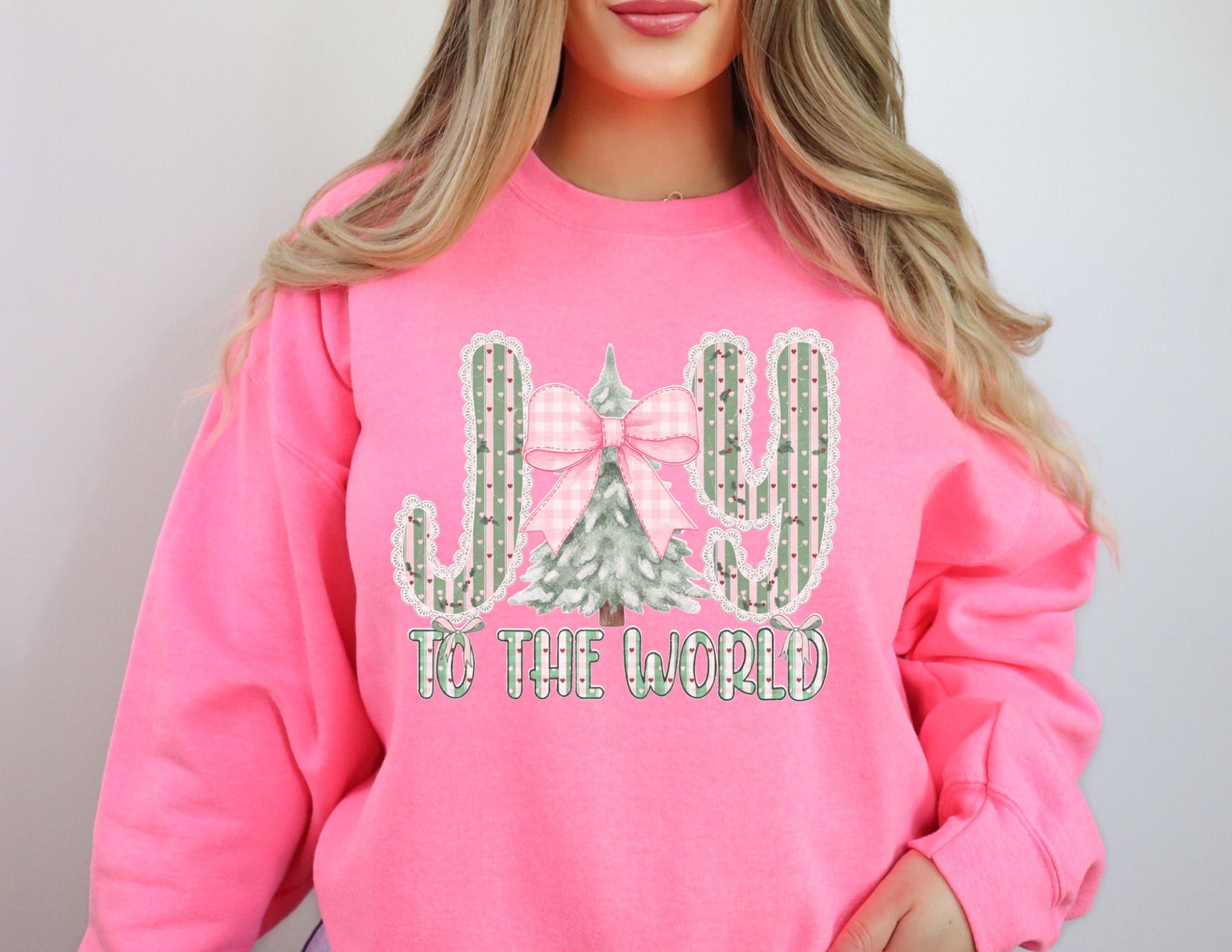 Pink crew-neck sweatshirt with JOY holiday graphic featuring cacti and a Christmas tree, text TO THE WORLD, from Faith Family Designs' Joy to the World Crew collection.