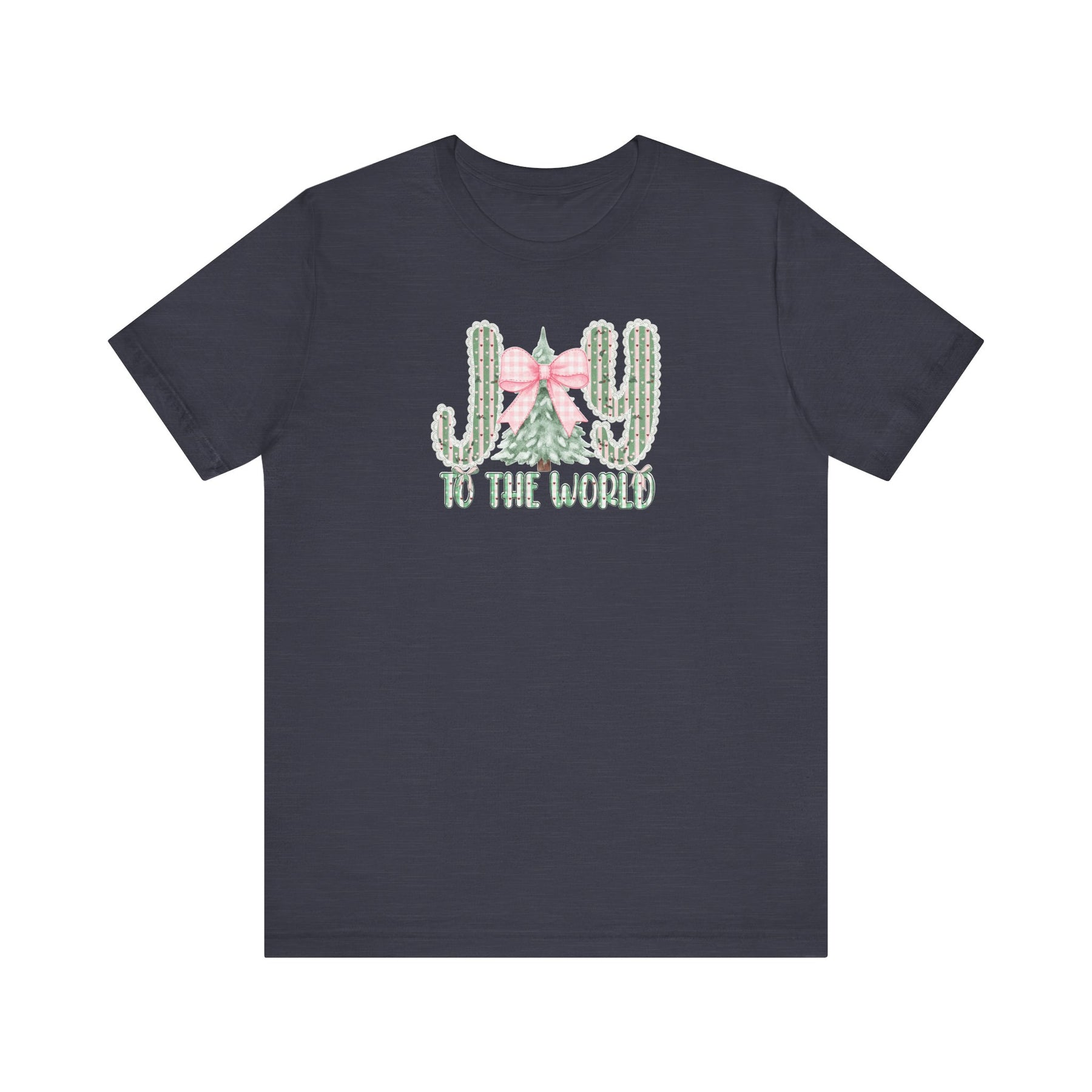 Joy to the World Tee: Dark-navy T-shirt featuring JOY with cacti and Christmas tree graphic, pink gingham bow, and TO THE WORLD text. Soft, unisex fit.
