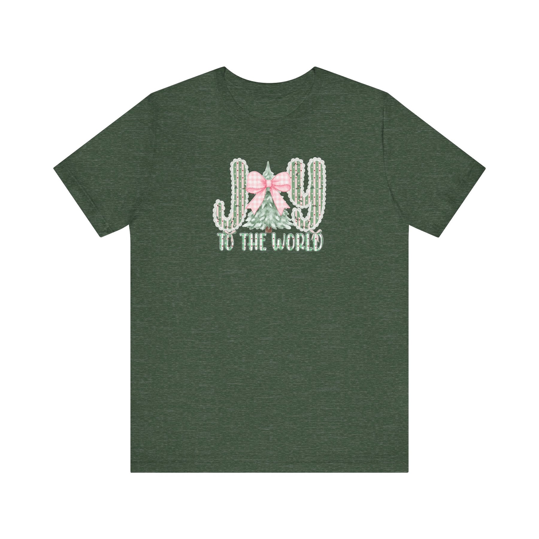 Joy to the World Tee: Festive dark-green T-shirt featuring JOY with cacti and pine tree graphic, pink gingham bow, and TO THE WORLD lettering. Classic fit, soft cotton.