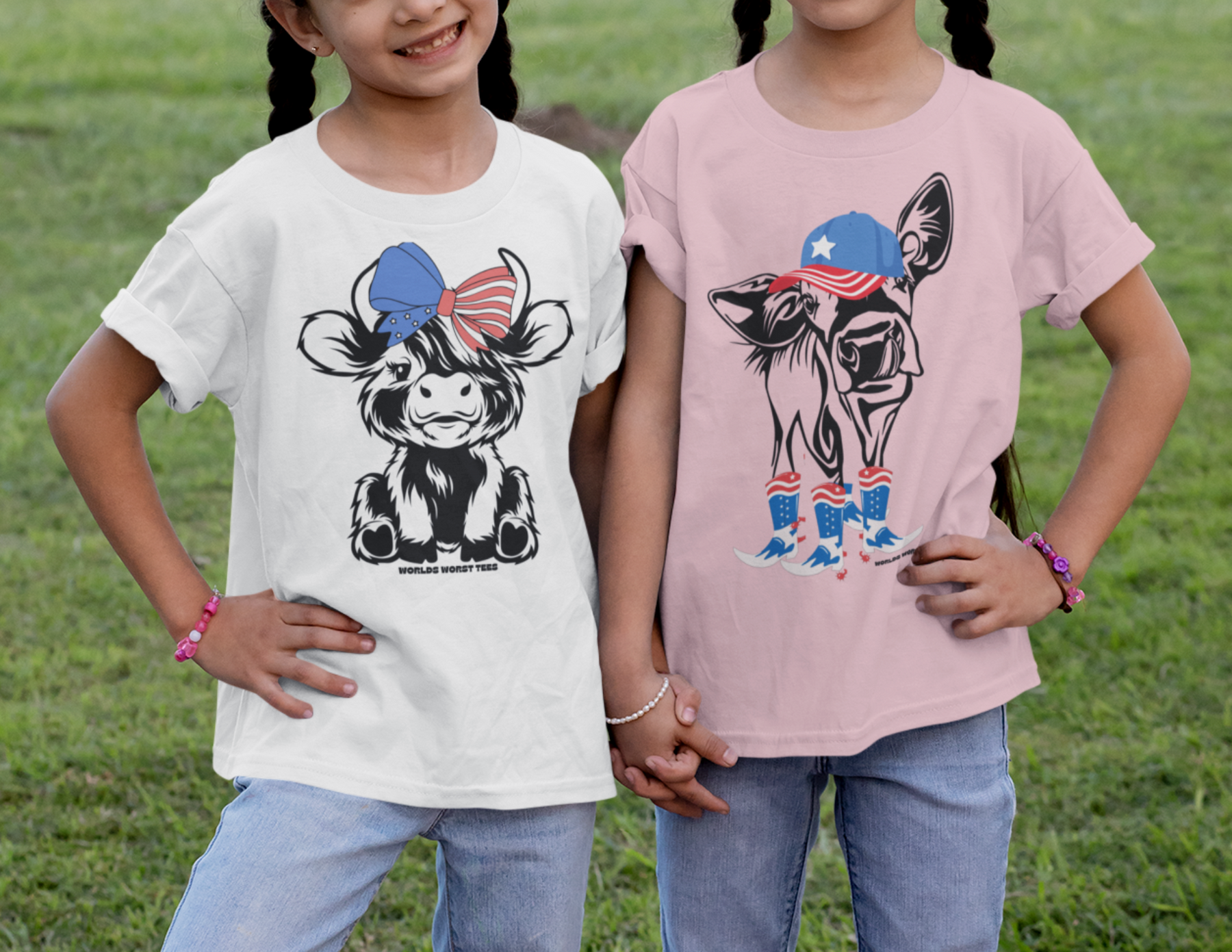 Celebrate the 4th of July in style with the 4th of July Family Cowgirl Kids Tee from Worlds Worst Tees. This adorable tee is perfect for your little cowgirl to wear during Independence Day festivities. Made from high-quality material, this tee is comfortable and durable for all-day wear. Available in sizes XS to XL there is a perfect option for every little girl. The unique design and patriotic theme make this tee a must-have for your little one this summer. Don't miss out on the 4th of July Family Little Miss Cow Kids Tee!
