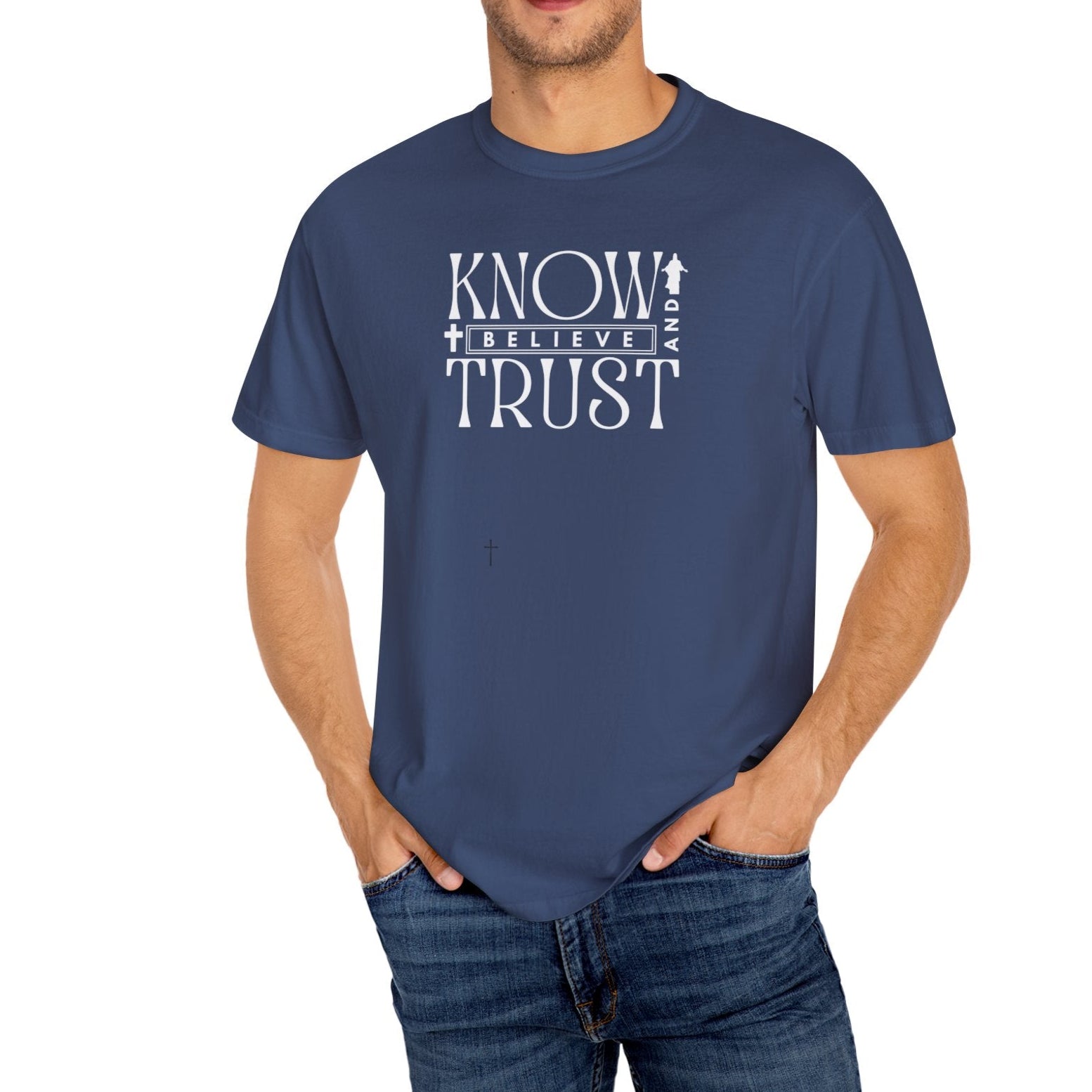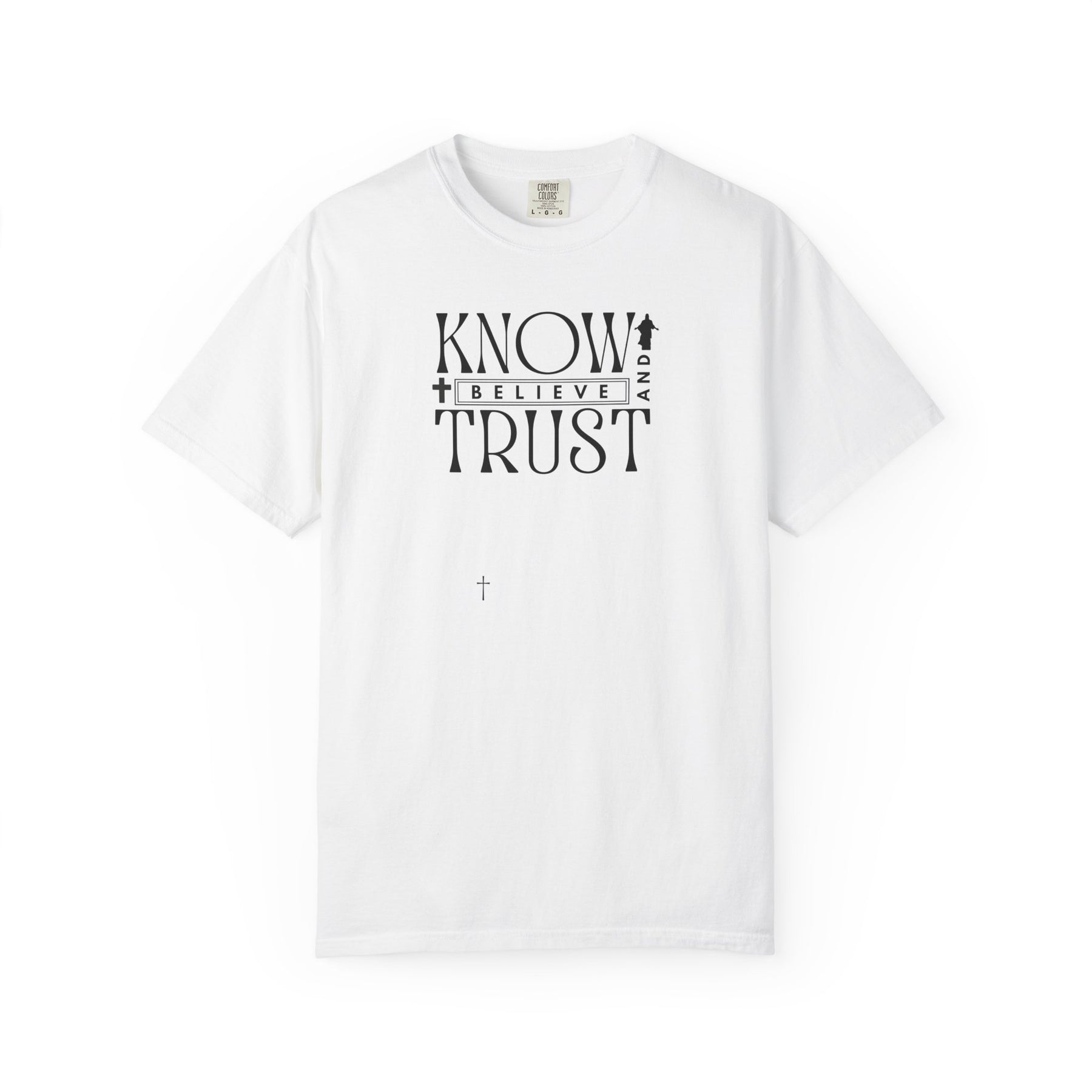 Know, Trust, Believe Tee: A white, durable, garment-dyed t-shirt with black text, offering a relaxed fit and customizable design, ideal for everyday wear.