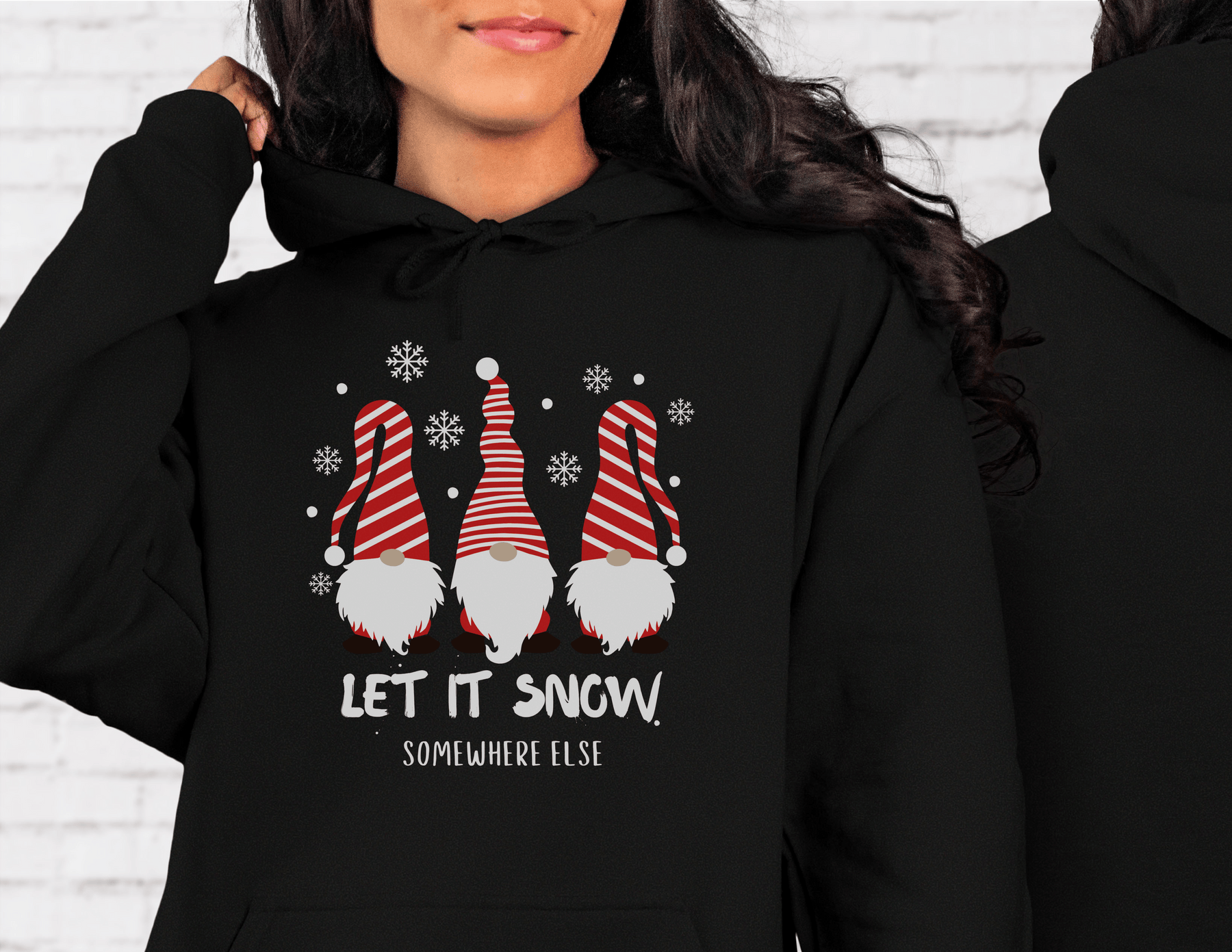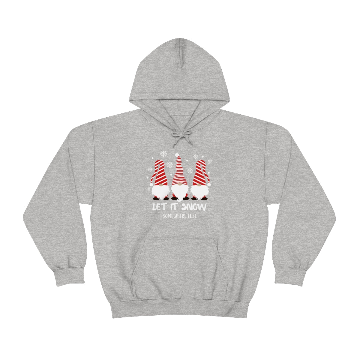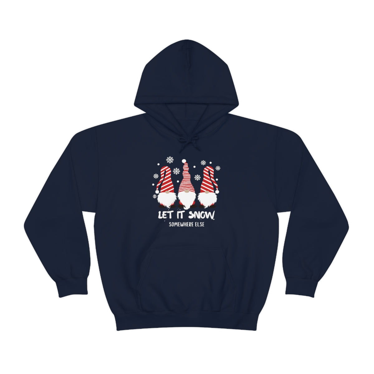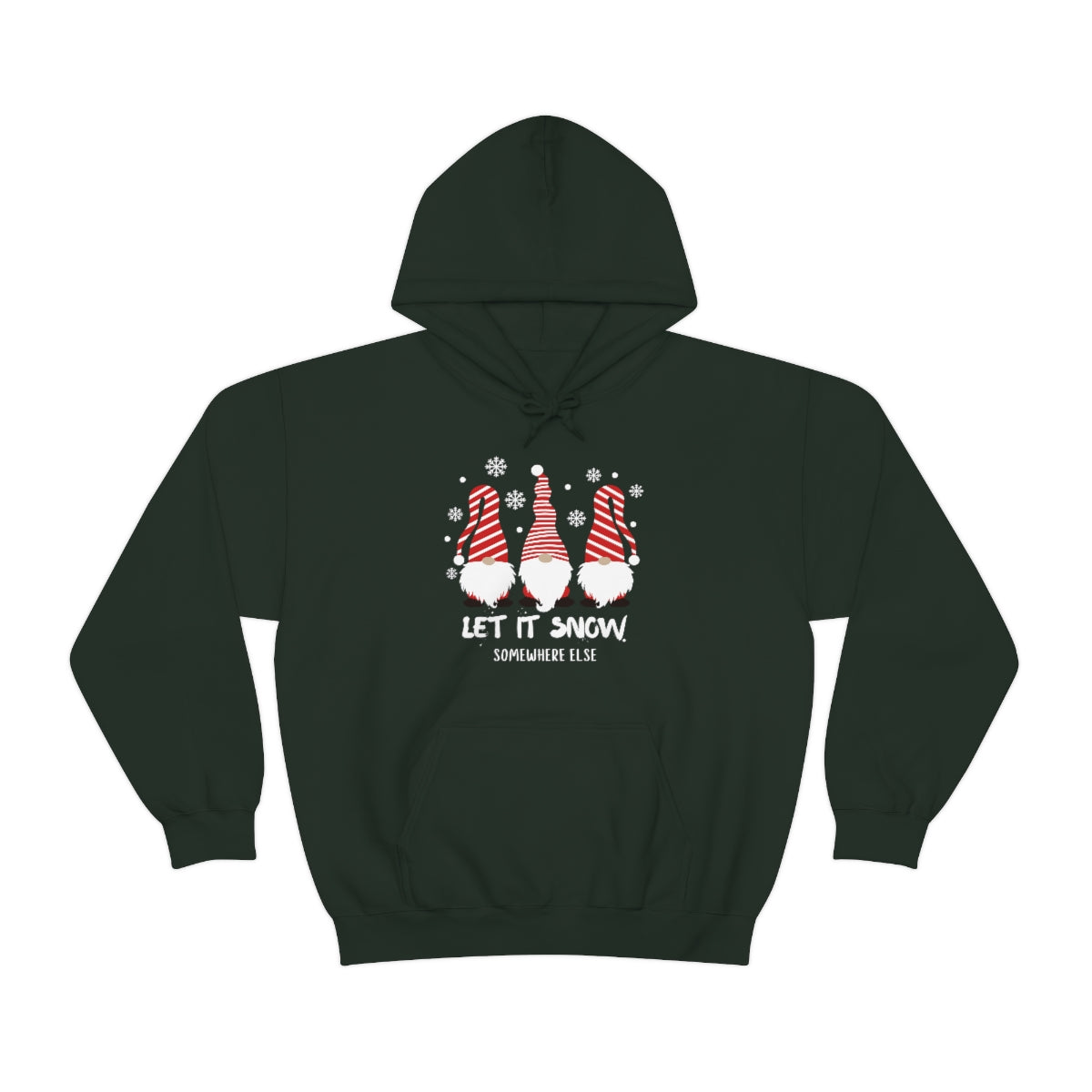 A cozy Let it Snow Somewhere Else Hoodie, a blend of cotton and polyester, with a kangaroo pocket and drawstring hood. Unisex, heavy fabric, tear-away label, classic fit.