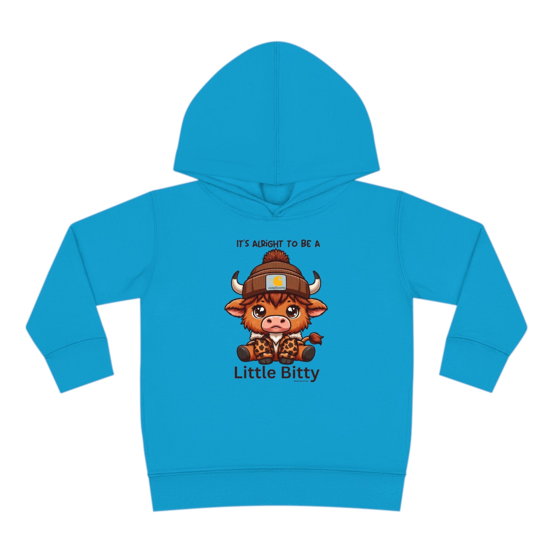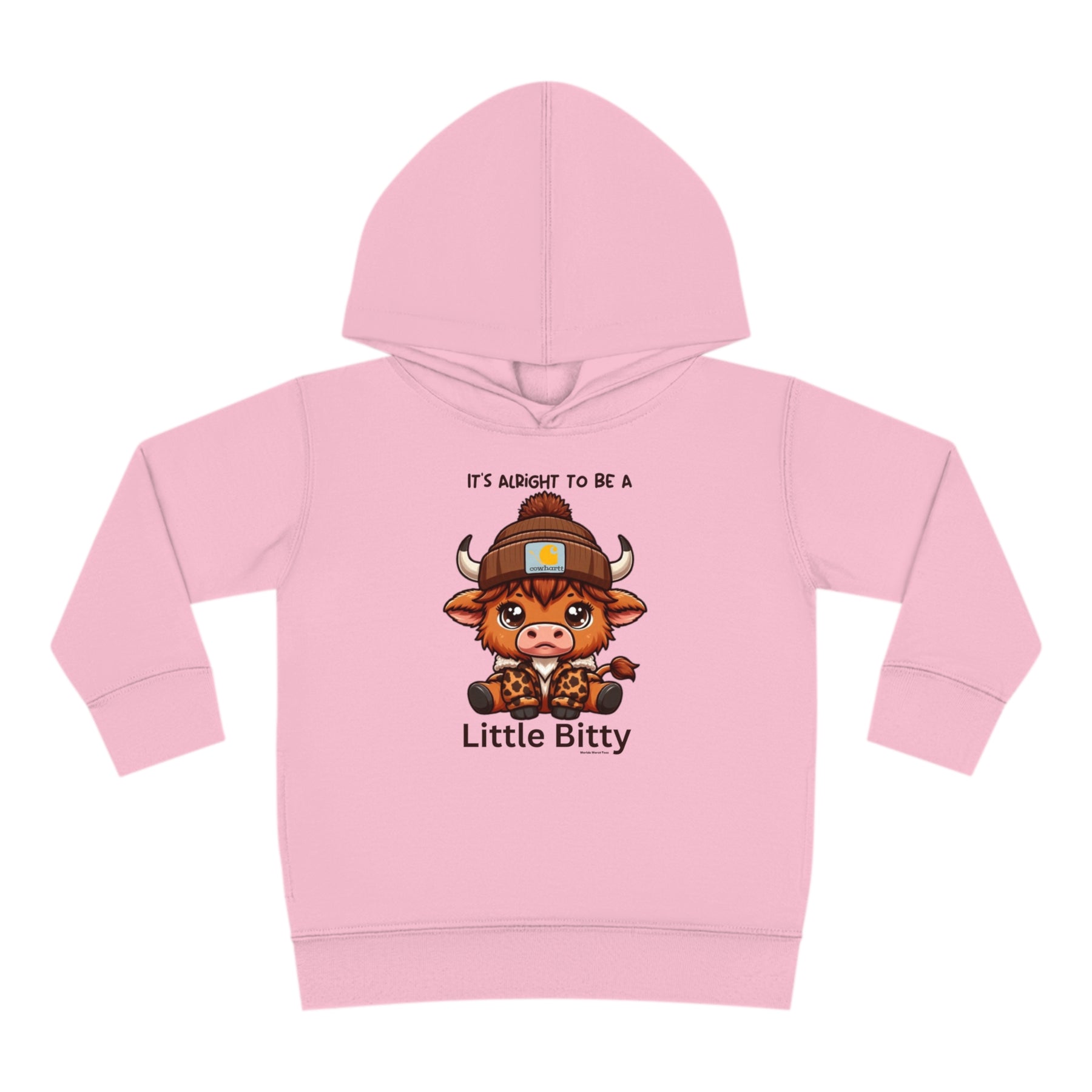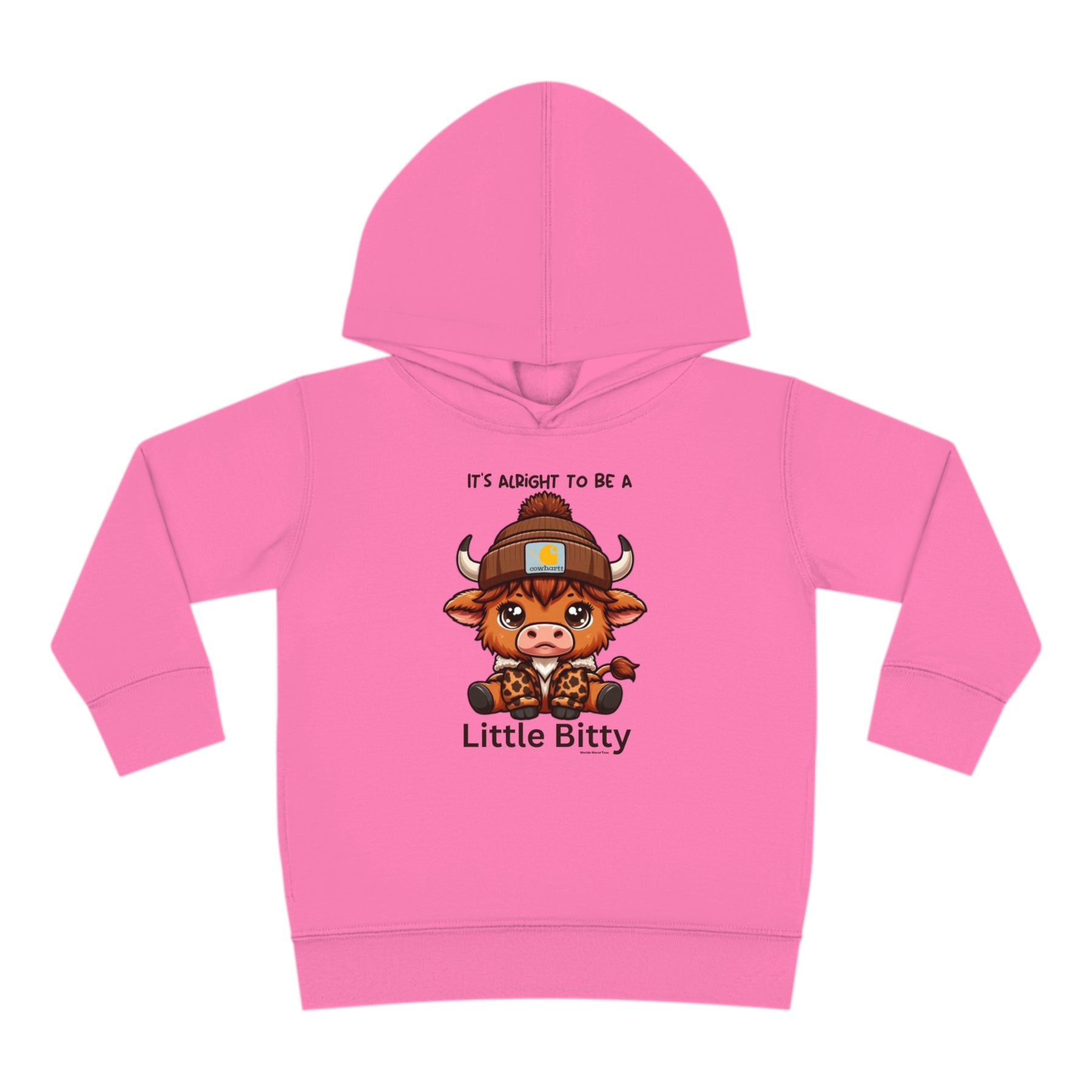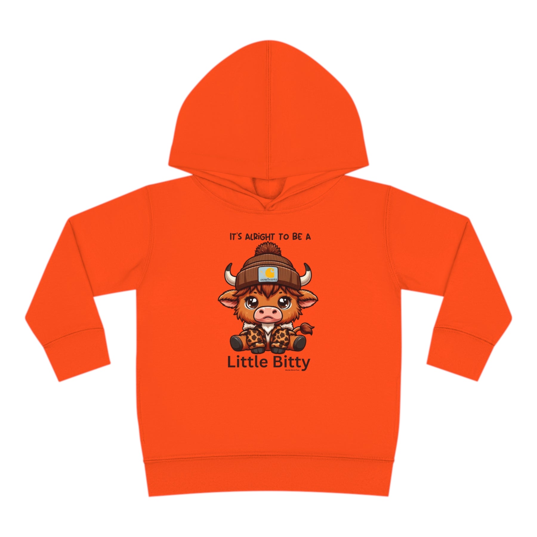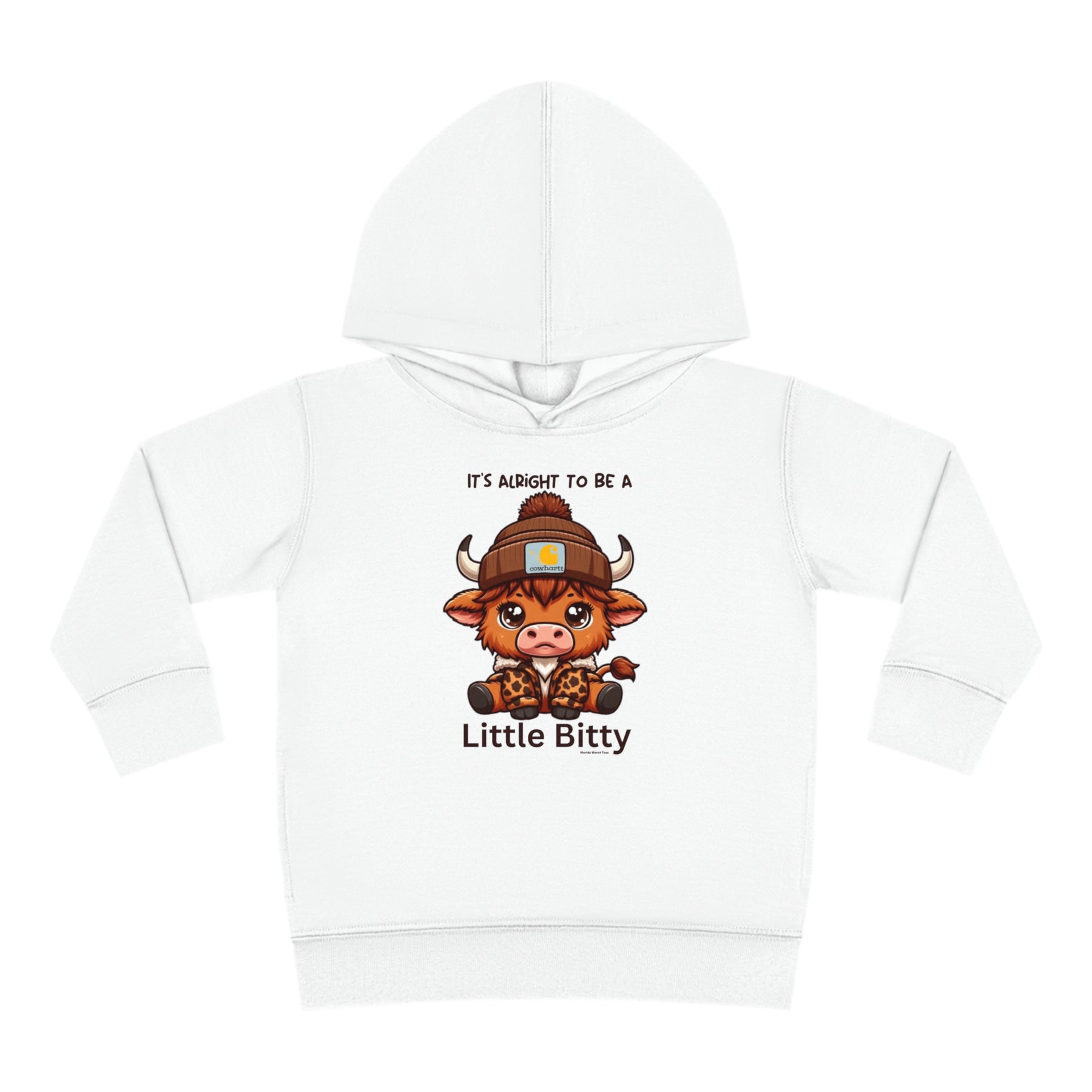 Little Bitty Toddler Hoodie featuring a cartoon cow design, durable construction with jersey-lined hood, cover-stitched details, and side seam pockets for cozy wear. Ideal for kids aged 2-6.
